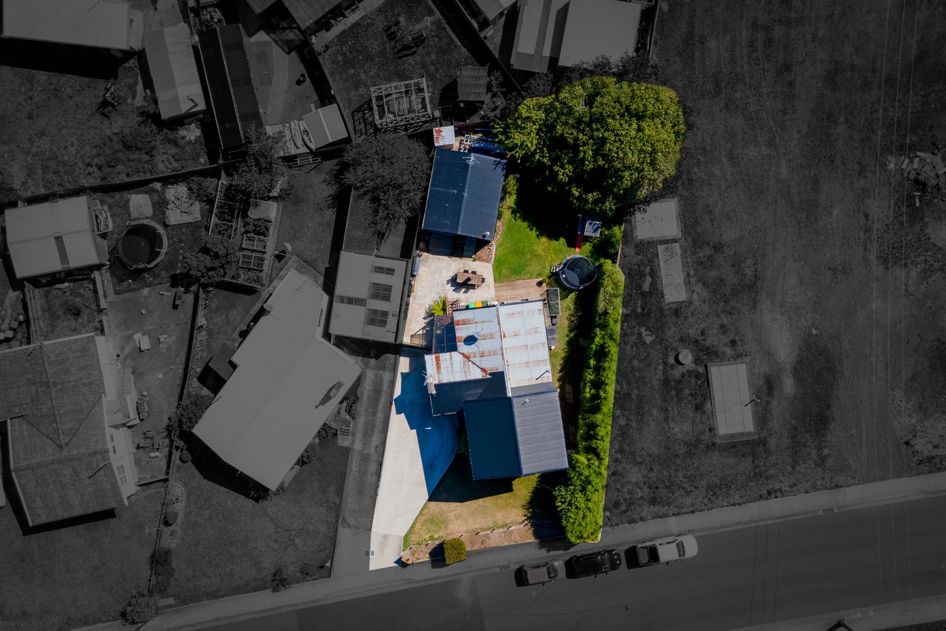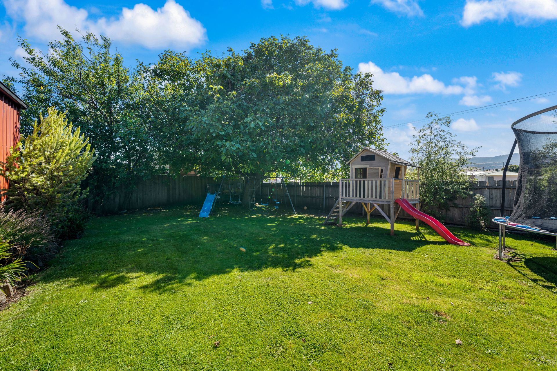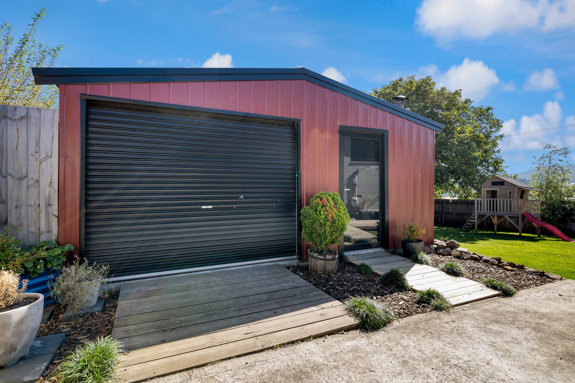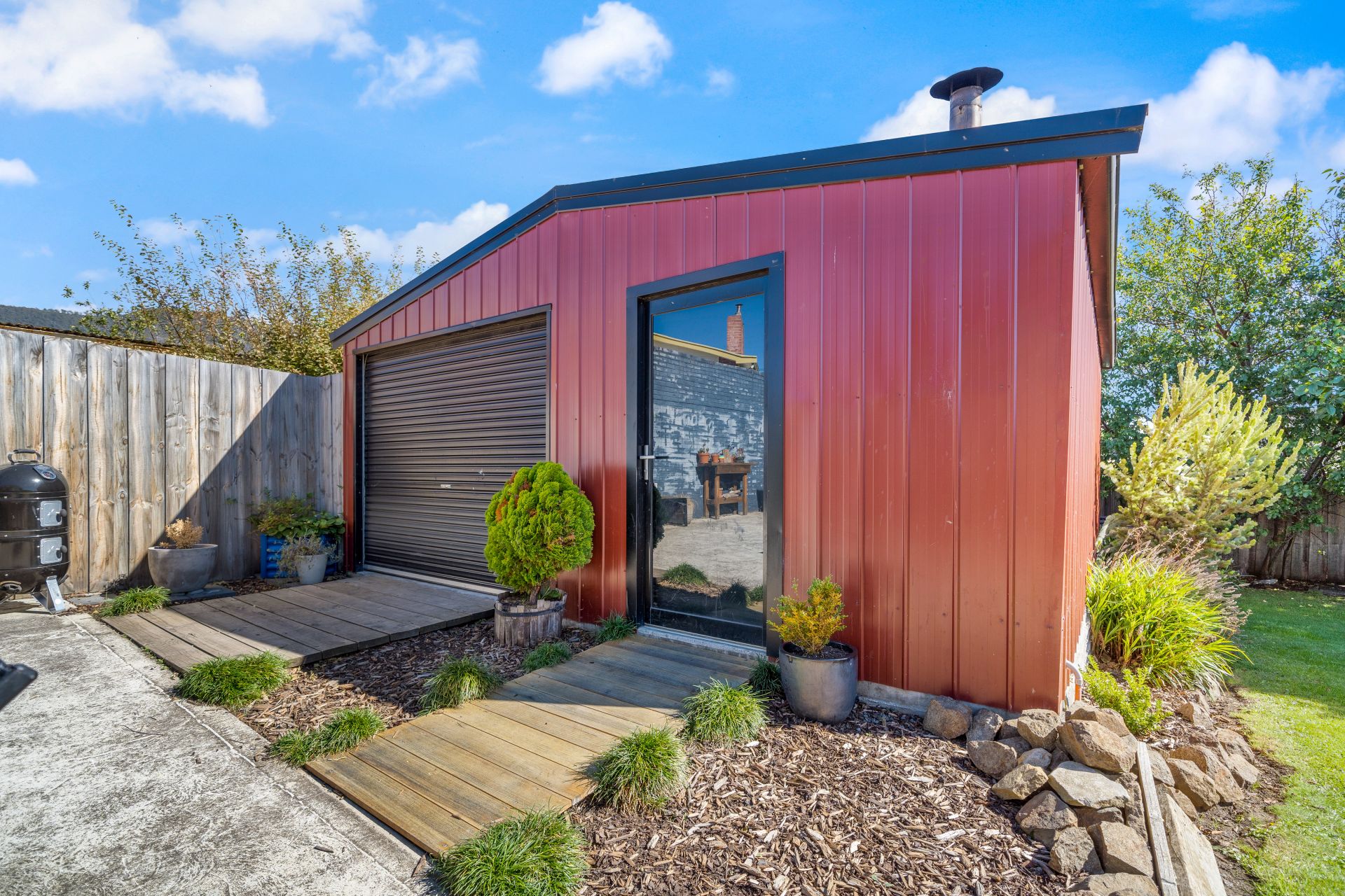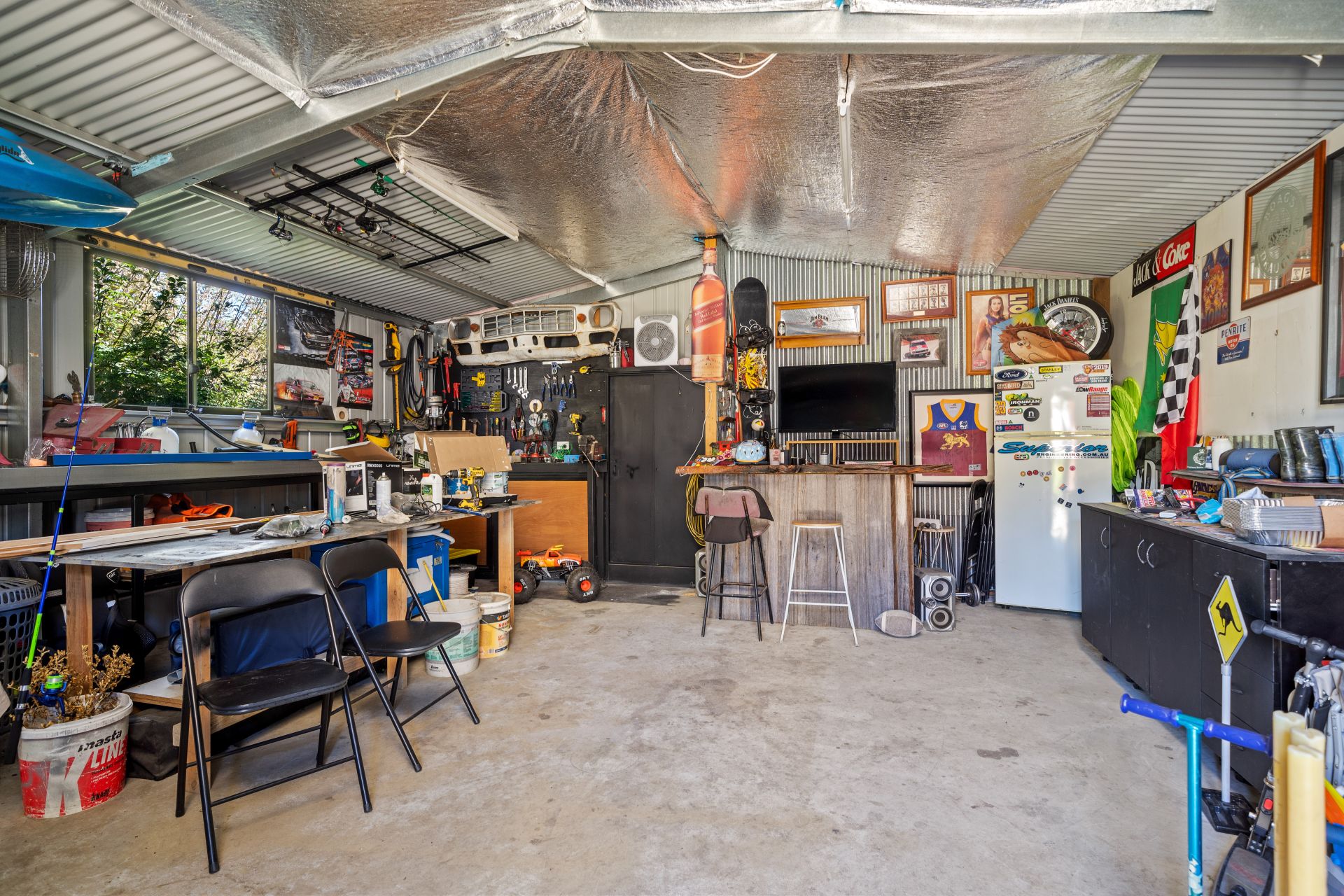 Heading outside, there is a covered porch accessed from the dining area and that leads to the yard space. Full fenced and flat, there is plenty of room for pets and kids to run around safely. An array of mature trees keeps the area shaded and private. The large garage provides plenty of space for a workshop and is currently set up with a bar and relaxation area, there is also a woodheater for entertaining in the cooler months!