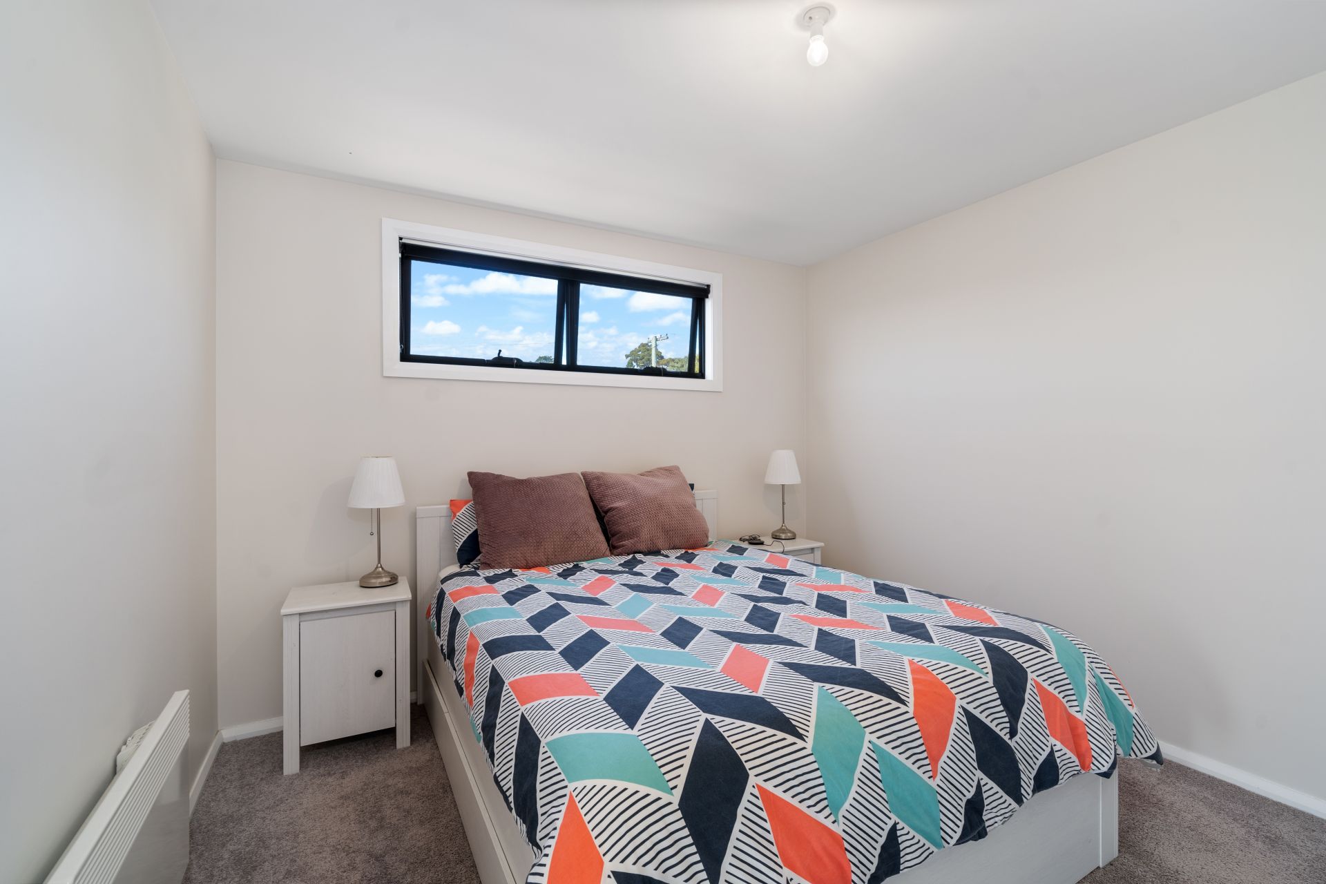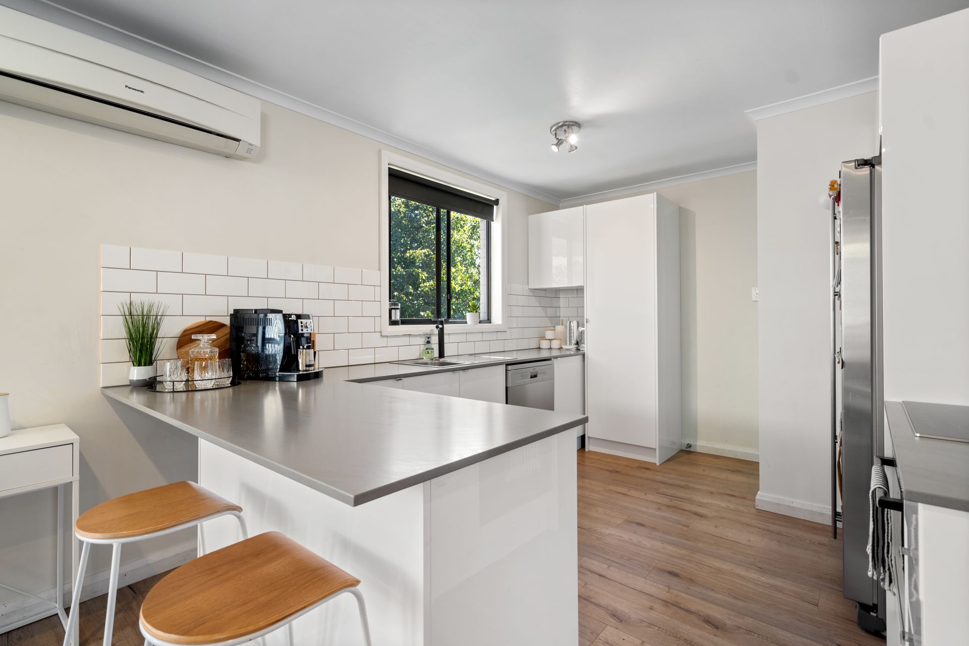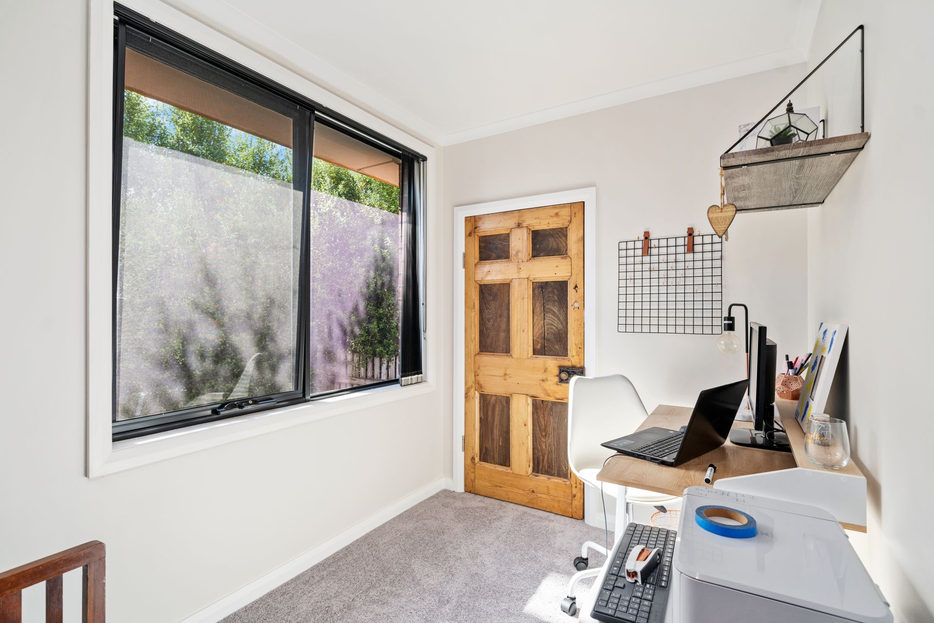 The main floor showcases two bedrooms with wardrobes, a separate home office, large family bathroom fitted out in crisp white tones, spacious lounge room with double aspect windows for maximum light, dining area and modern kitchen with breakfast bar, induction cooktop and plenty of storage. A reverse cycle split system combined with panel heater ensures optimum comfort year round.
