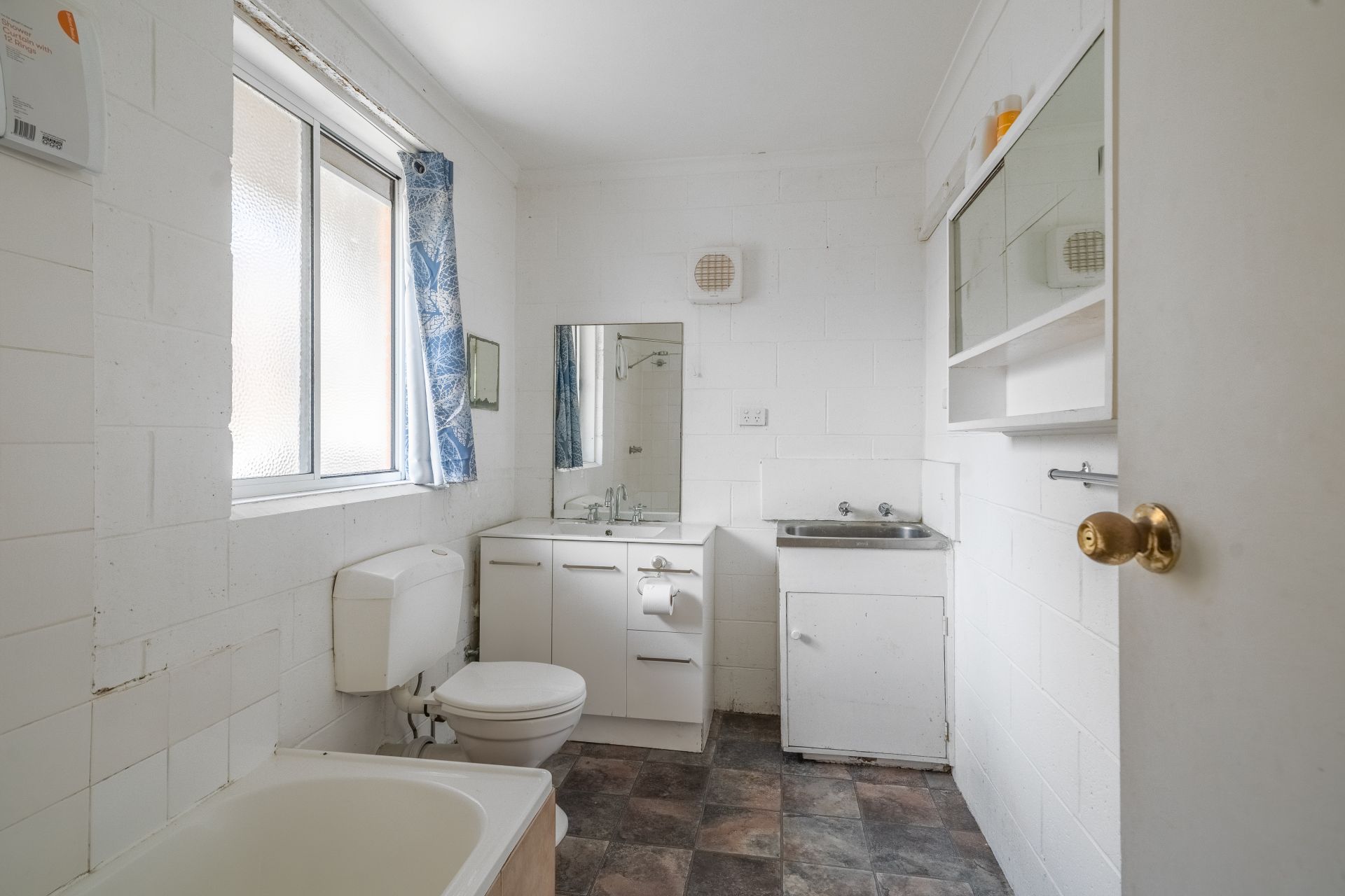 - Large combined bathroom and laundry with shower over bath