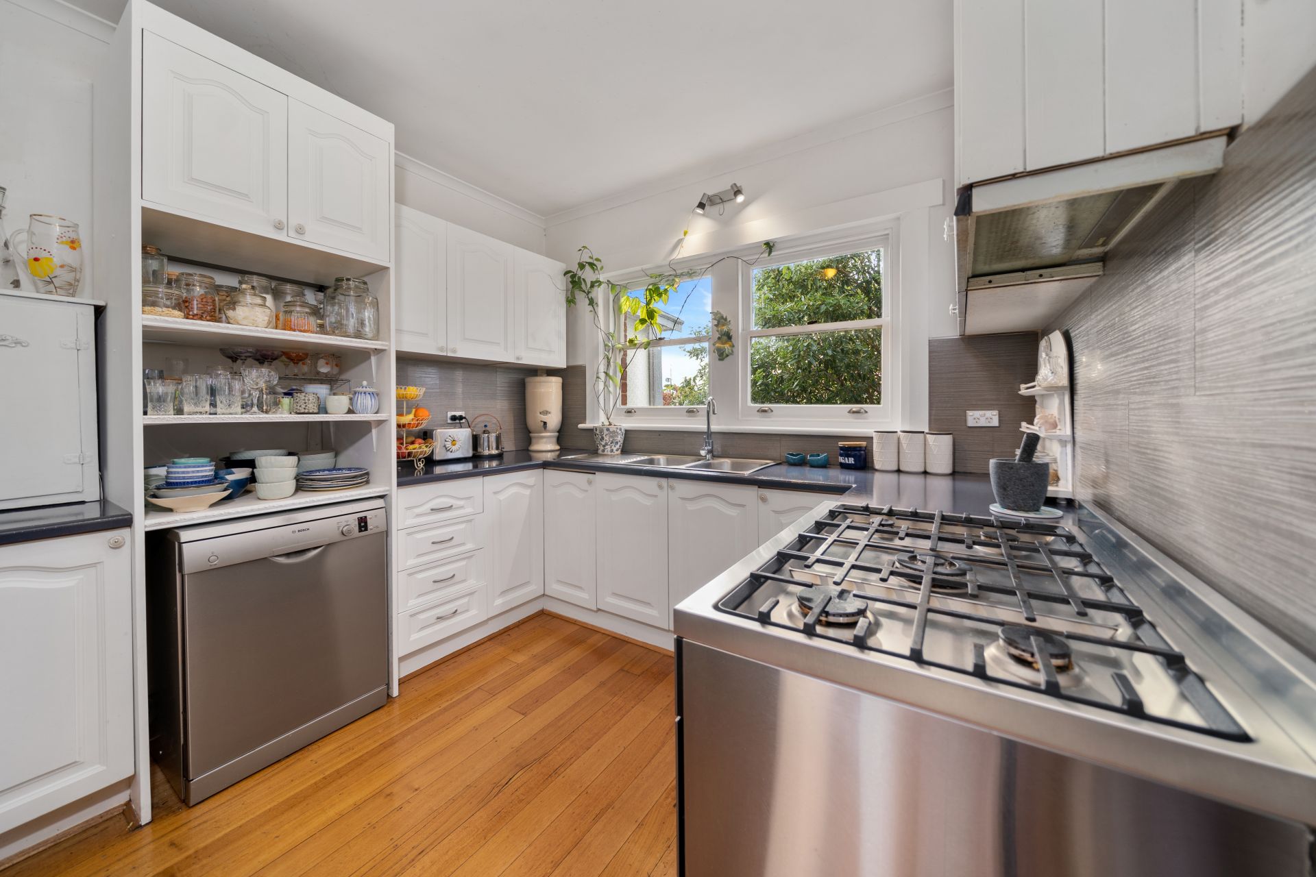 A cute porch leads in to the entrance hall for the home: a place to hang one's coat and hat after a long day! The spacious lounge/dining room is set to the front of the house, features triple aspect windows for maximum light and views and is warmed by a Panasonic split system. Fully renovated, the U shaped kitchen displays a monochromatic colour scheme, plenty of storage and a fabulous five burner Westinghouse stove and oven to cook up a storm.