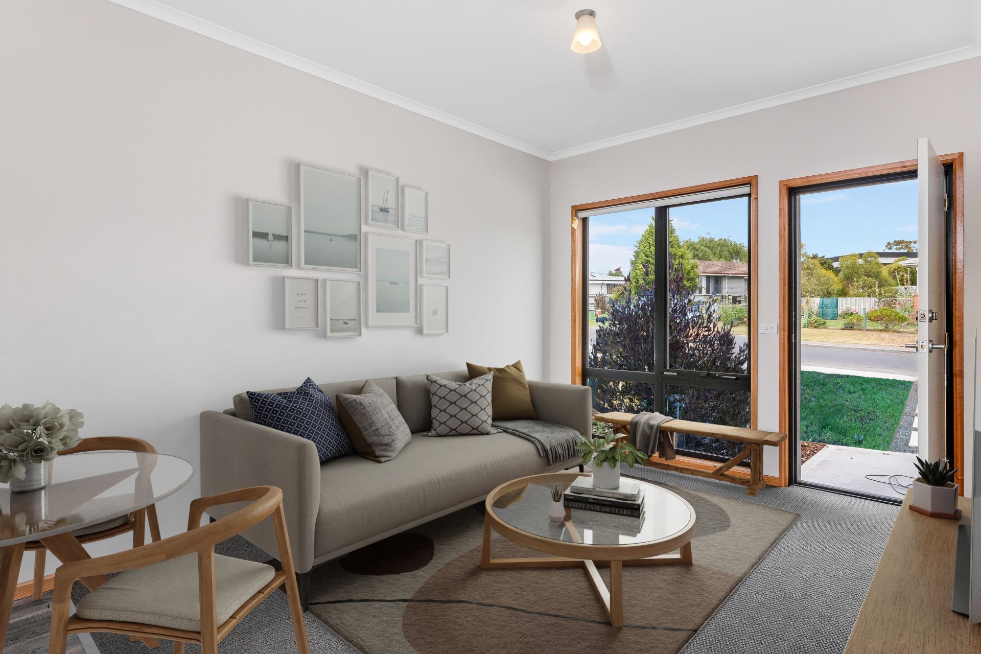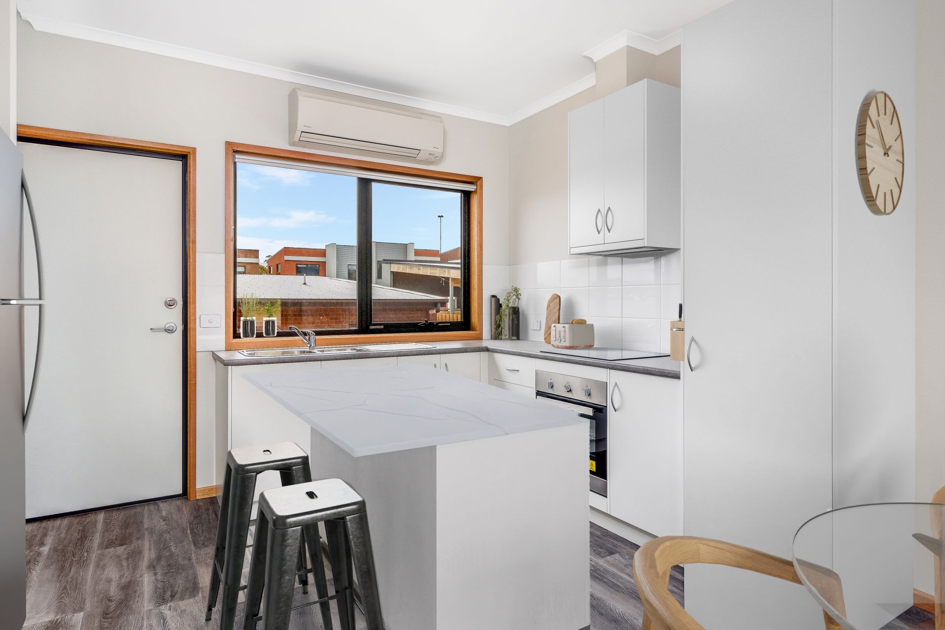 Inside, the warm lounge and open-plan kitchen offer a welcoming space to relax or entertain. A generous island bench and plenty of storage will delight the home cook. The rear courtyard is thoughtfully designed with garden beds and synthetic turf – perfect for summer BBQs or relaxing evenings with friends.