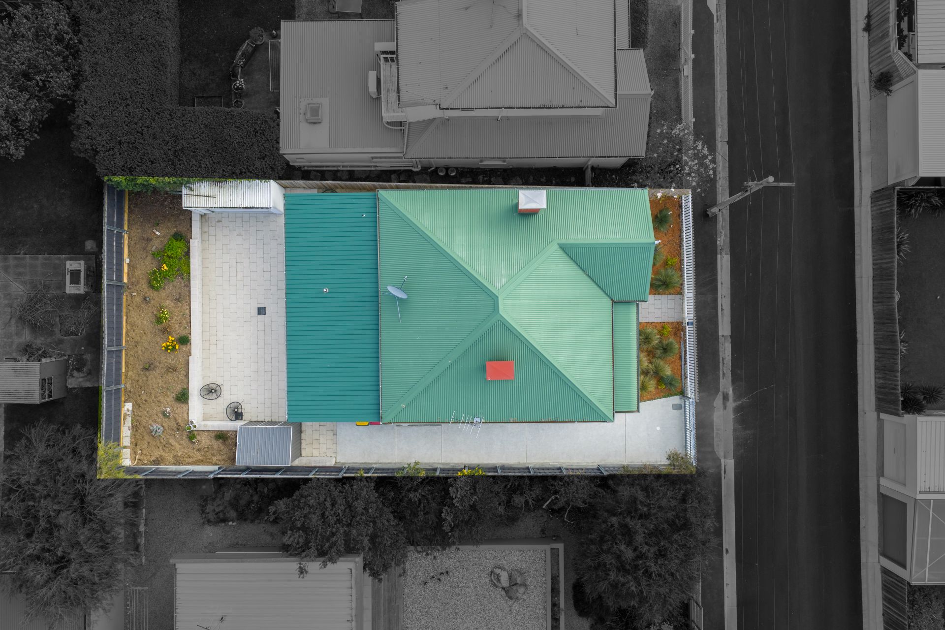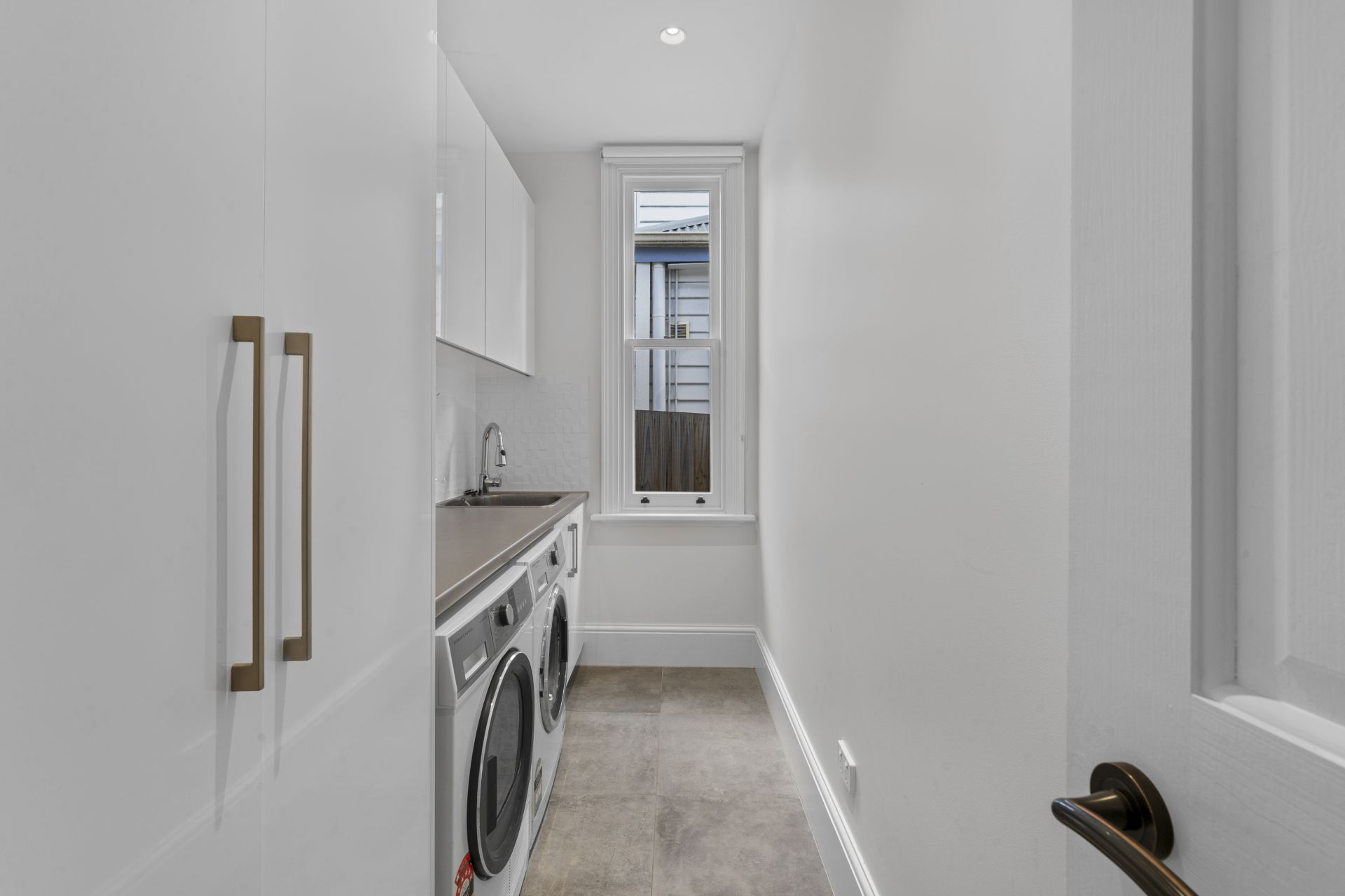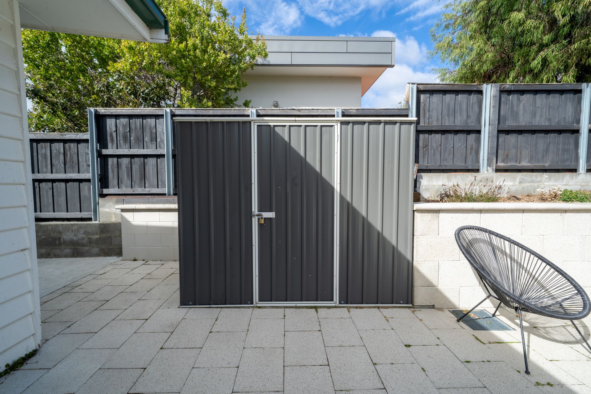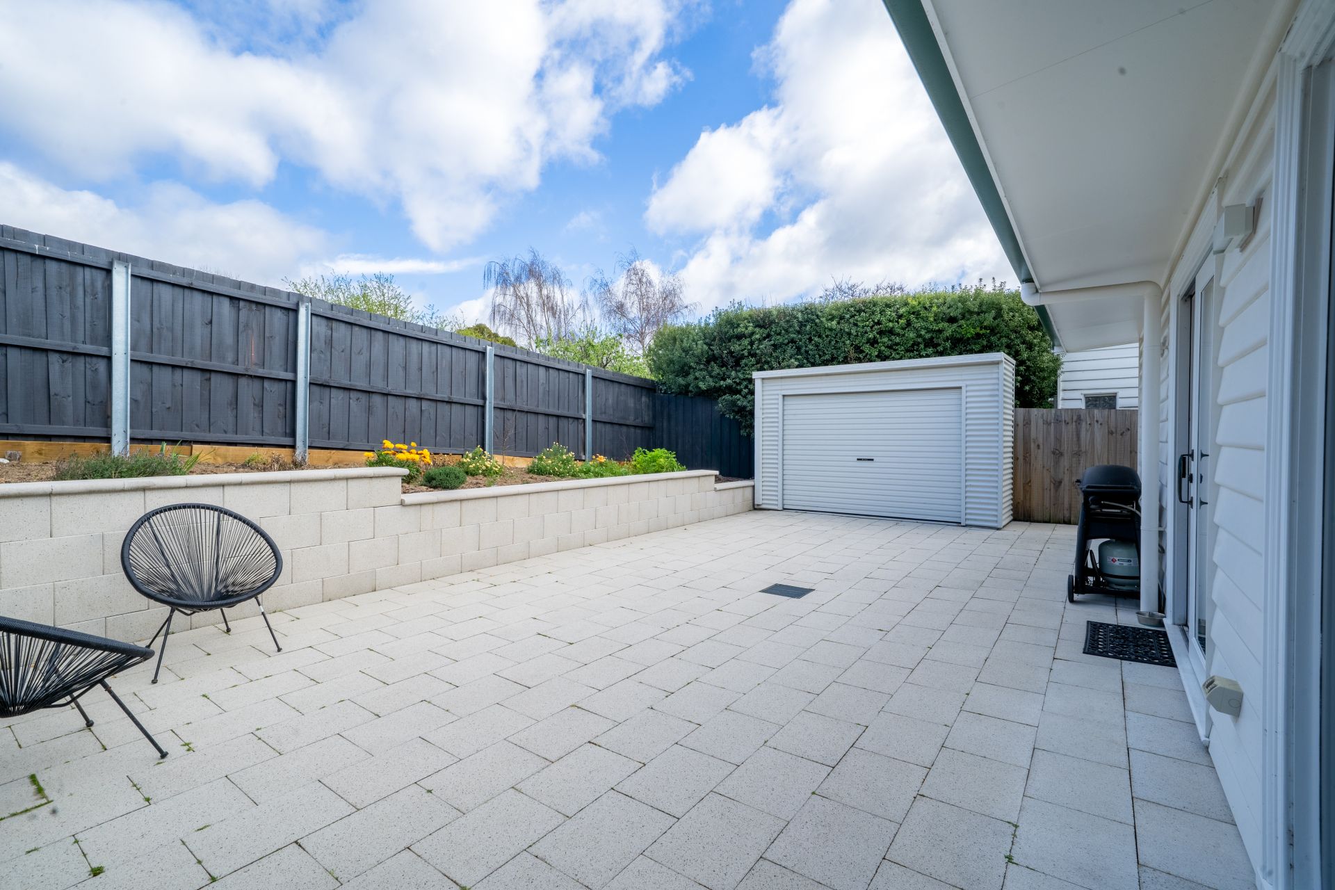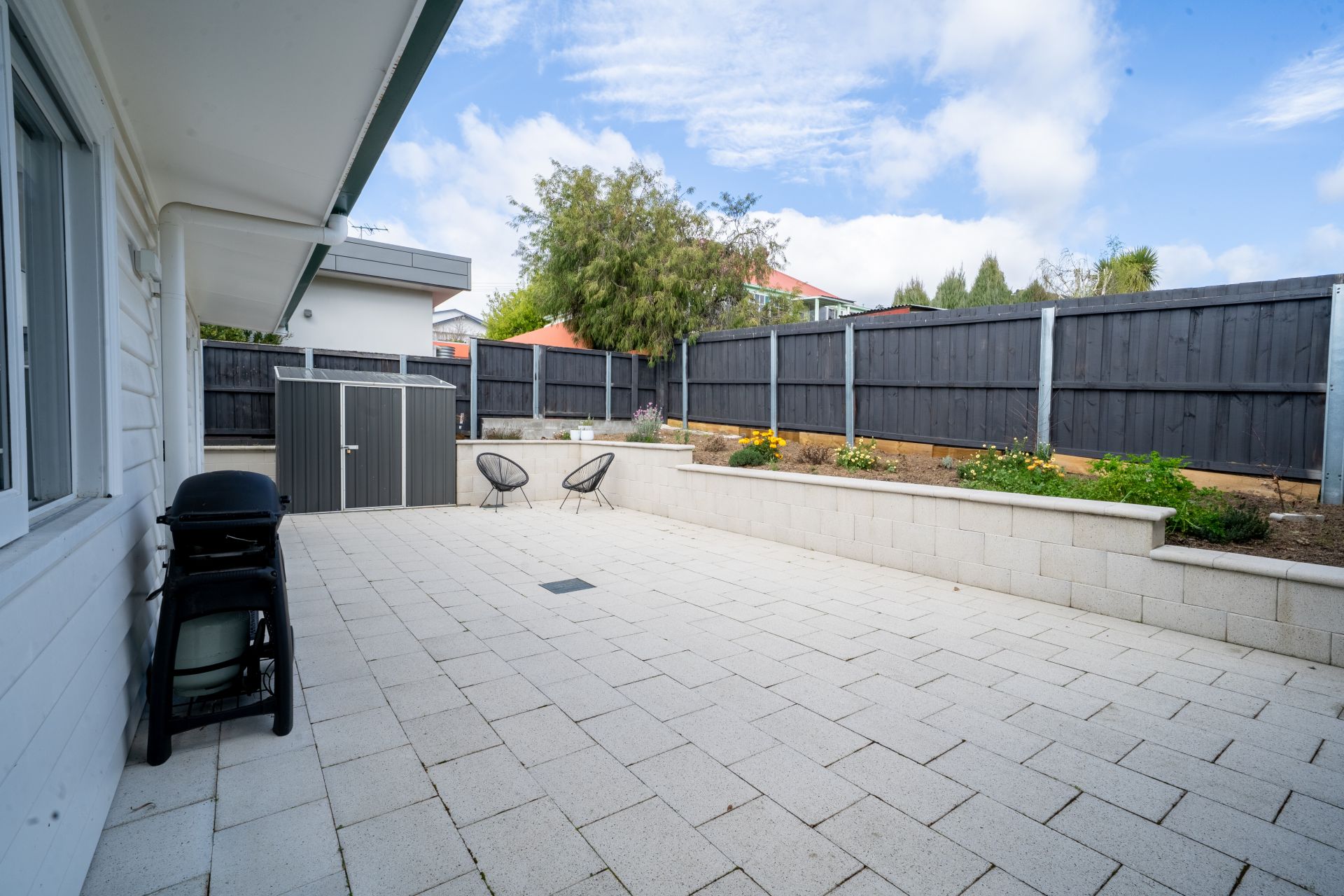 The exterior has been designed for low-maintenance living, with a paved courtyard that provides the perfect space for entertaining or relaxing outdoors. Off-street parking for two vehicles adds further convenience, a rare find in this sought-after location.