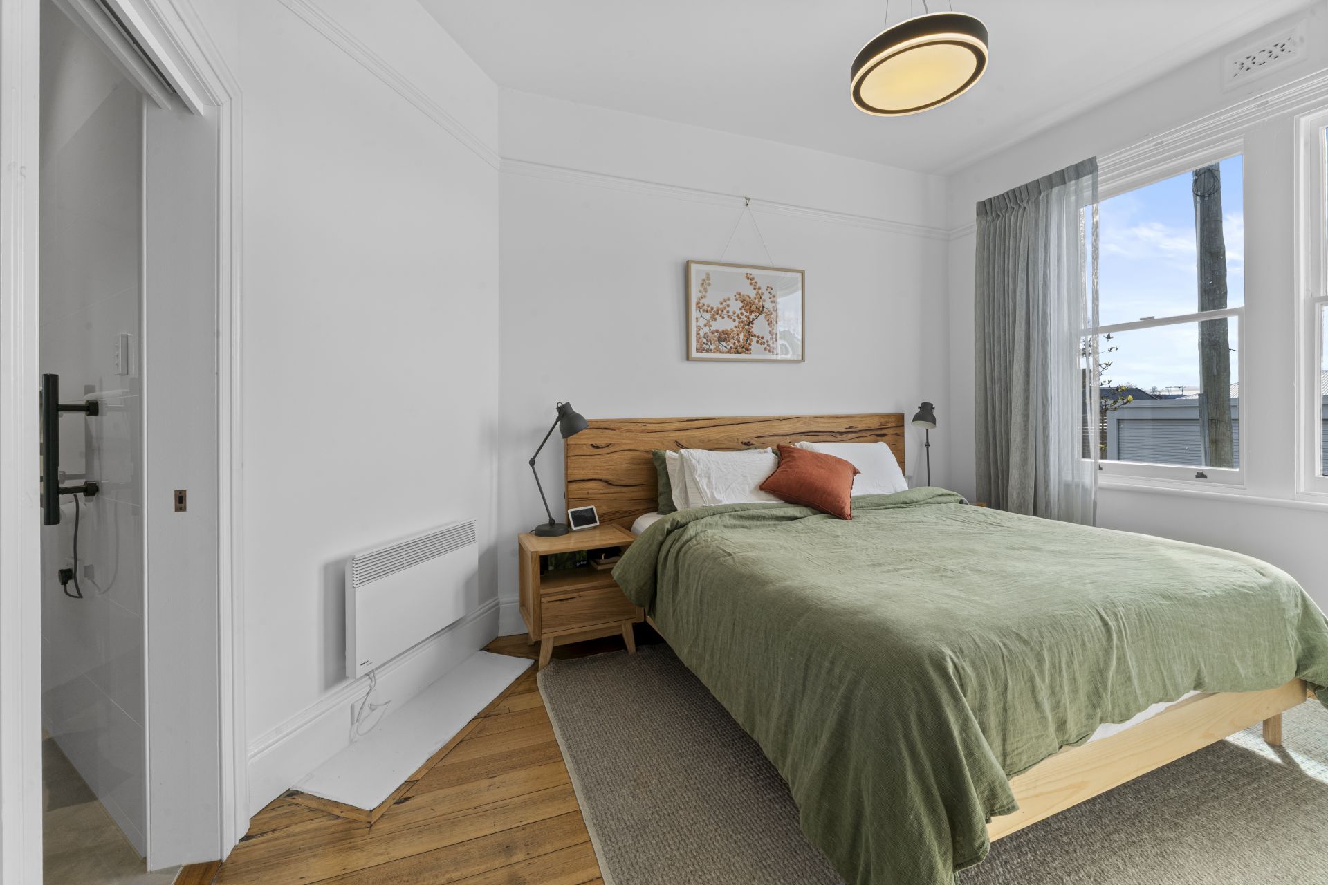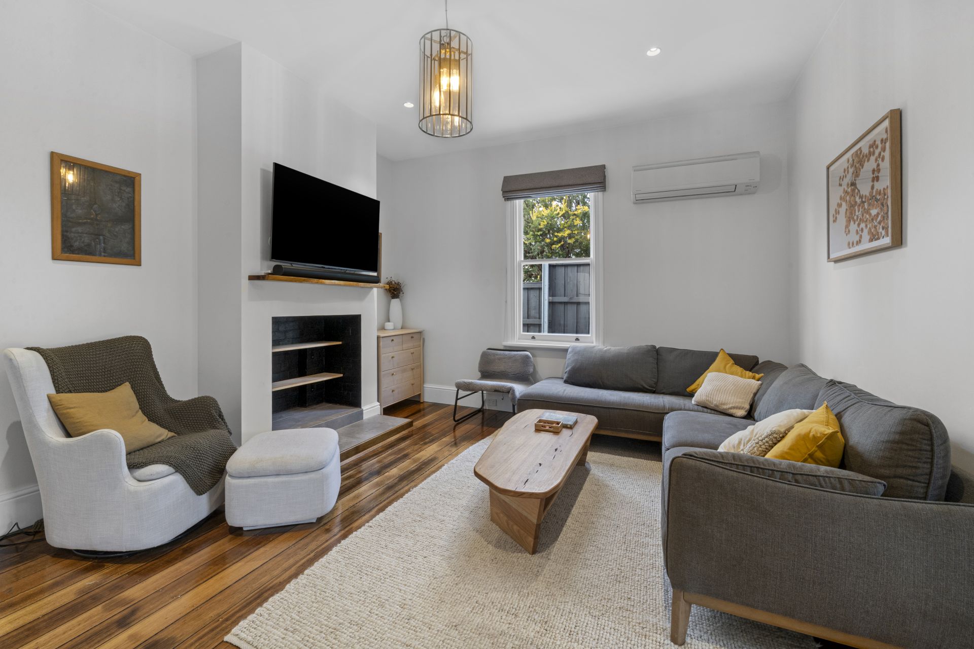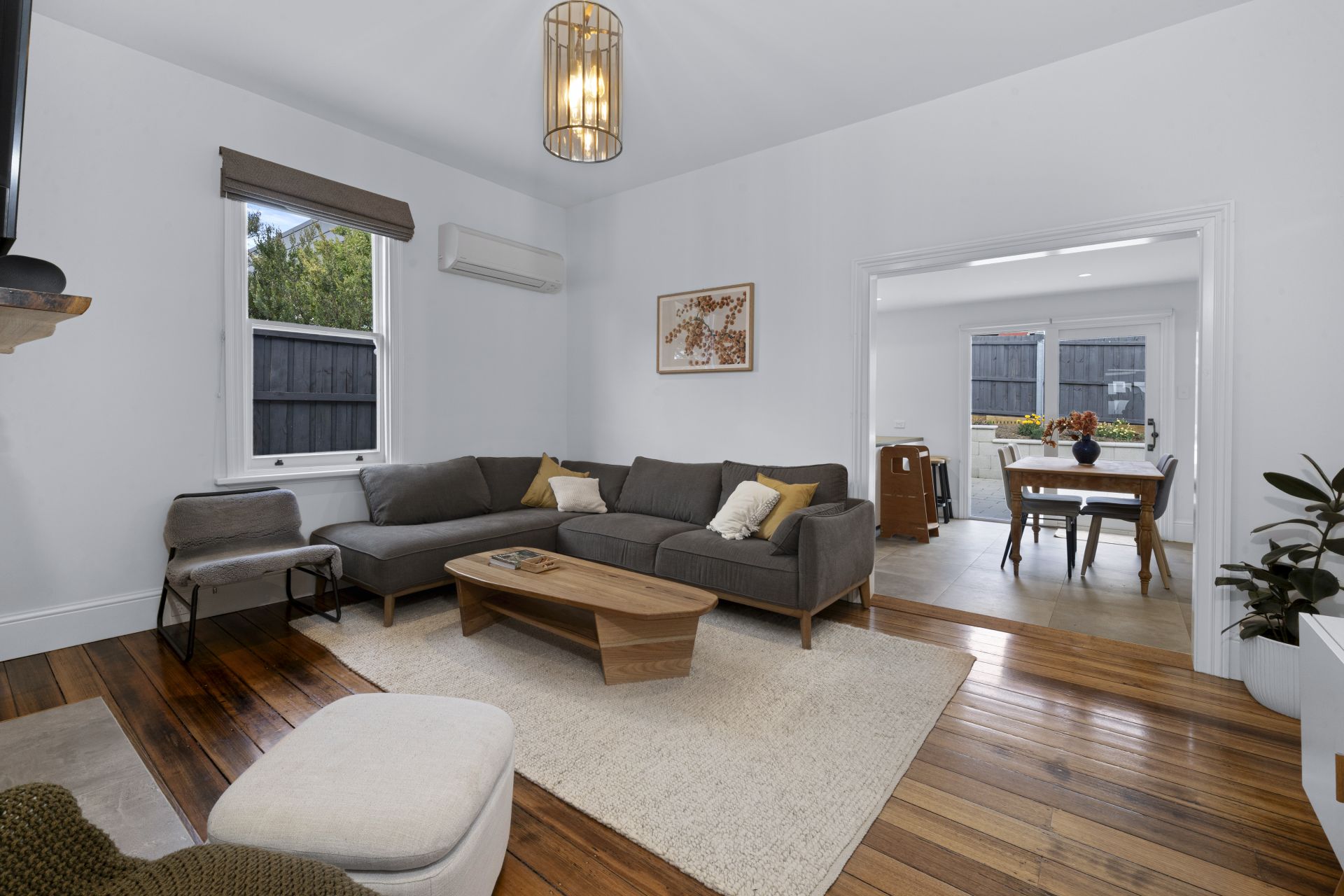 The living space is warm and inviting, complete with polished timber flooring and a reverse-cycle heat pump to ensure year-round comfort.