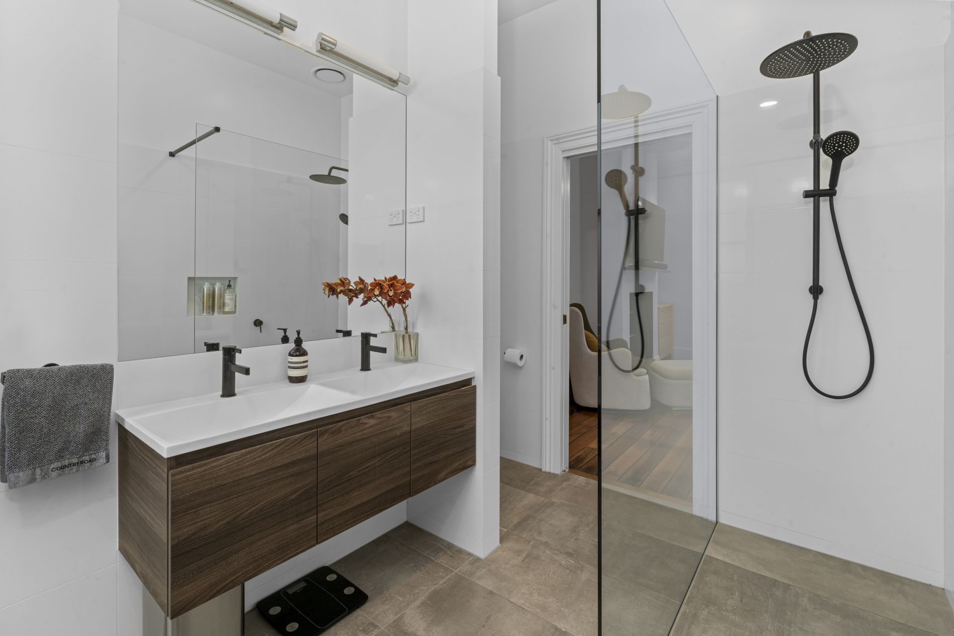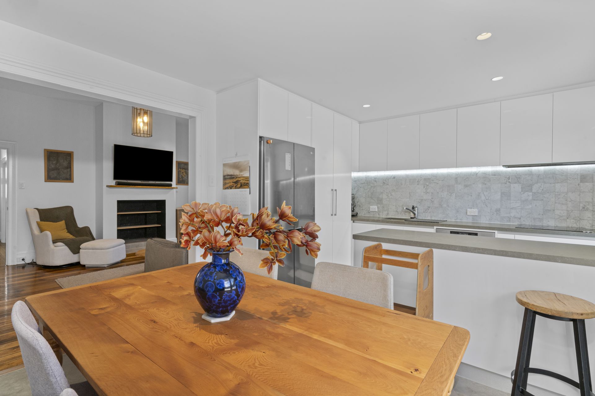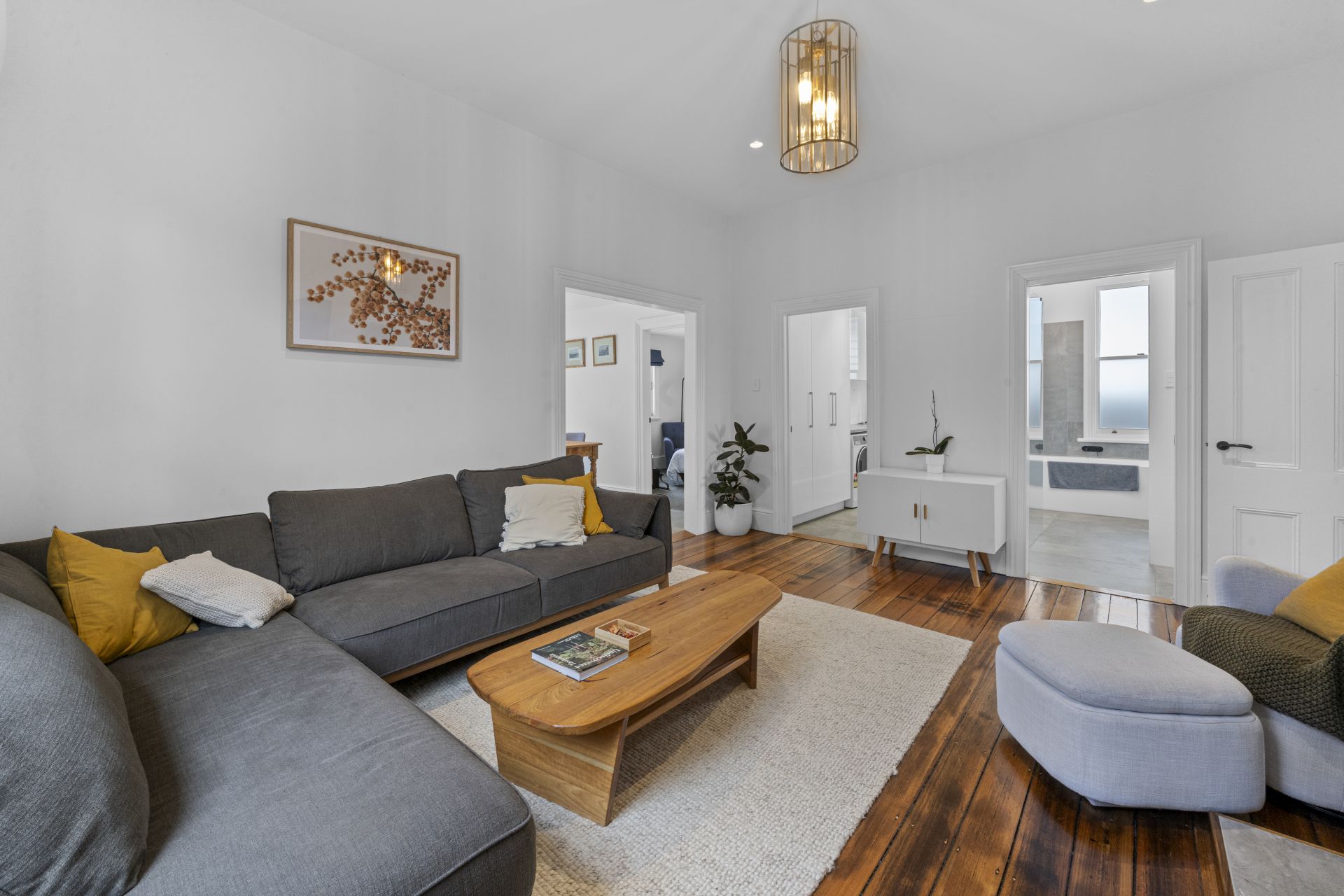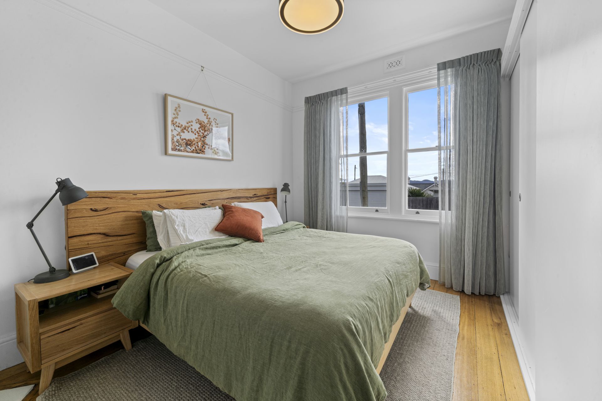 The living space is warm and inviting, complete with polished timber flooring and a reverse-cycle heat pump to ensure year-round comfort.