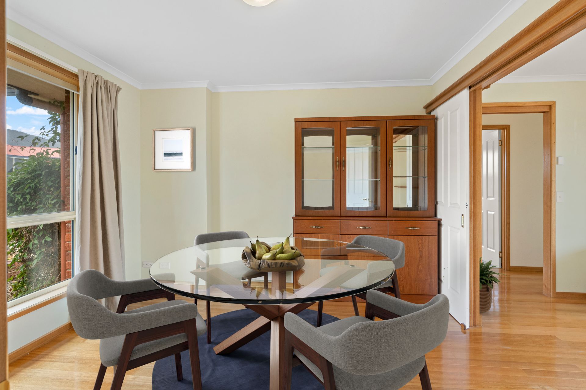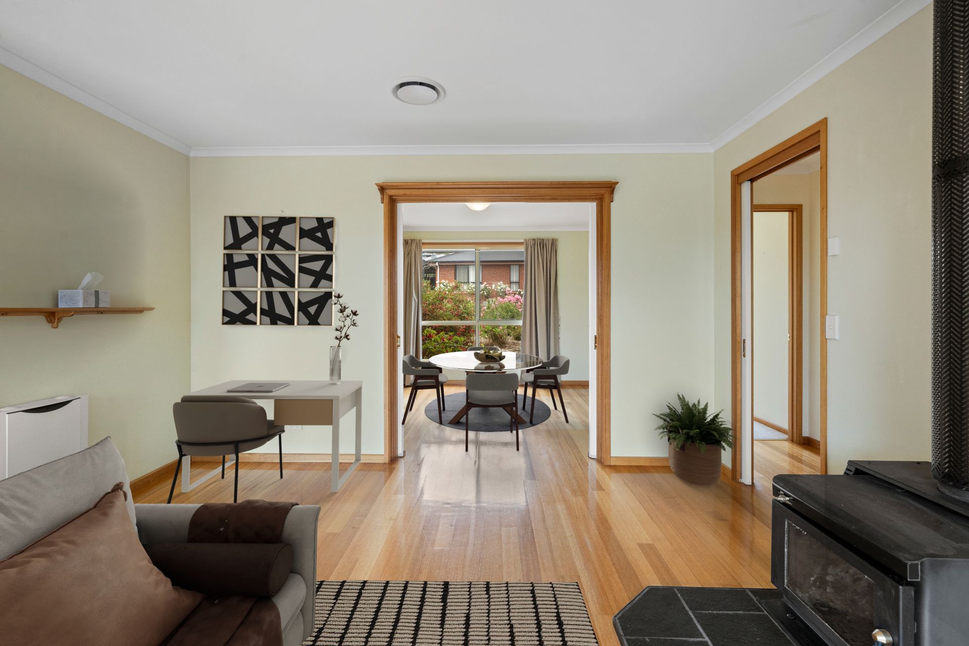 The home is bathed in natural sunlight throughout, with an open-plan living area which seamlessly flows into the dining space and kitchen.