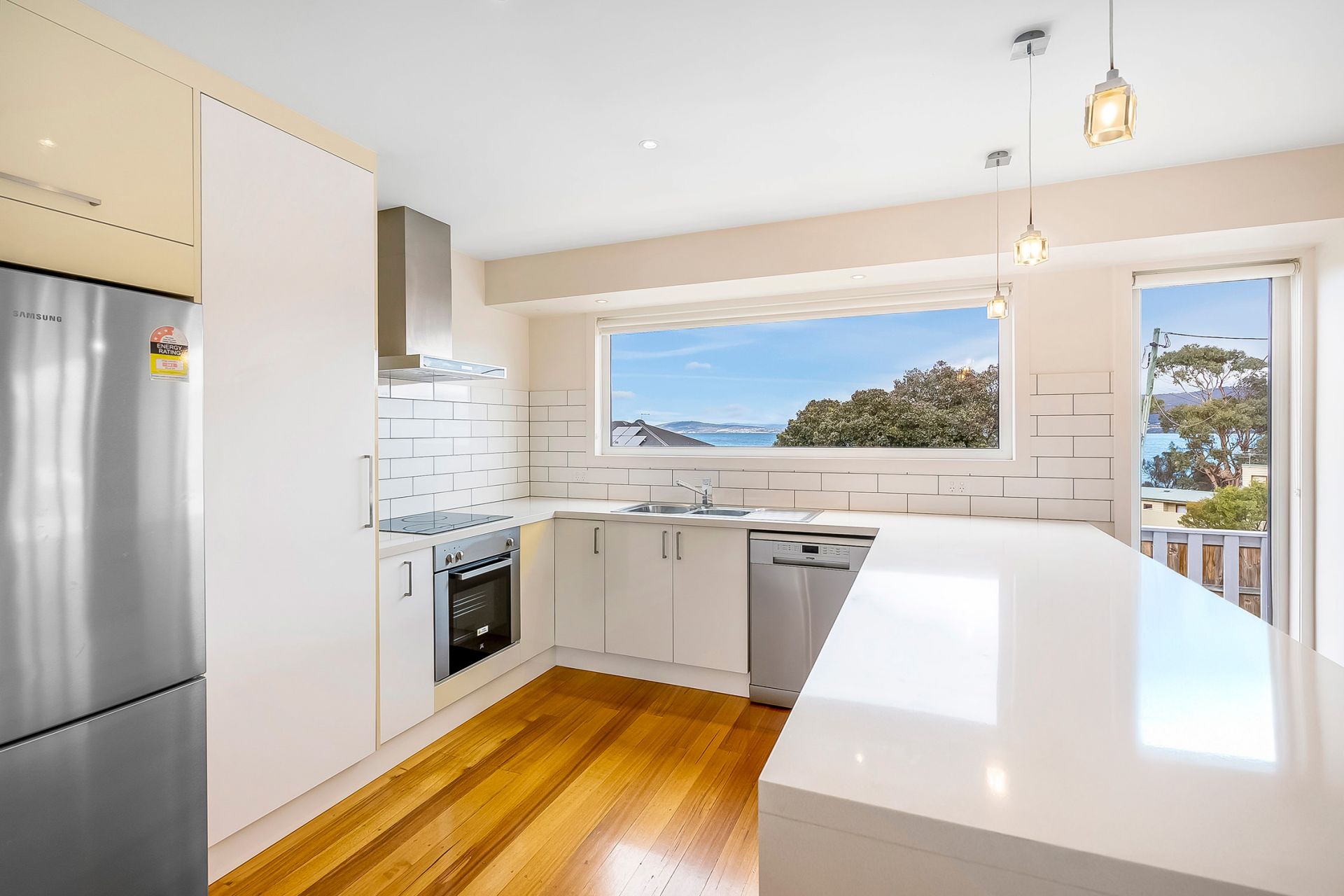 Upon entry you are welcomed in with beautiful polished floorboards throughout the open plan Kitchen, Dining & lounge room area. This area is bathed in natural sunlight and captures water views all round with double corner sliding doors giving you the option to welcome in the fresh sea breeze.