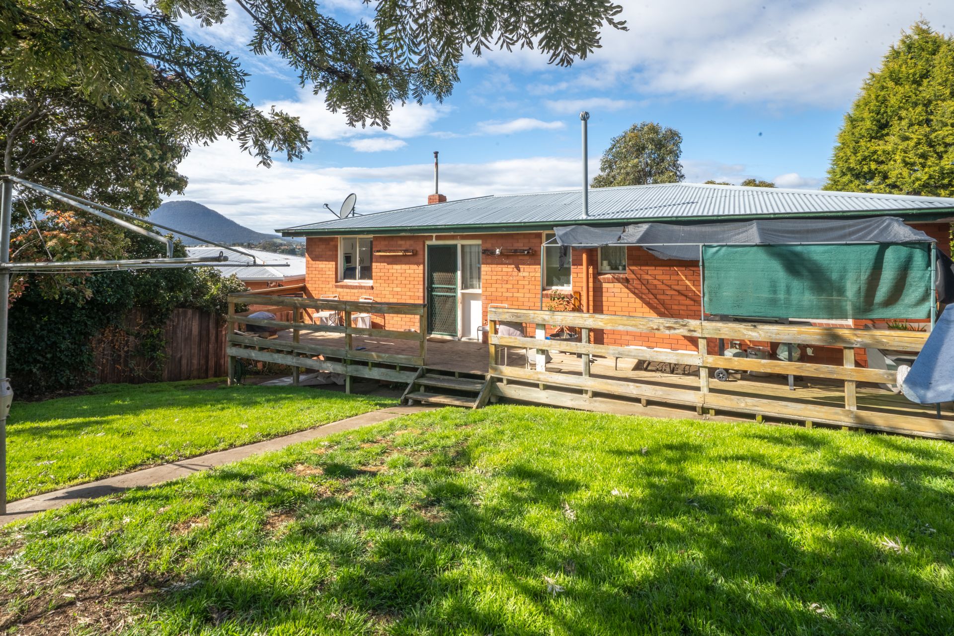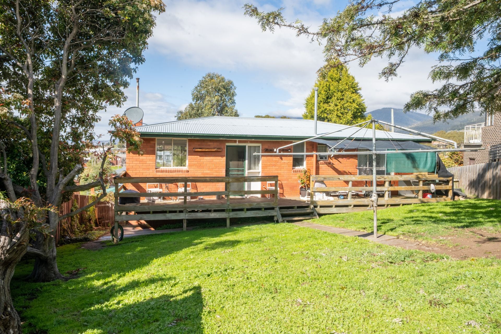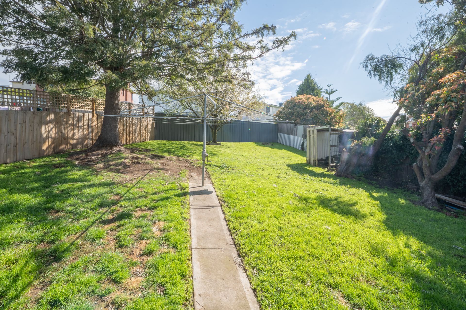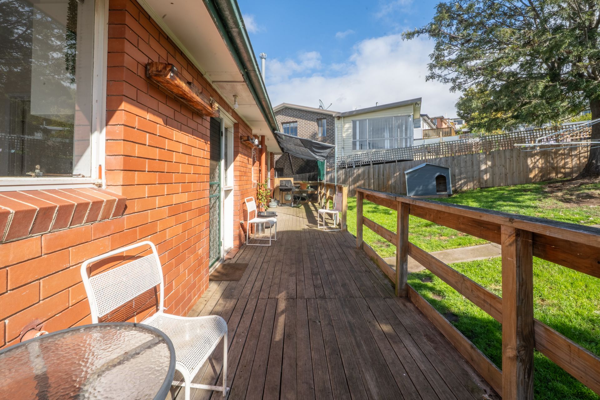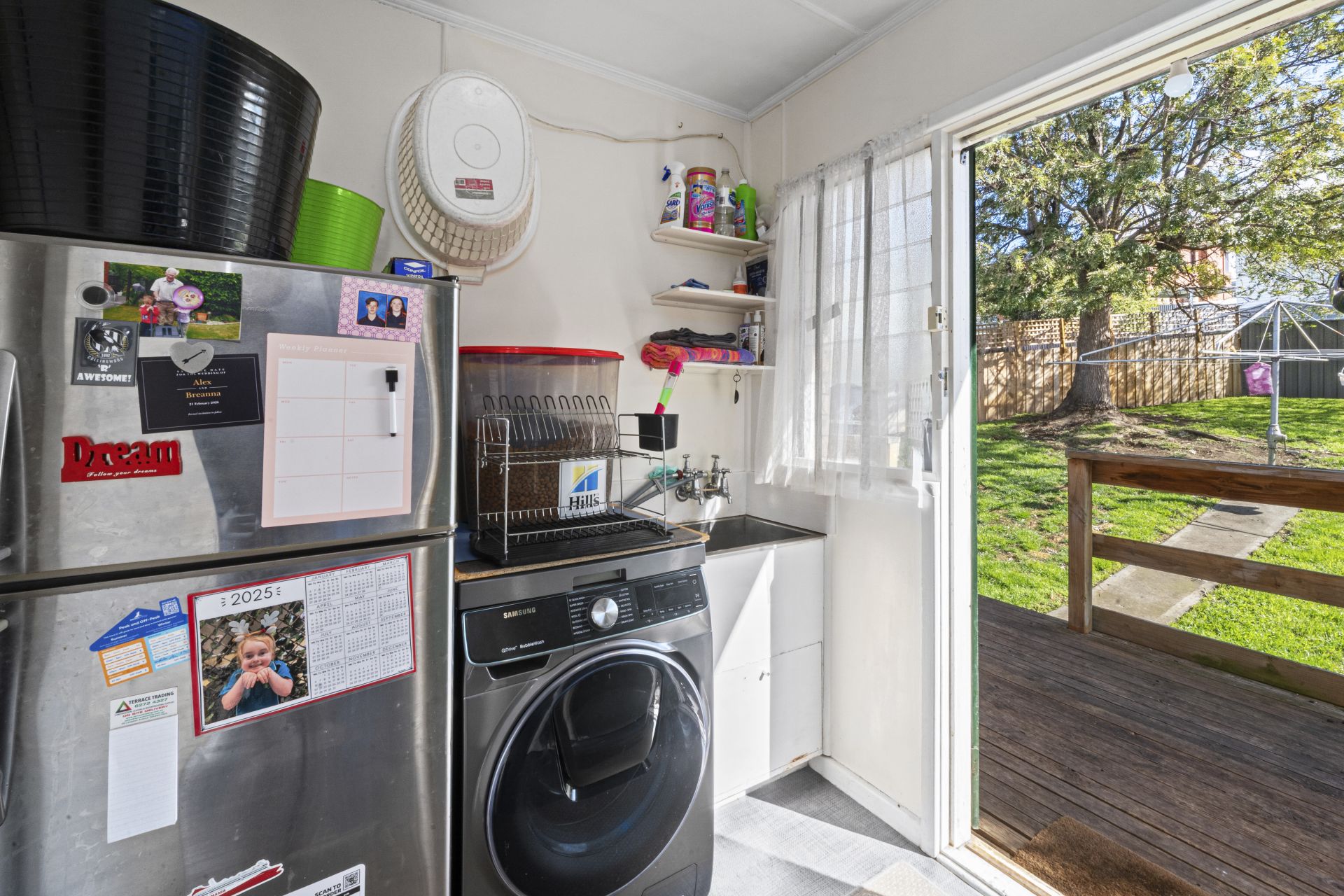 The fully fenced backyard offers a secure space for kids and pets to play safely.