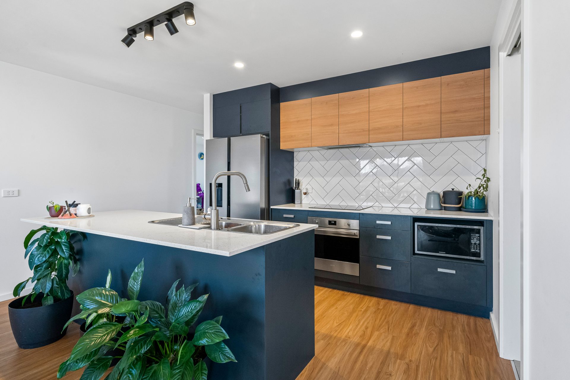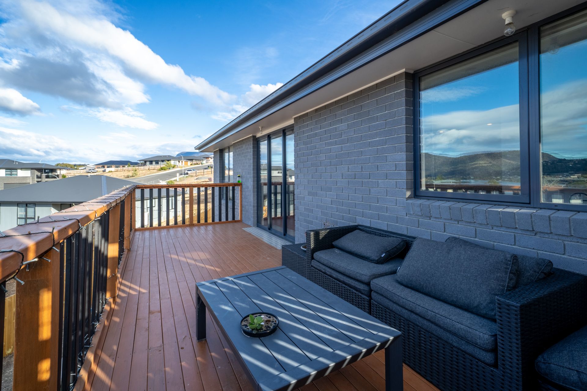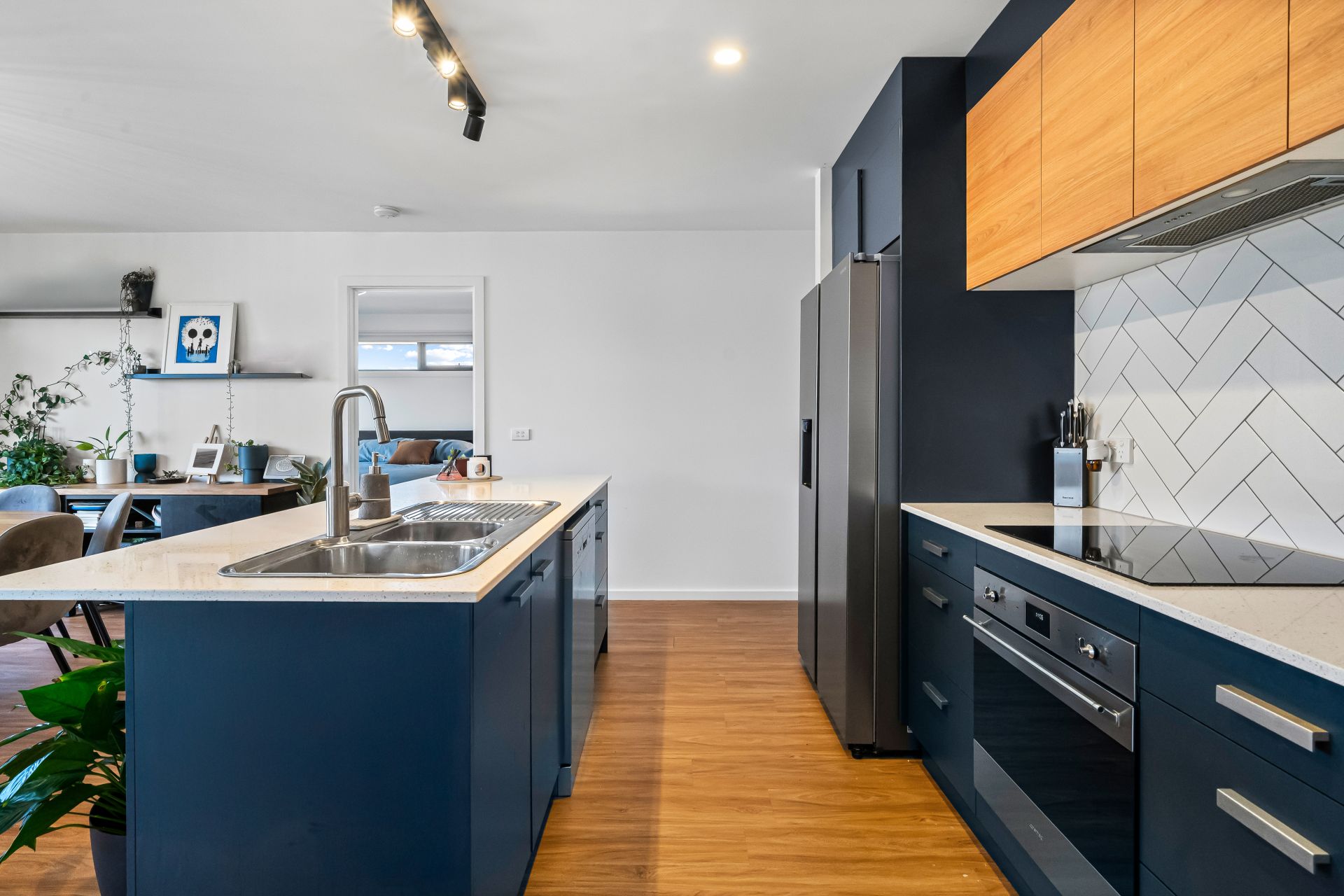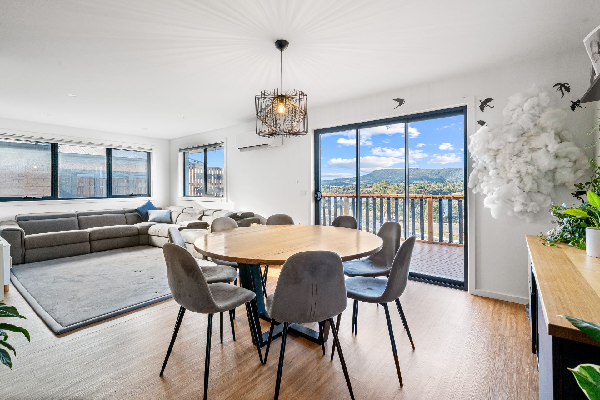 The heart of the home is the open-plan kitchen, dining and lounge area, flowing effortlessly onto the deck where you can soak up the expansive views – perfect for entertaining or simply unwinding. The sleek, modern kitchen features stone benchtops, timber accents, high-end appliances, and a walk-in butler’s pantry combined with a hidden laundry for added convenience.