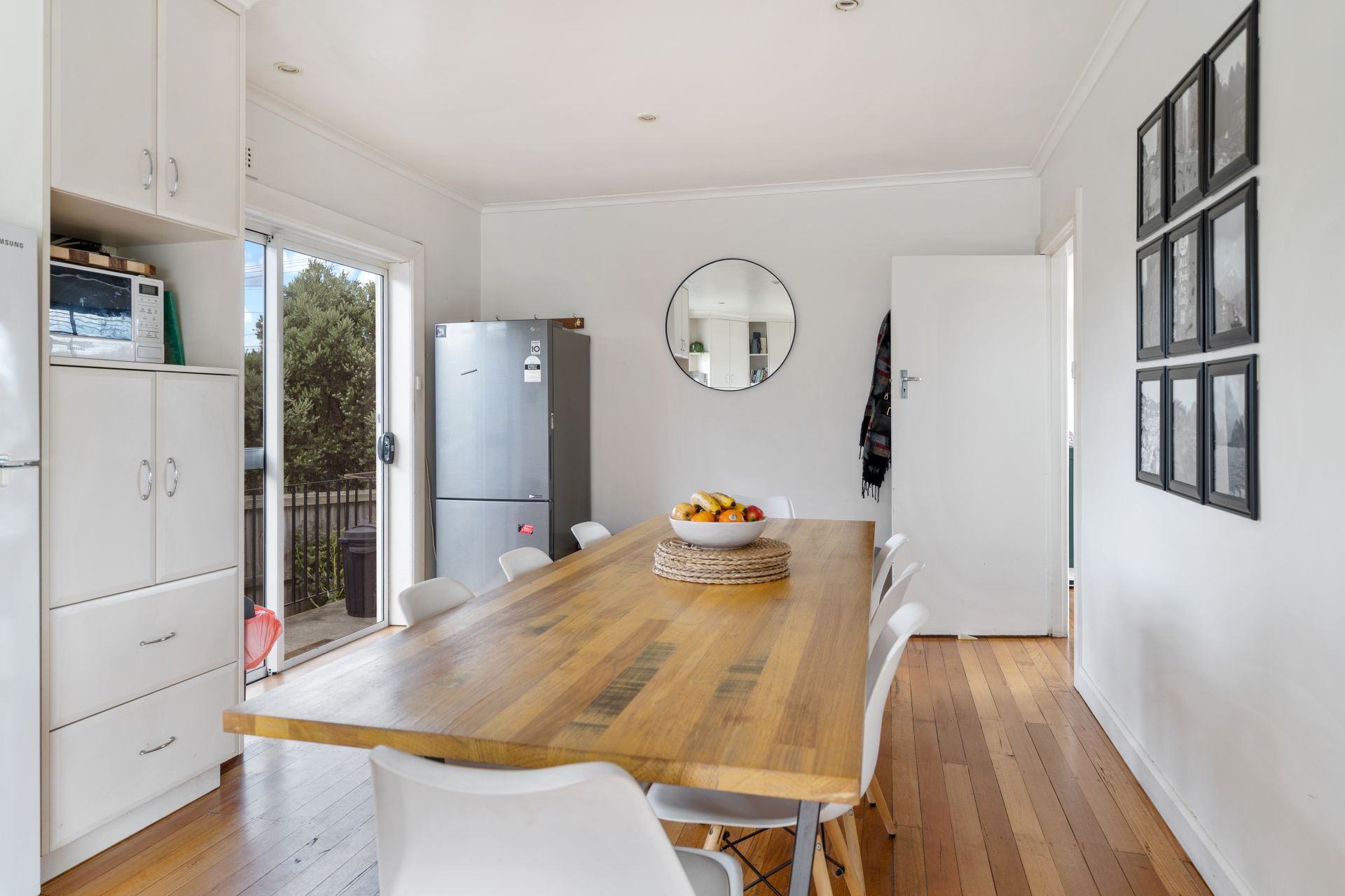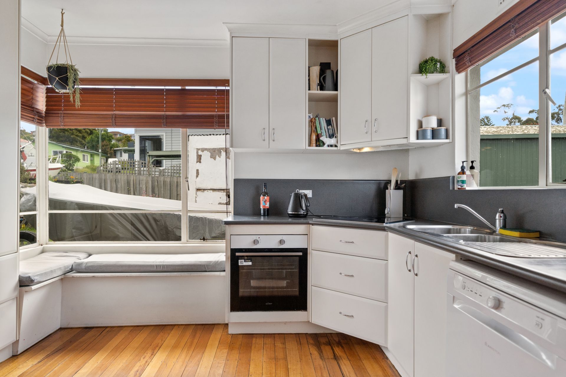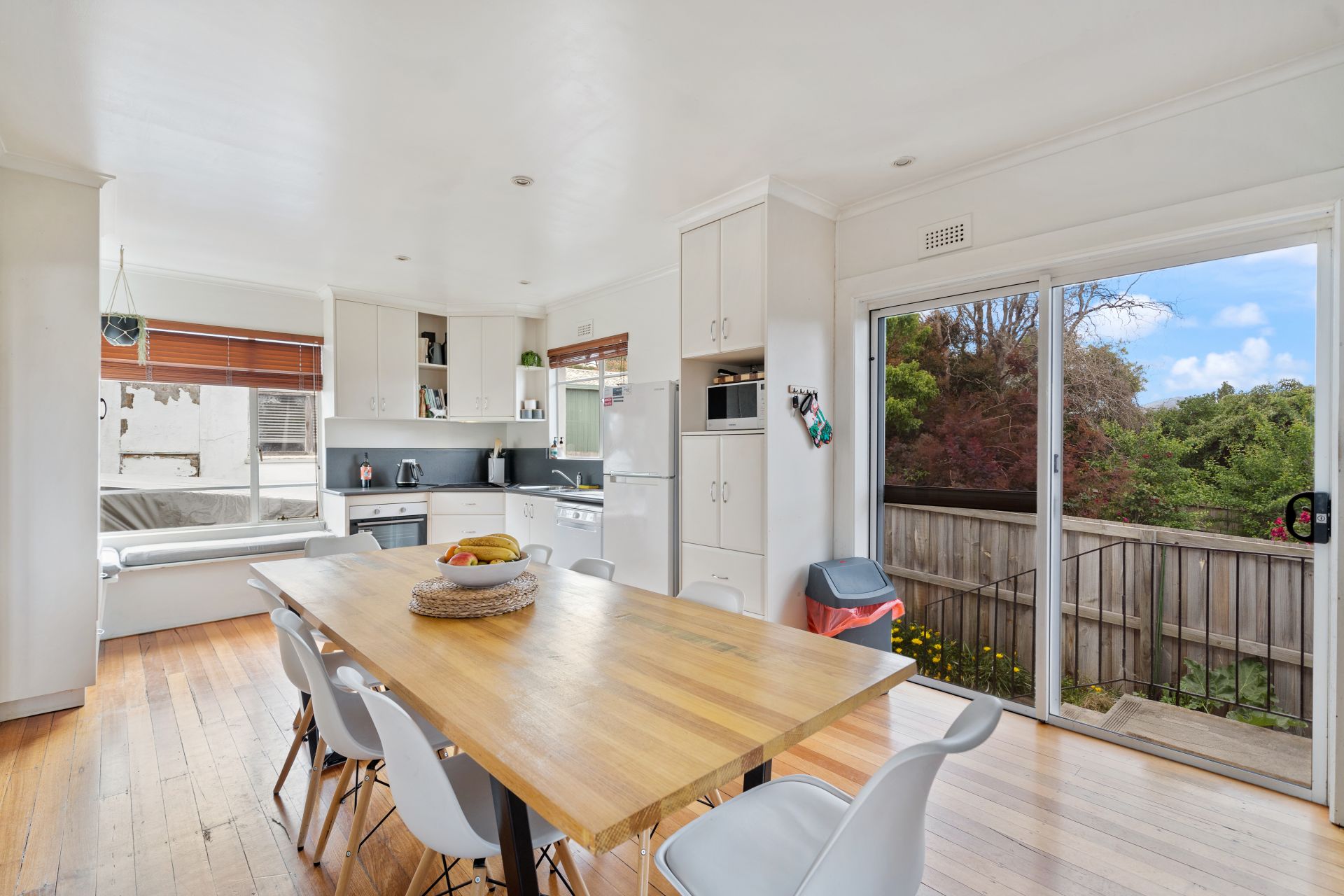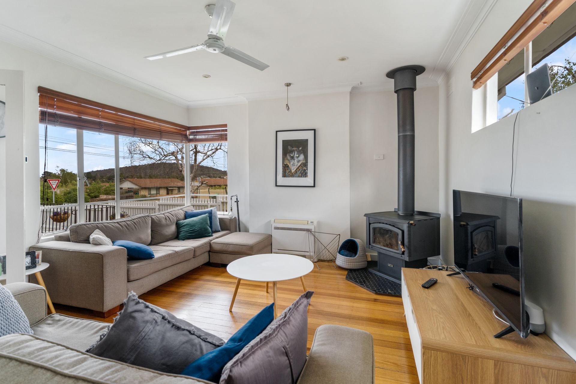 Inside, the home features a light filled living area with polished timber floors, creating a warm and inviting atmosphere. The adjoining dining space connects easily to the kitchen, making everyday living and entertaining simple and practical. Heating is provided via a wood heater, adding character and comfort through the cooler months.