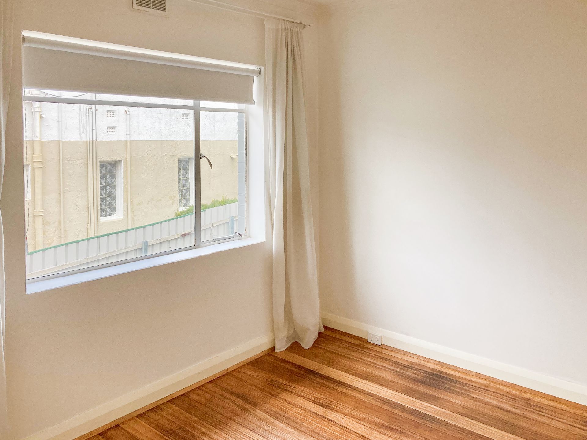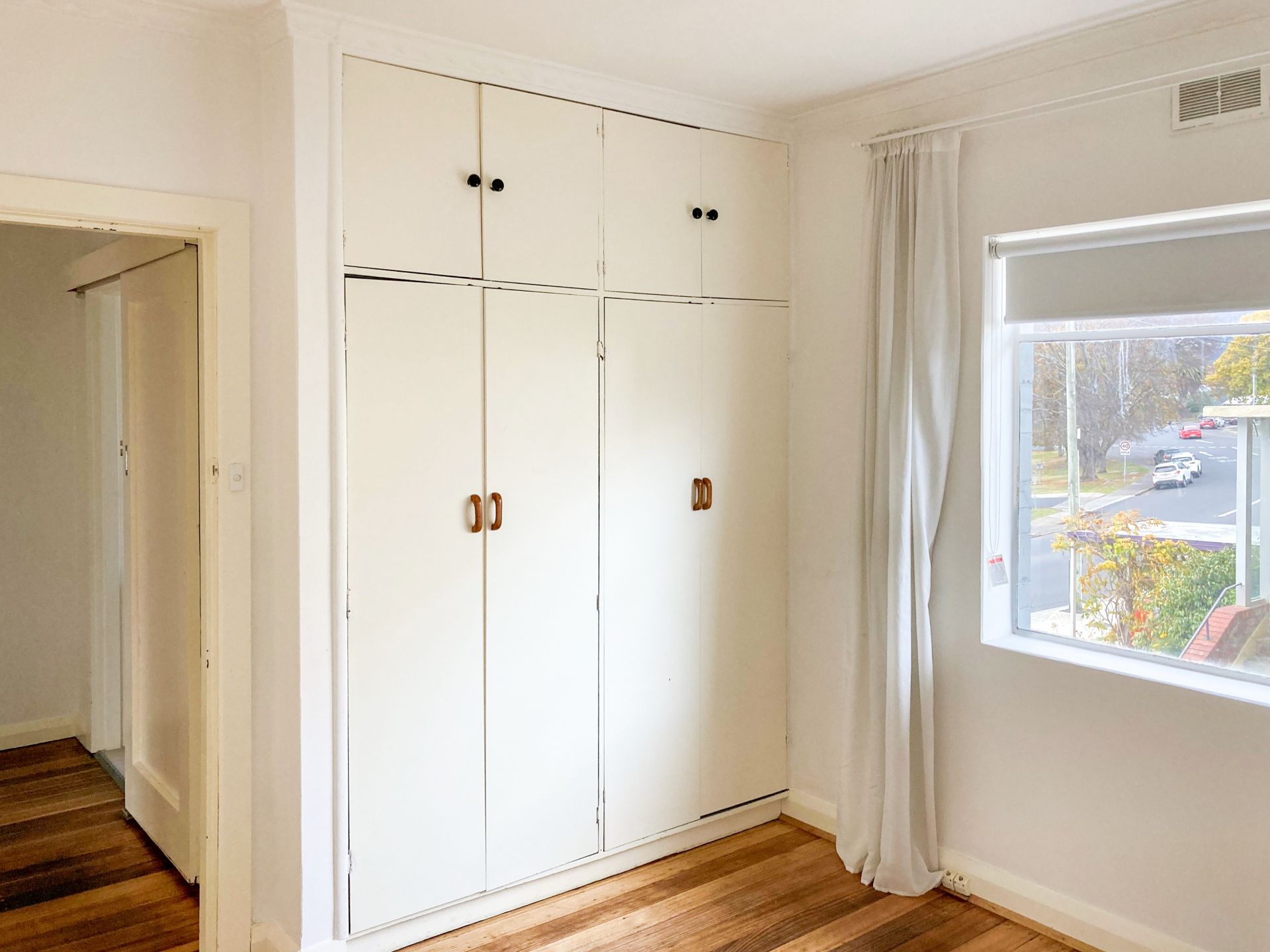 The bedroom is spacious with a built in wardrobe as well as polished floorboards underfoot.