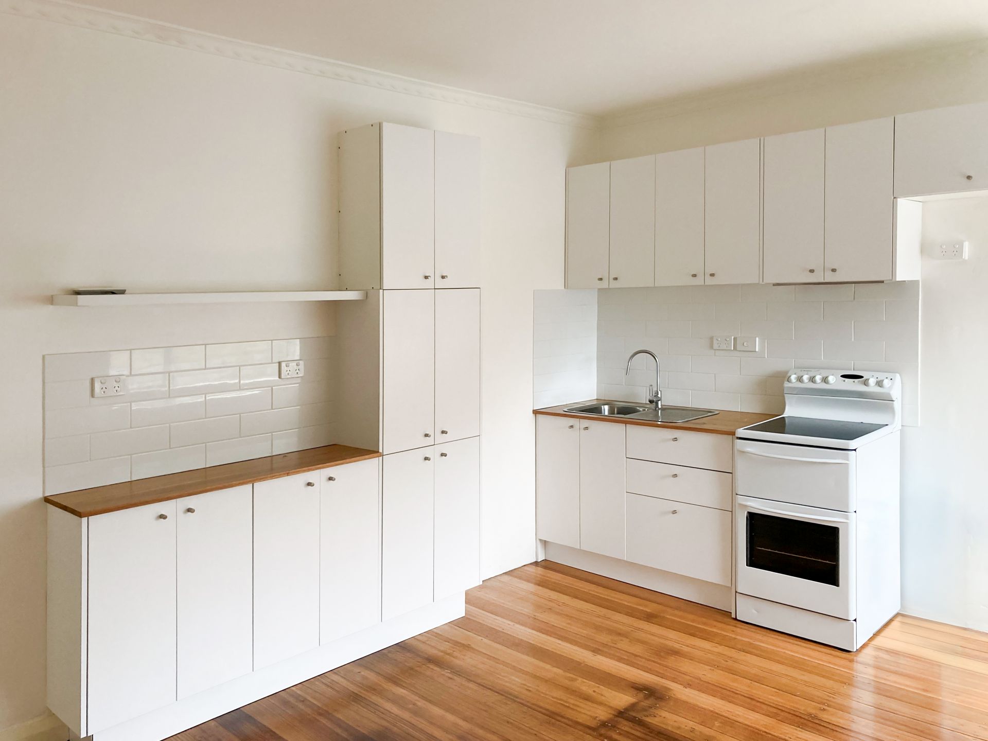 The L shaped kitchen is bright and airy and boasts ample storage space.