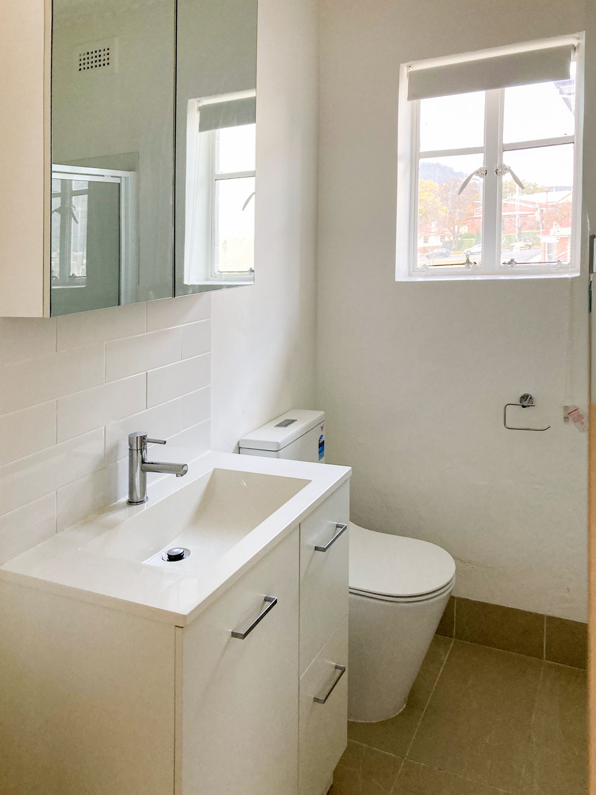 The combined bathroom and laundry is modern with a sleek and clean vibe.