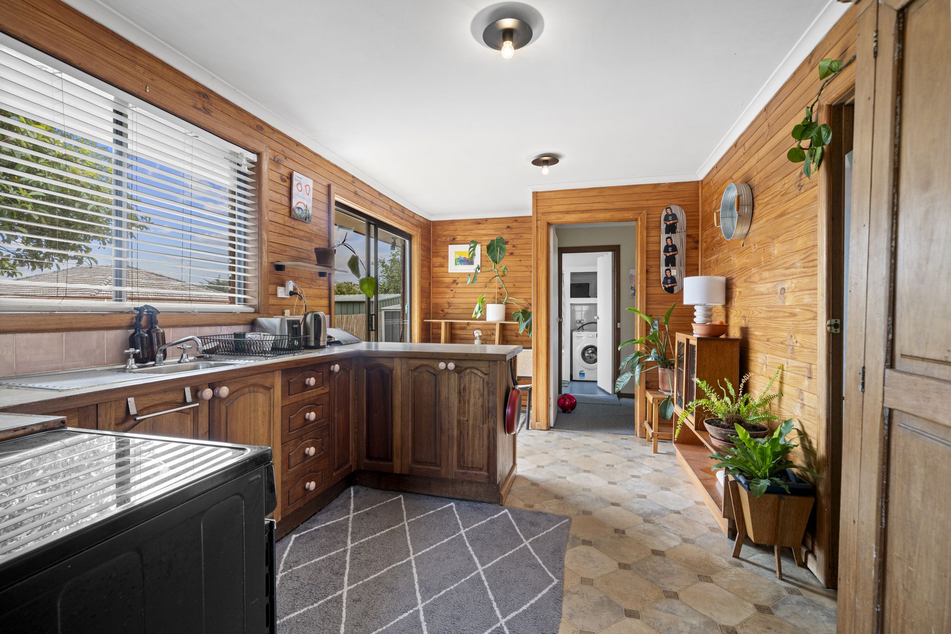 The combined bathroom and laundry include a shower over bath, maximizing space and functionality.