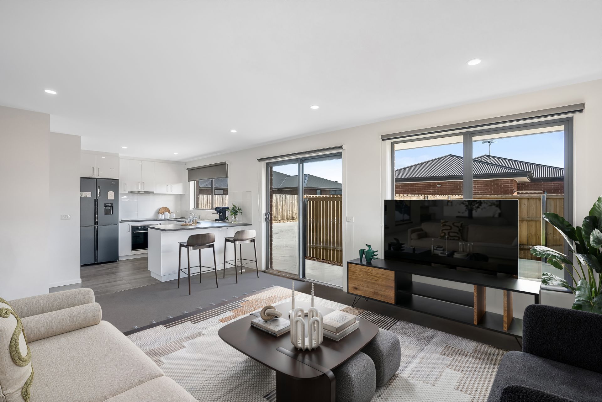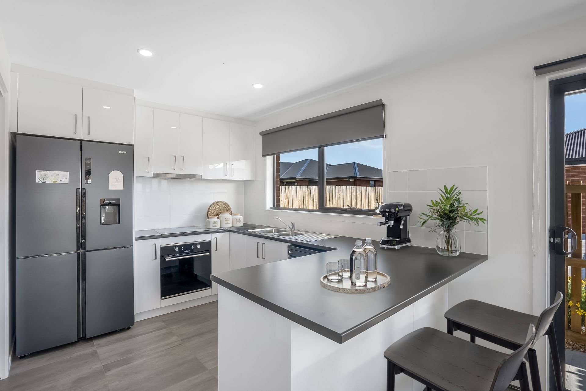 Step inside to a bright and contemporary interior, where open-plan living creates a welcoming atmosphere for relaxing or entertaining. For the home cook, the stylish grey and white kitchen showcases glossy cabinetry and plenty of bench space.