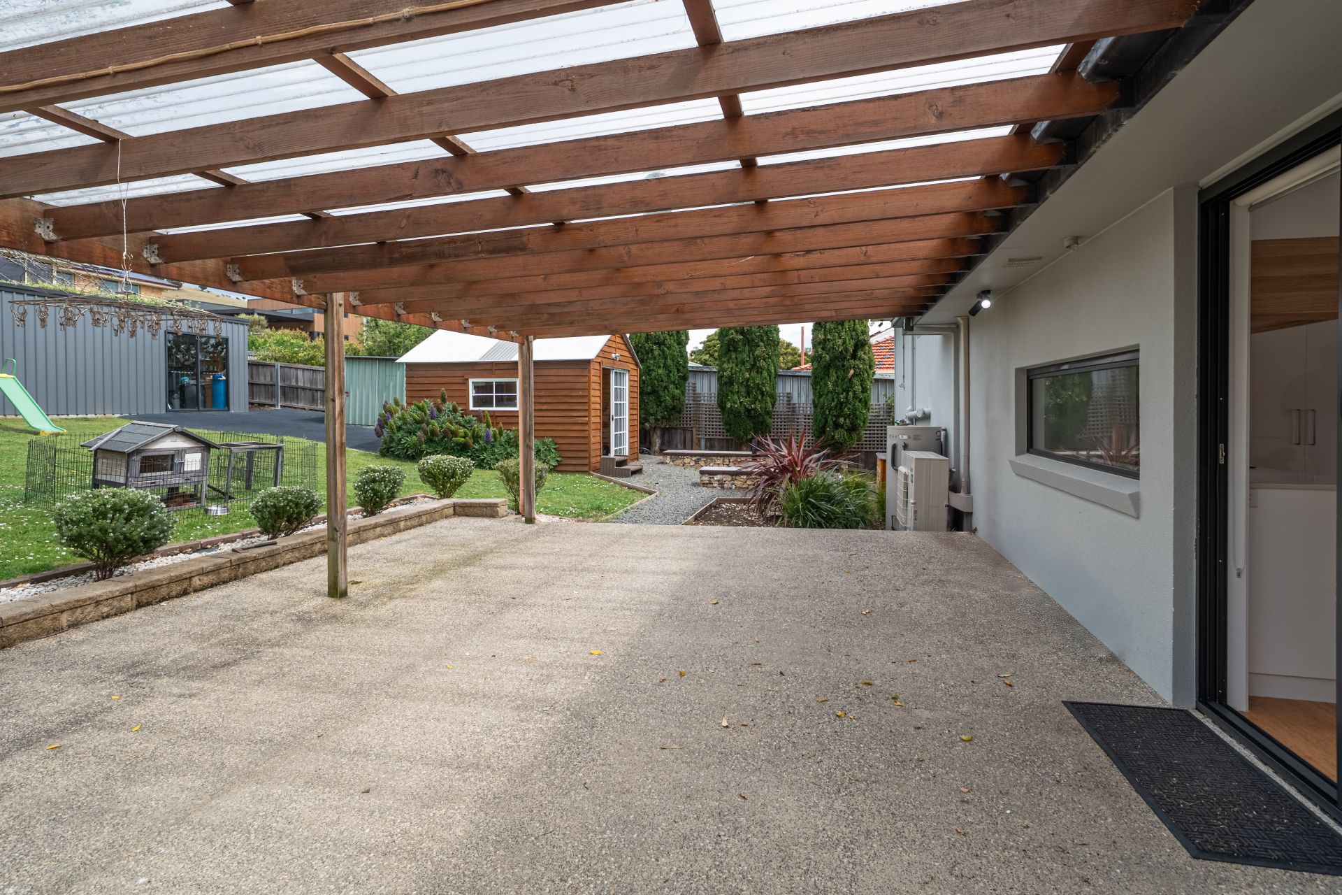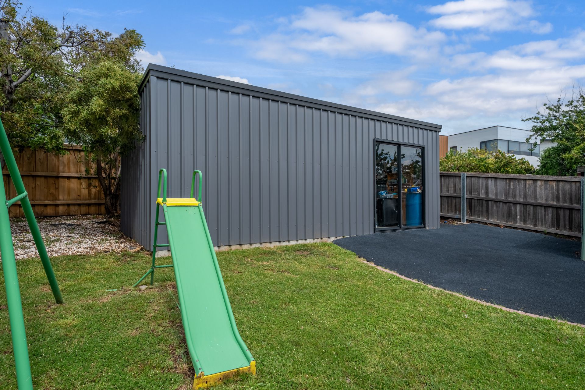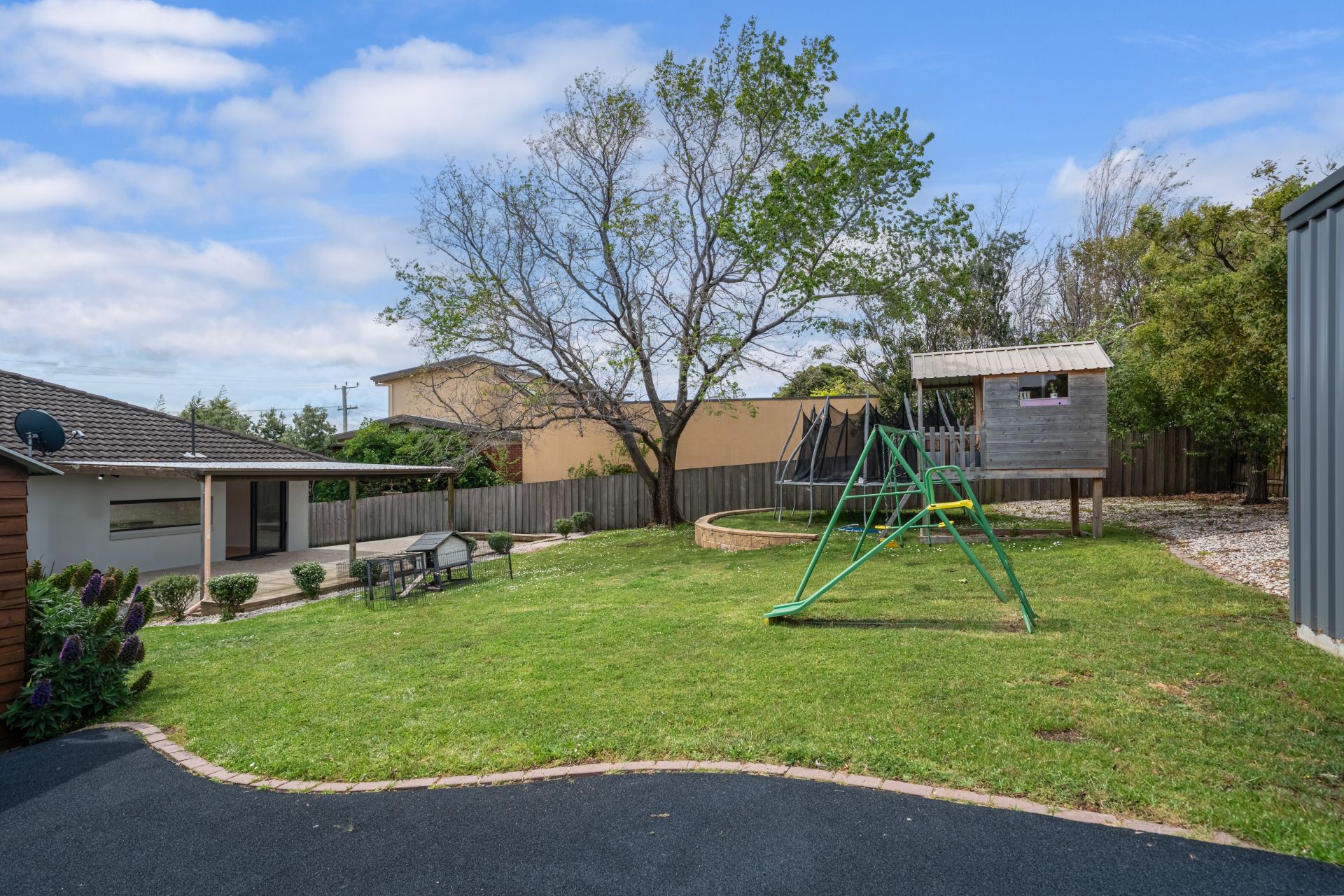 Practical features include a large workshop, extra storage shed, a cubbyhouse for the kids and secure off-street parking. The property is fully fenced for privacy and peace of mind, surrounded by established gardens that enhance the sense of tranquility.