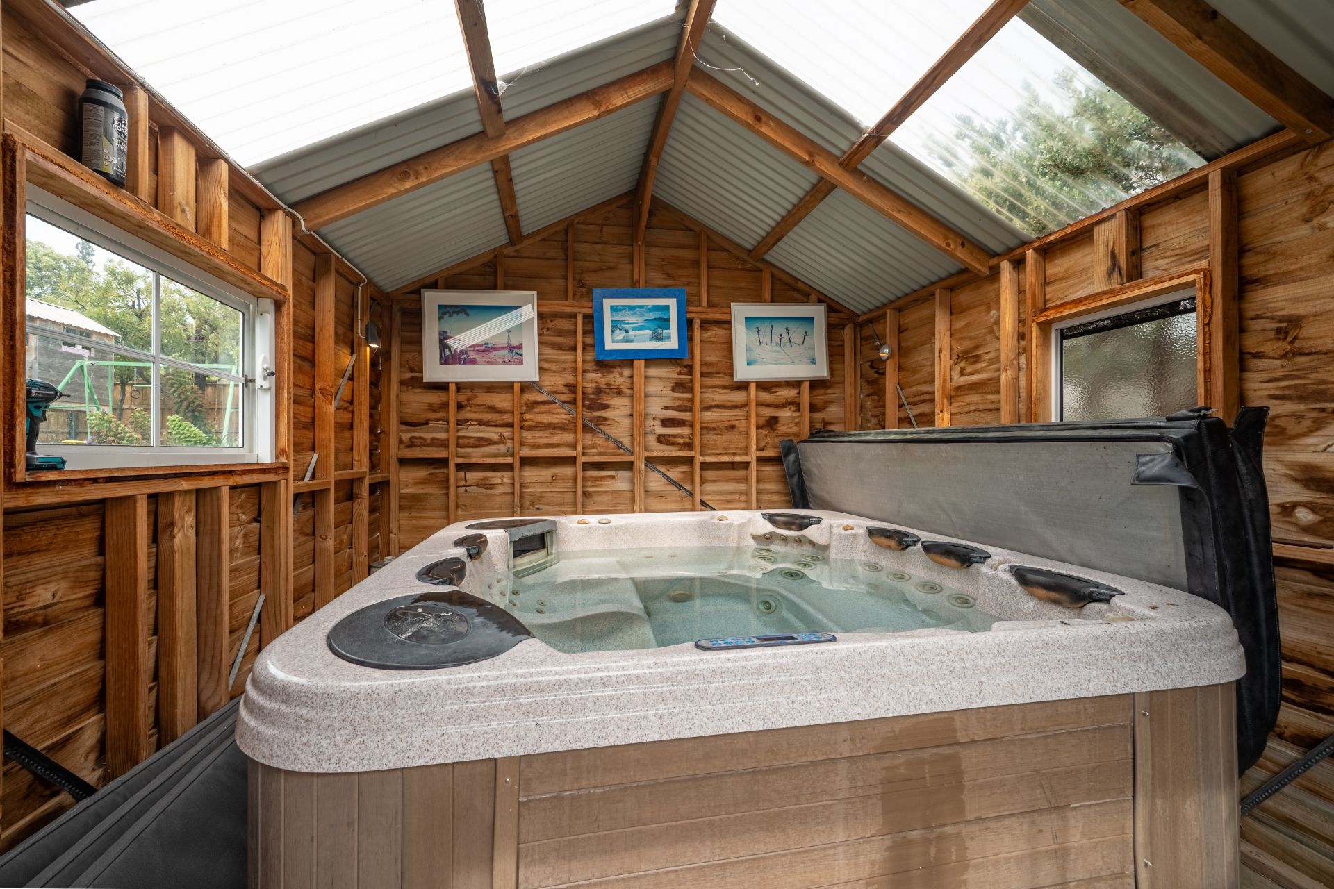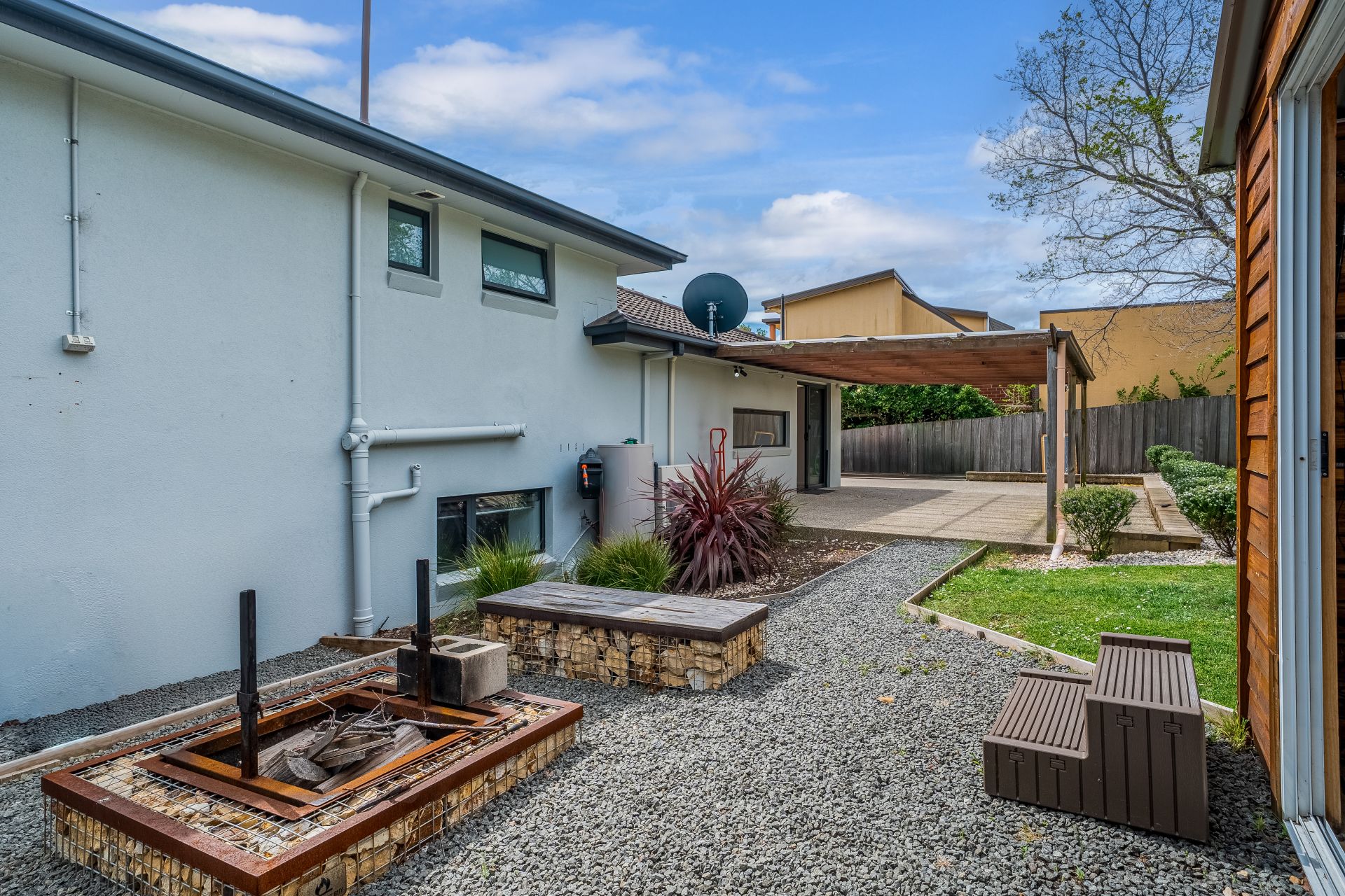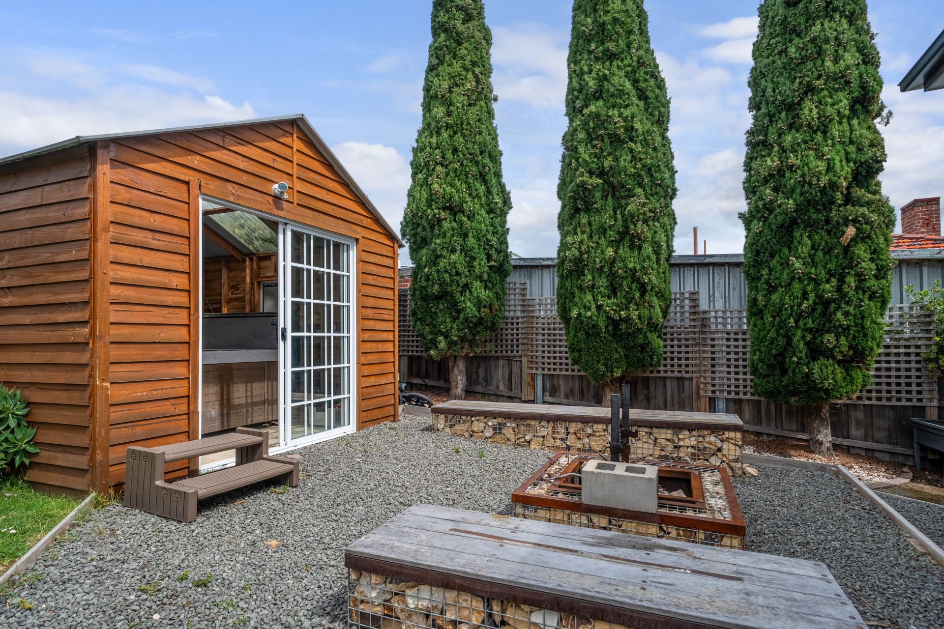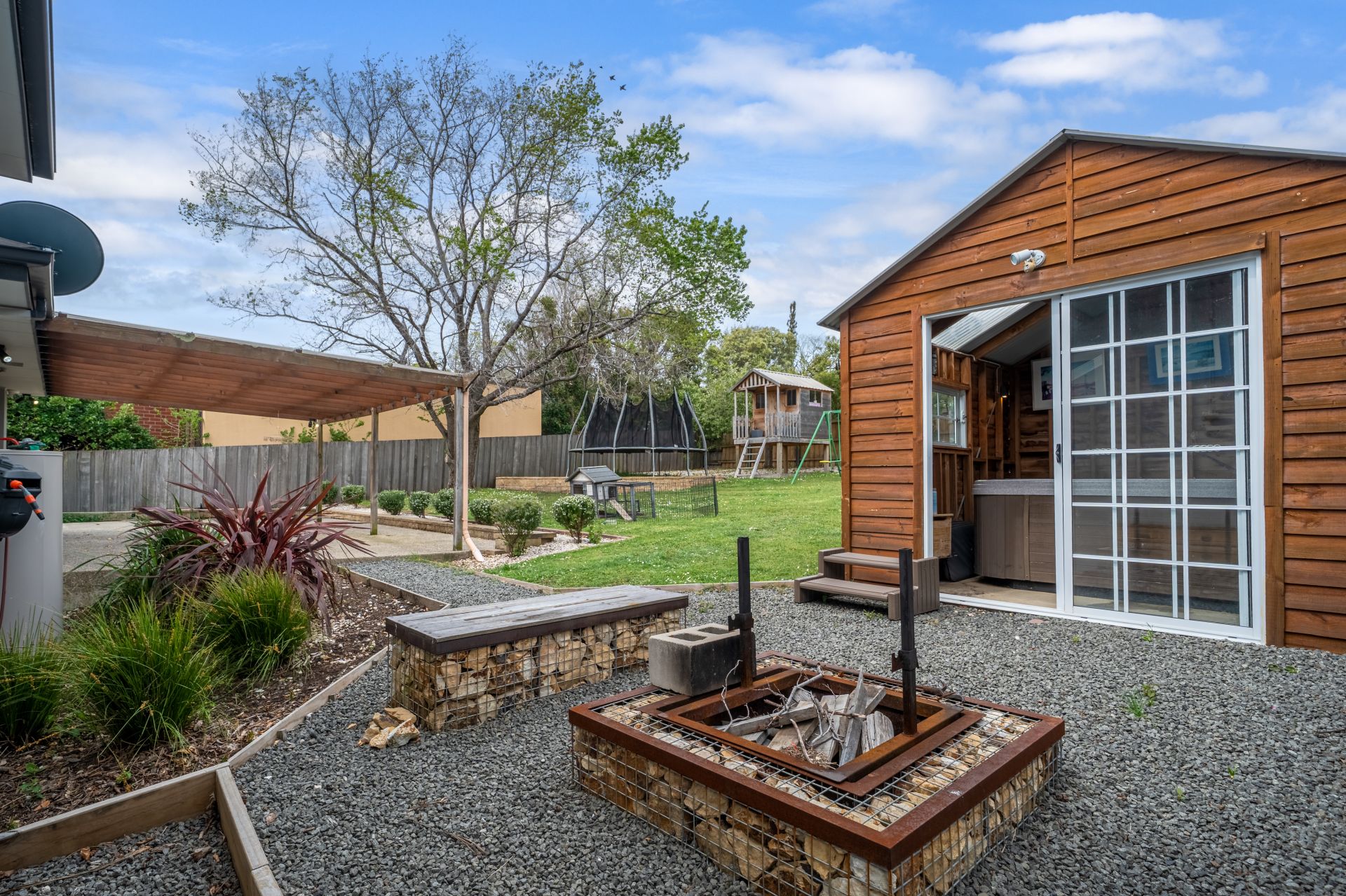 The outdoor entertaining area is where this home truly shines. A large undercover space connects seamlessly to landscaped gardens, creating the perfect spot for weekend barbecues or long summer lunches. The firepit area and outdoor spa house add that extra touch of luxury, making every evening feel like a holiday at home.