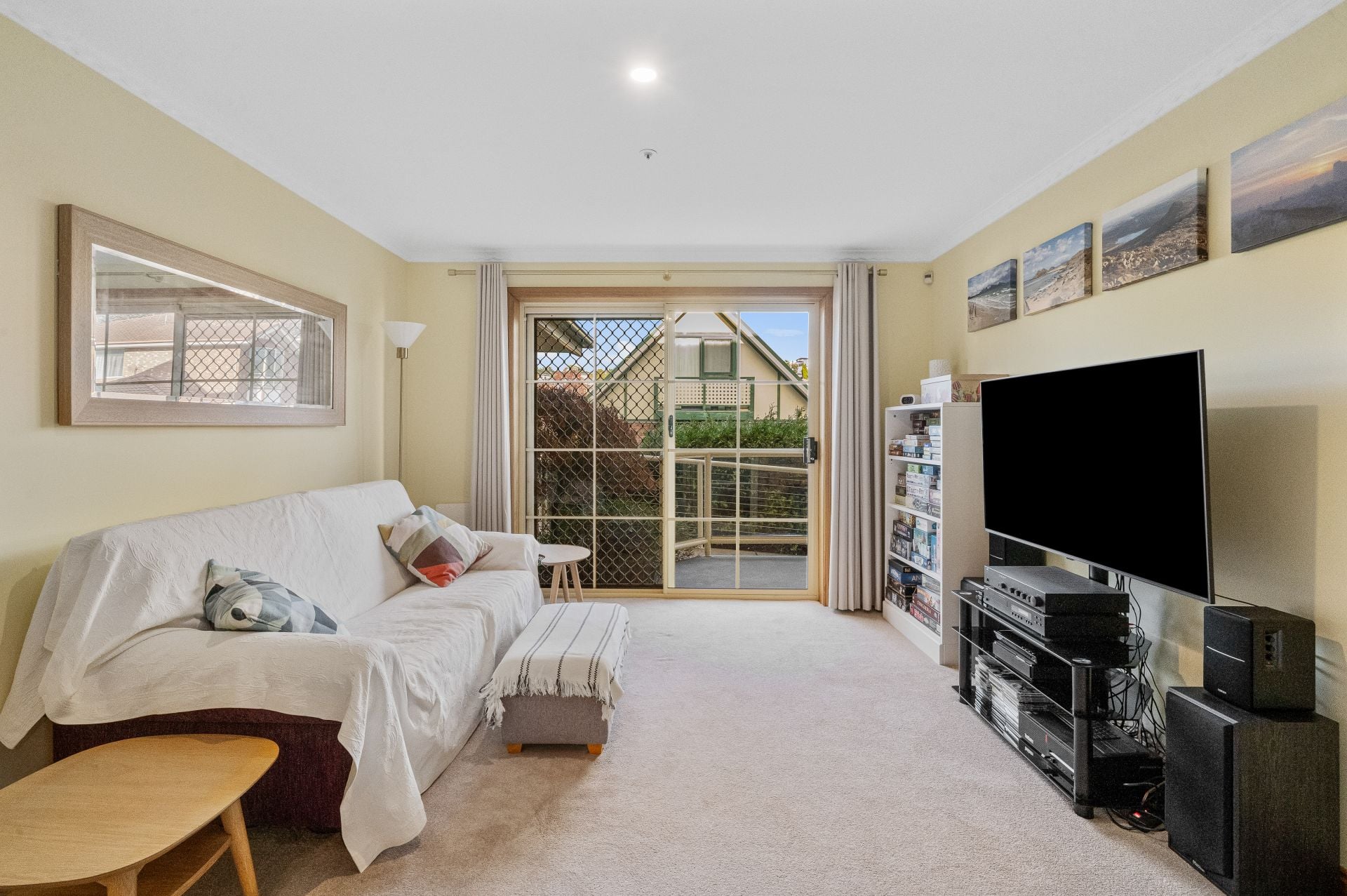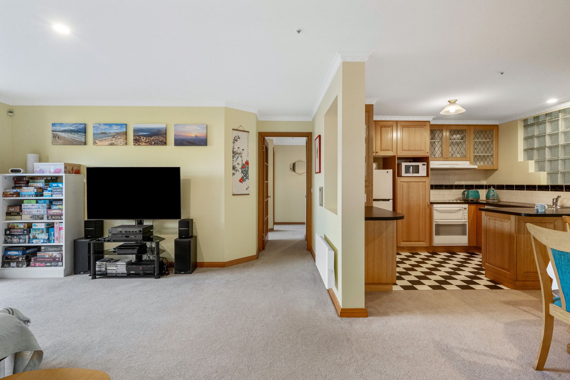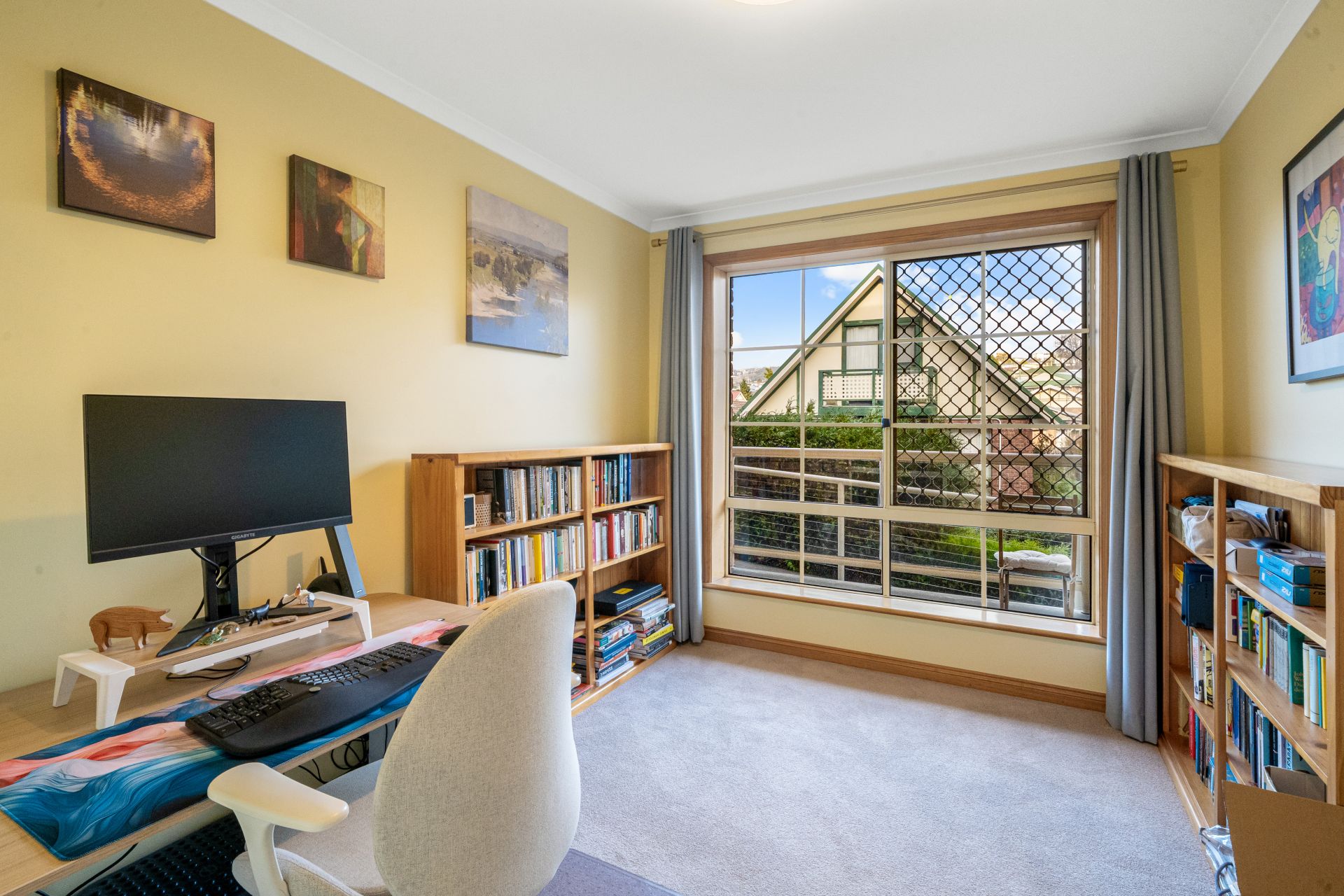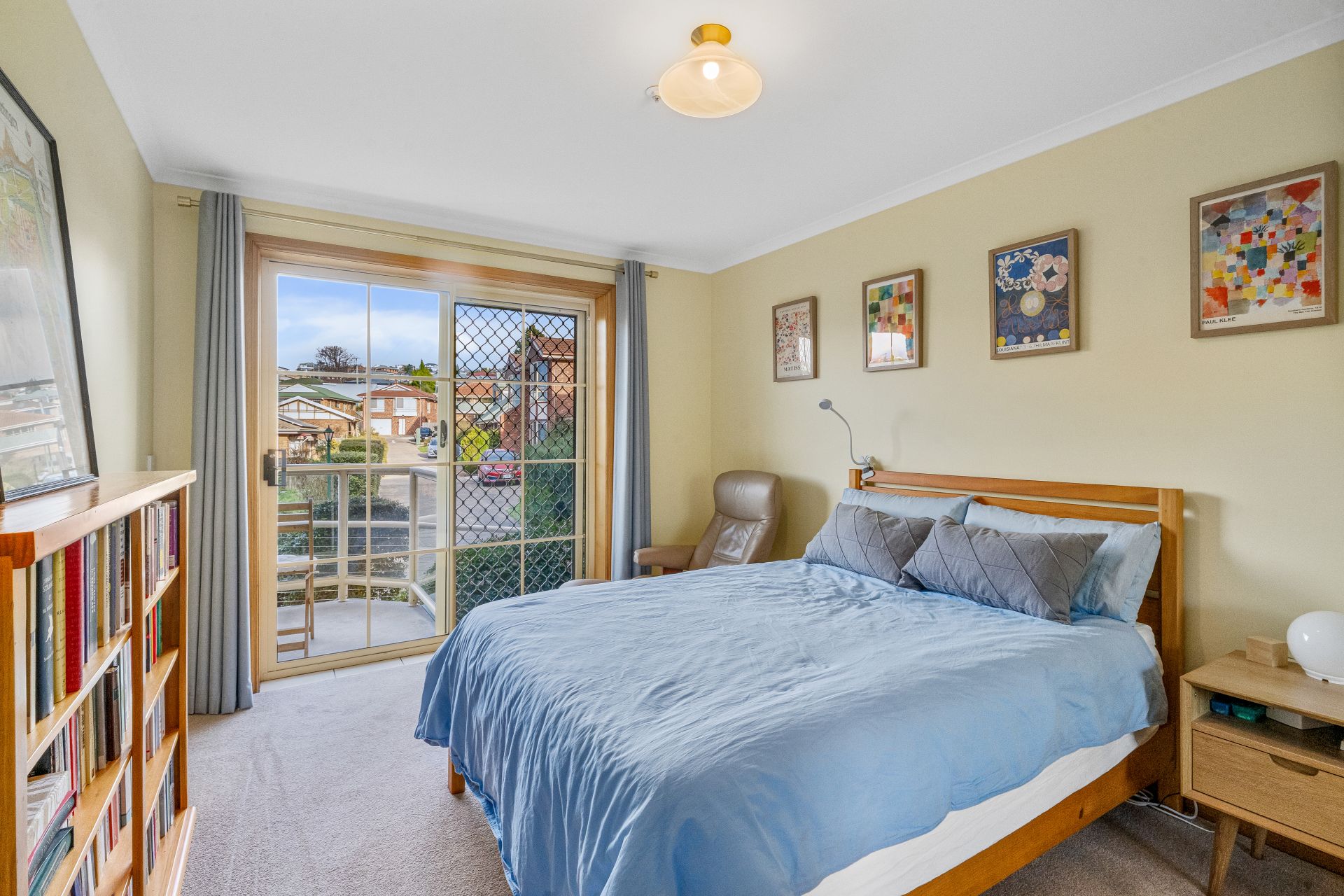 The bright main bedroom has a generous walk-in wardrobe and opens to the private balcony where you can savour views of kunanyi Mt Wellington. The second bedroom would make for a perfect study/hobby room with lots of natural light.