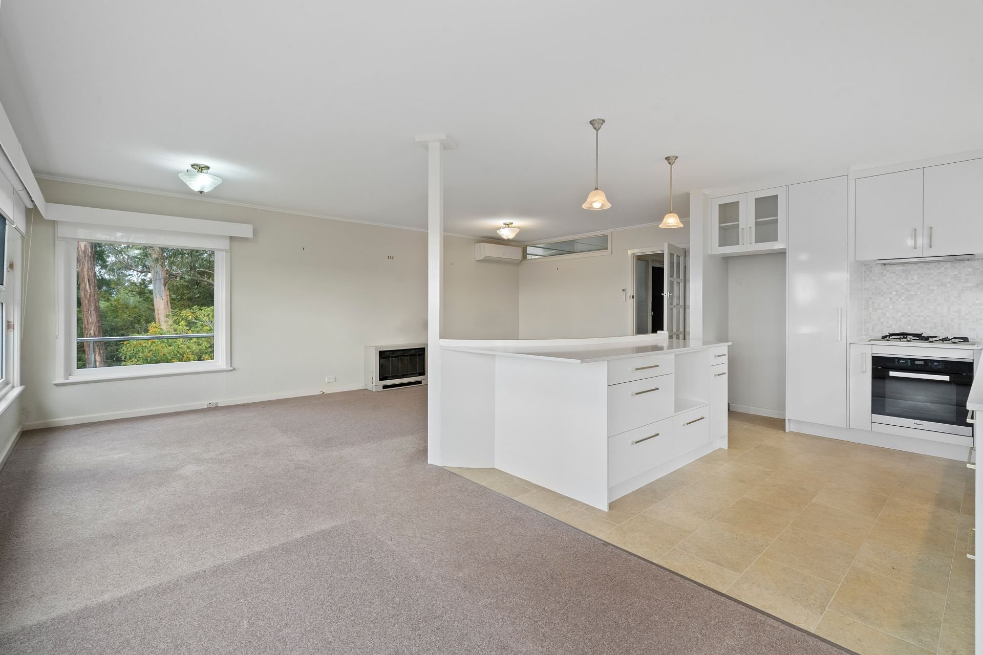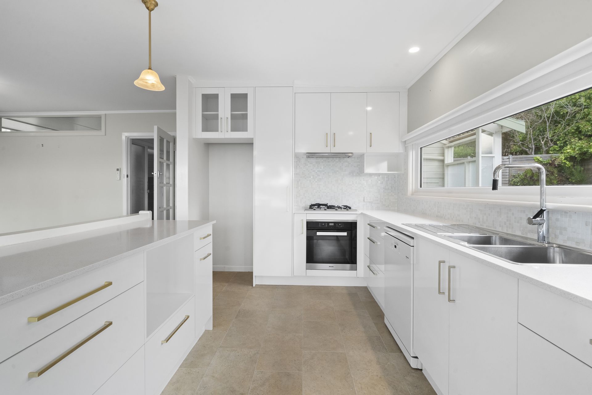 Across from the main living area is the kitchen that’s as functional as it is beautiful. This light-filled, contemporary space features sleek cabinetry, full size window splashback, high quality appliances including a dishwasher, and ample bench space — perfect for preparing meals or entertaining guests.