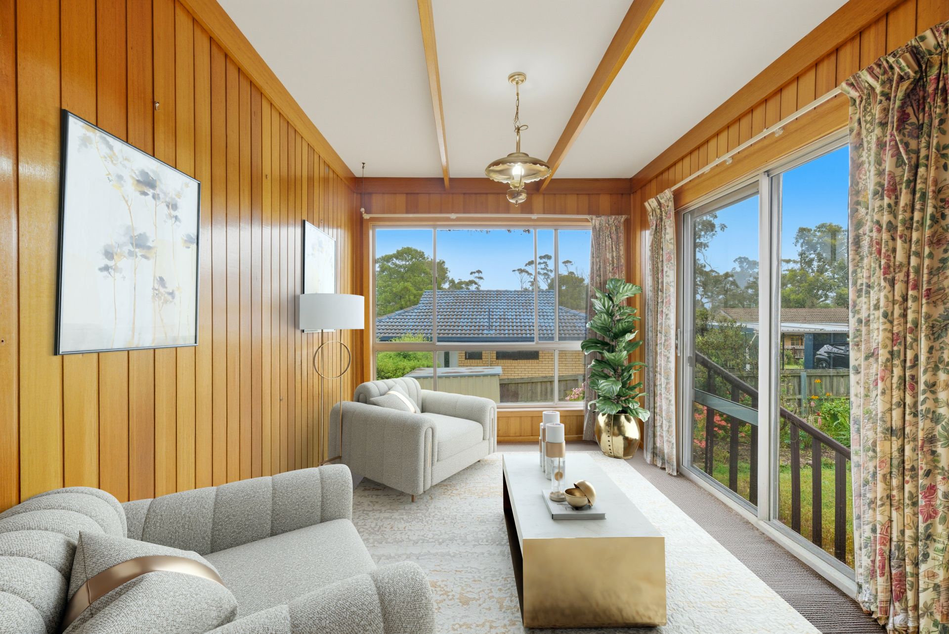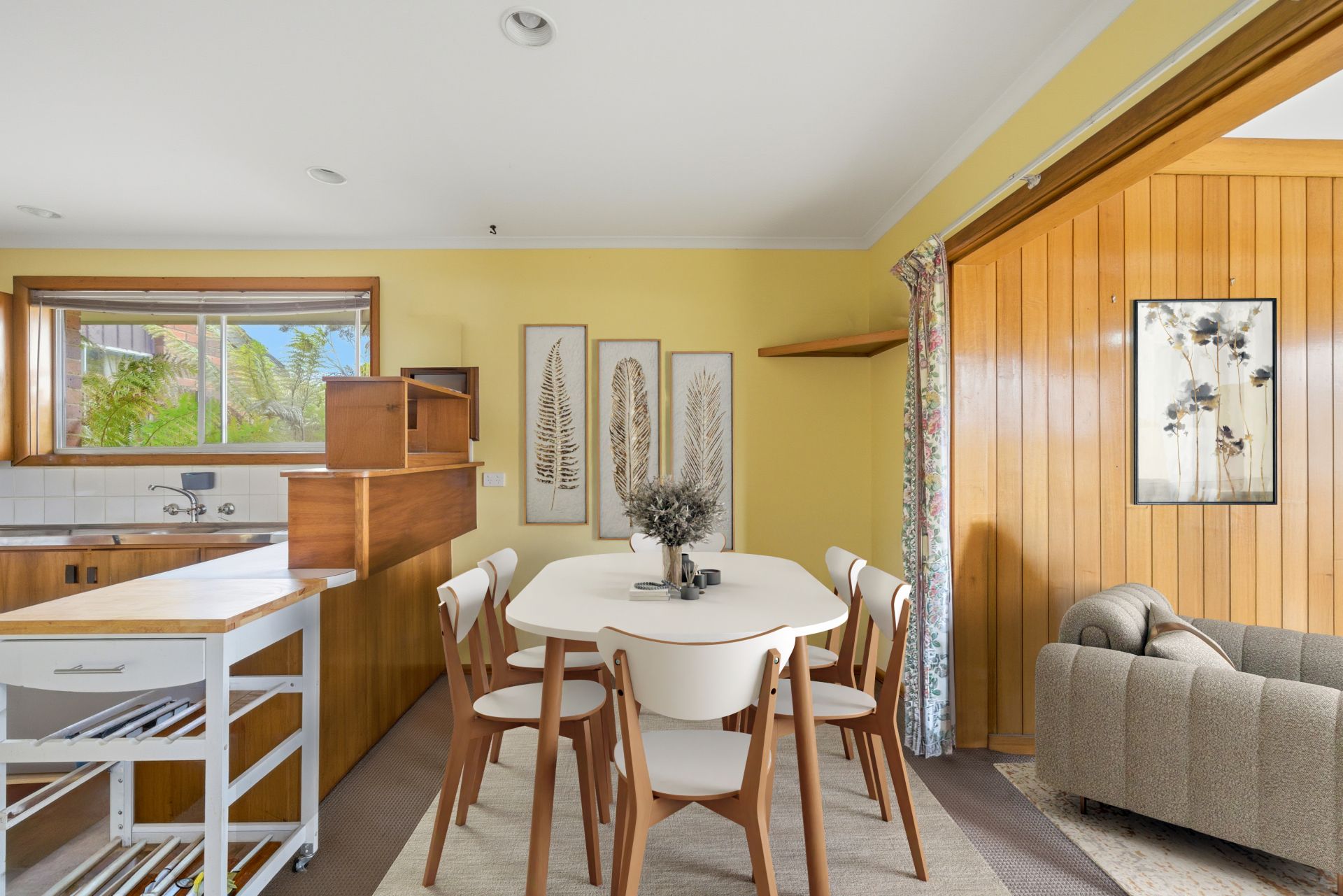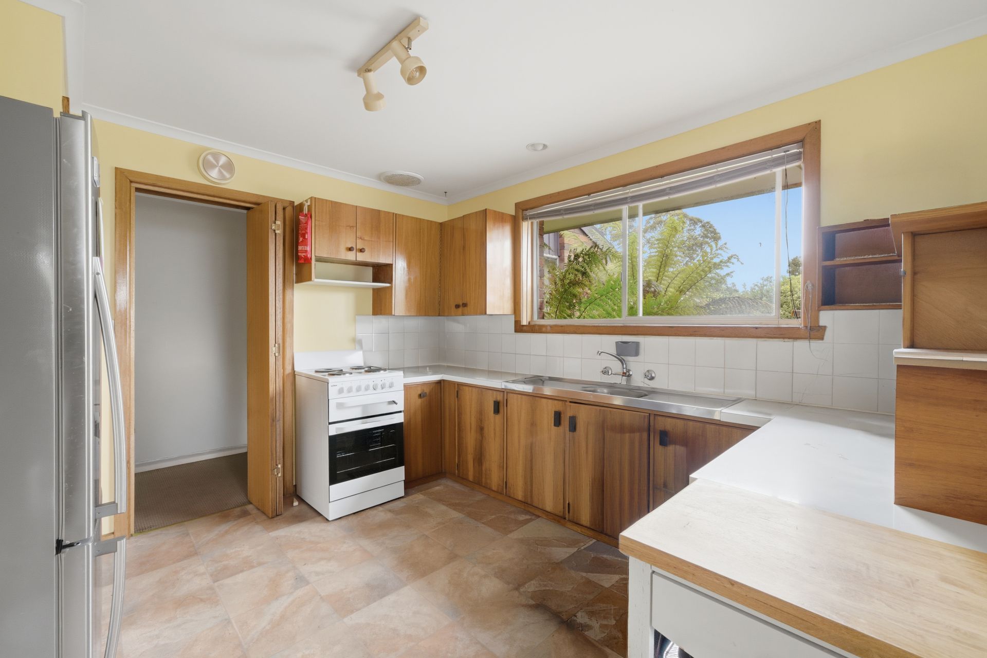 The main living room is filled with natural light, enjoying dual aspects and tranquil garden views. It connects seamlessly to the dining space and a well-maintained timber kitchen, complete with ample bench space and electric cooking. Just off the dining and kitchen area is a bright sunroom a perfect spot to relax with a book, enjoy your morning coffee, or create a light-filled play or hobby space. A recently renovated bathroom adds a fresh, modern touch, featuring a separate shower and a freestanding bathtub.
