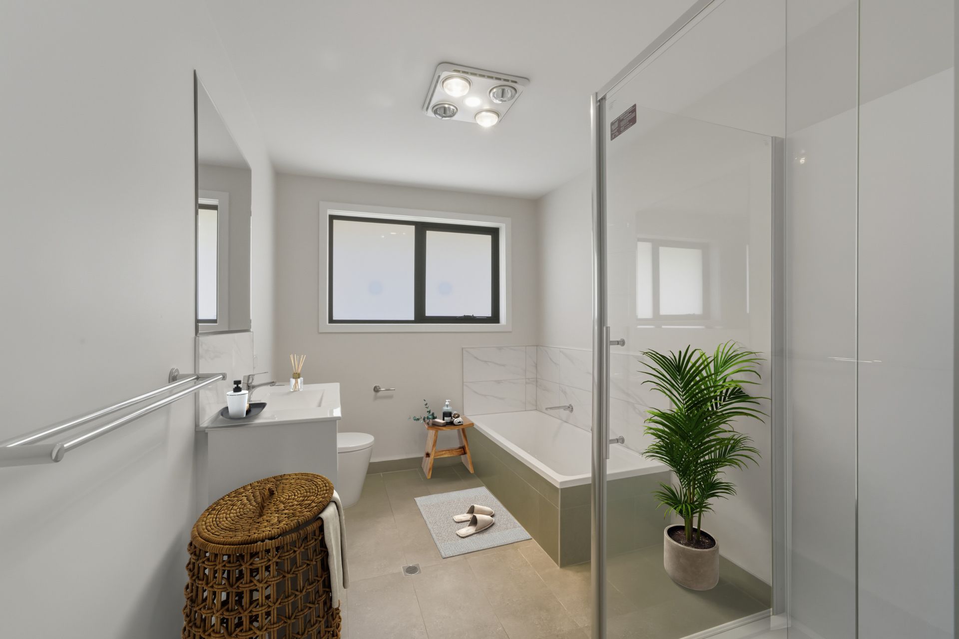 The home offers three generous double bedrooms, all fitted with built-in wardrobes. The master bedroom is well appointed with its own ensuite, while the remaining bedrooms are serviced by a beautifully oversized four-piece family bathroom. A European laundry is neatly tucked away off the hallway, complemented by excellent linen storage.
