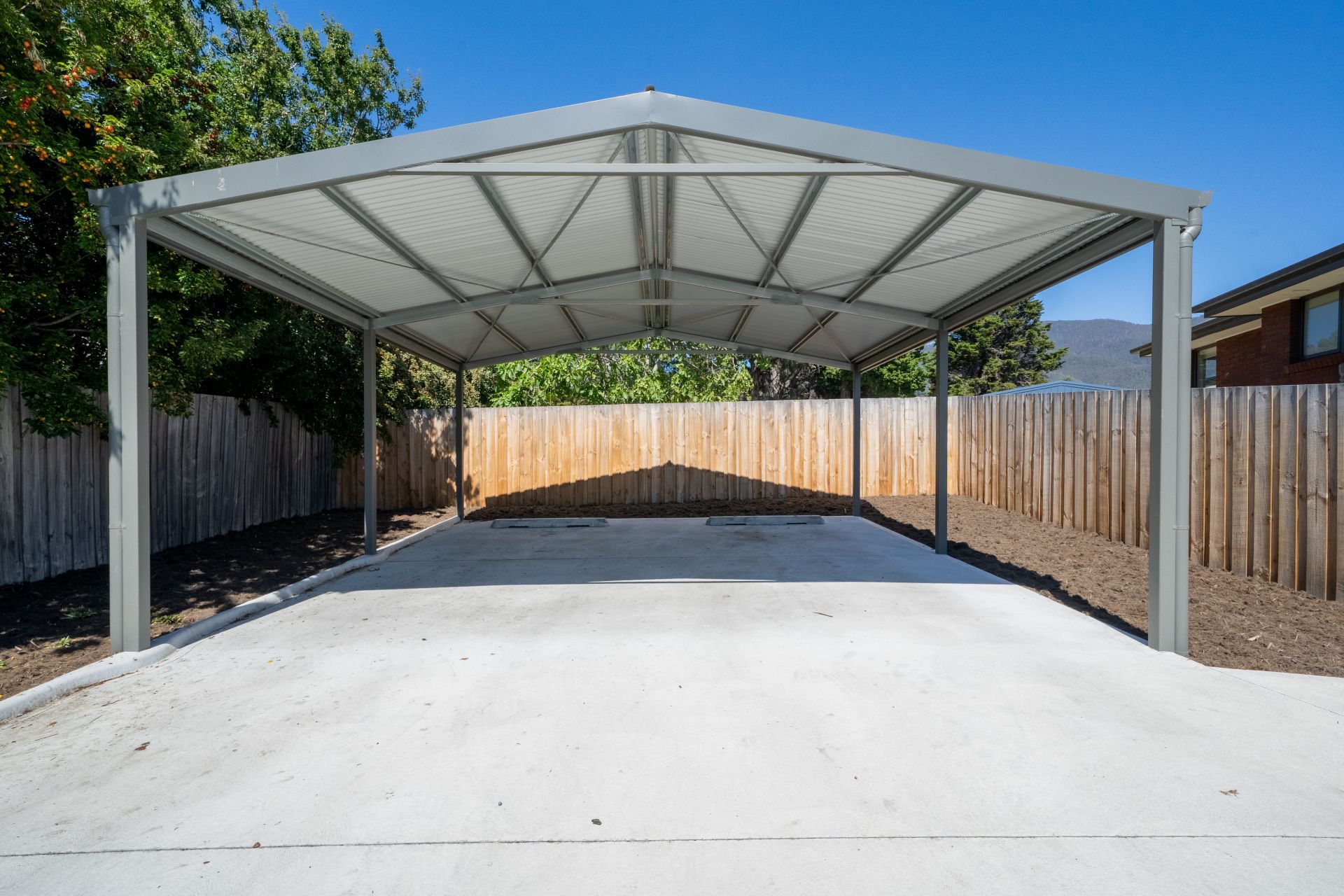 Sliding doors extend the living space outdoors to a fully fenced yard anchored by a stunning mature walnut tree that adds character and shade. Parking for two vehicles is provided via a double carport.