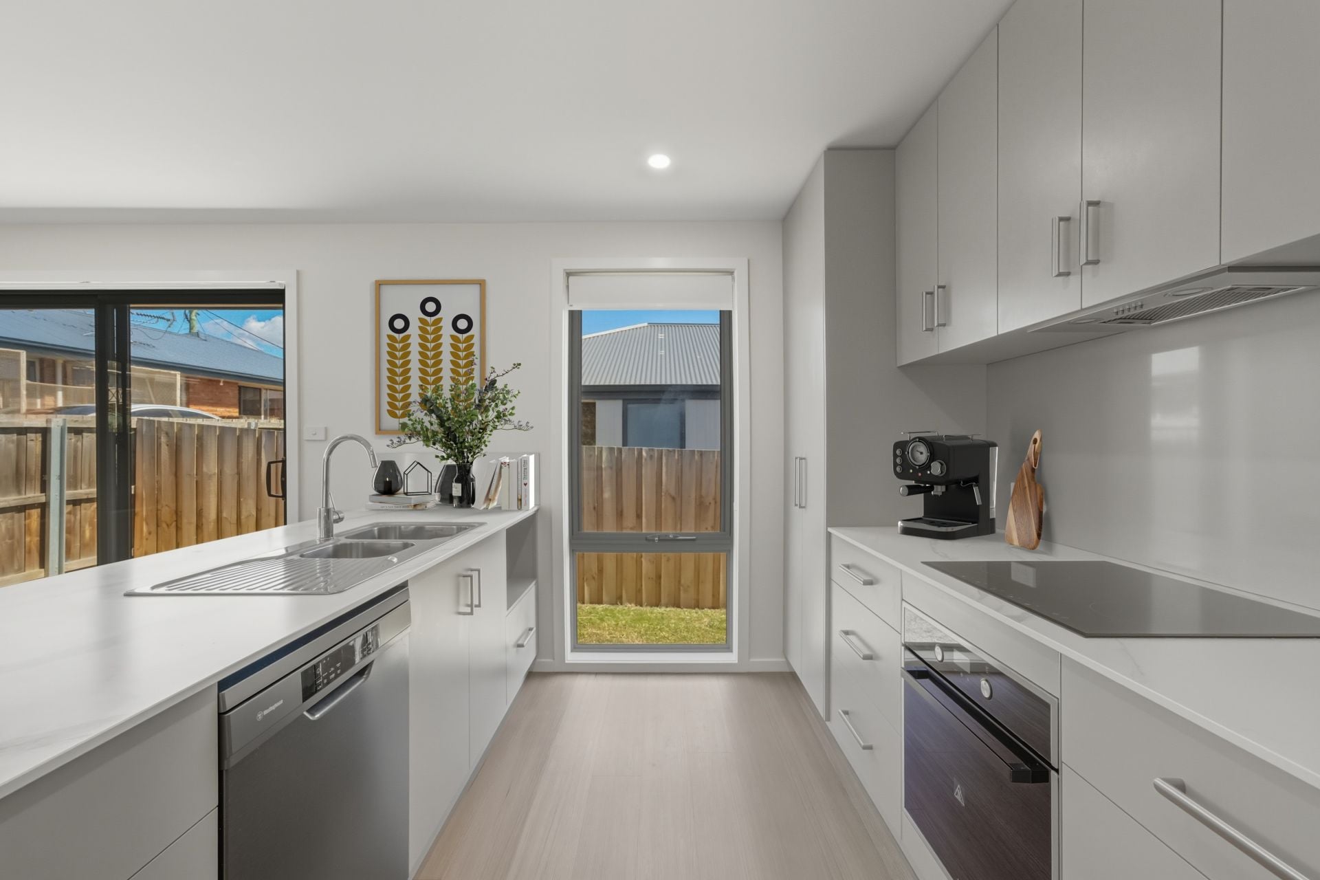 At the heart of the home, a large open-plan living zone is flooded with natural light thanks to triple-aspect windows, creating a bright and welcoming space for everyday living and entertaining. The galley-style kitchen is both practical and stylish, featuring soft-close drawers, abundant cupboard space and a handy dishwasher.