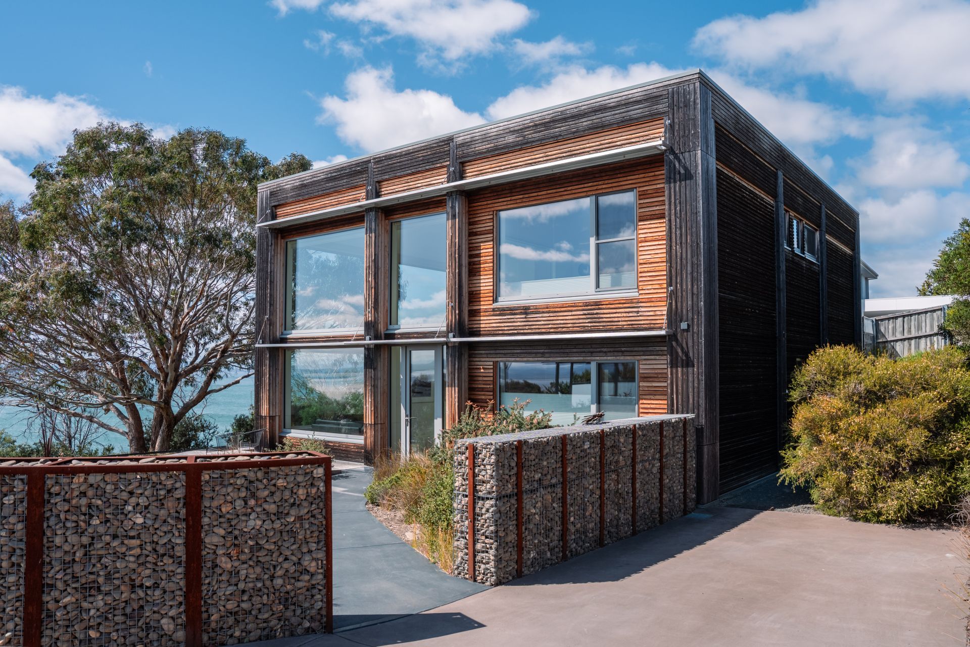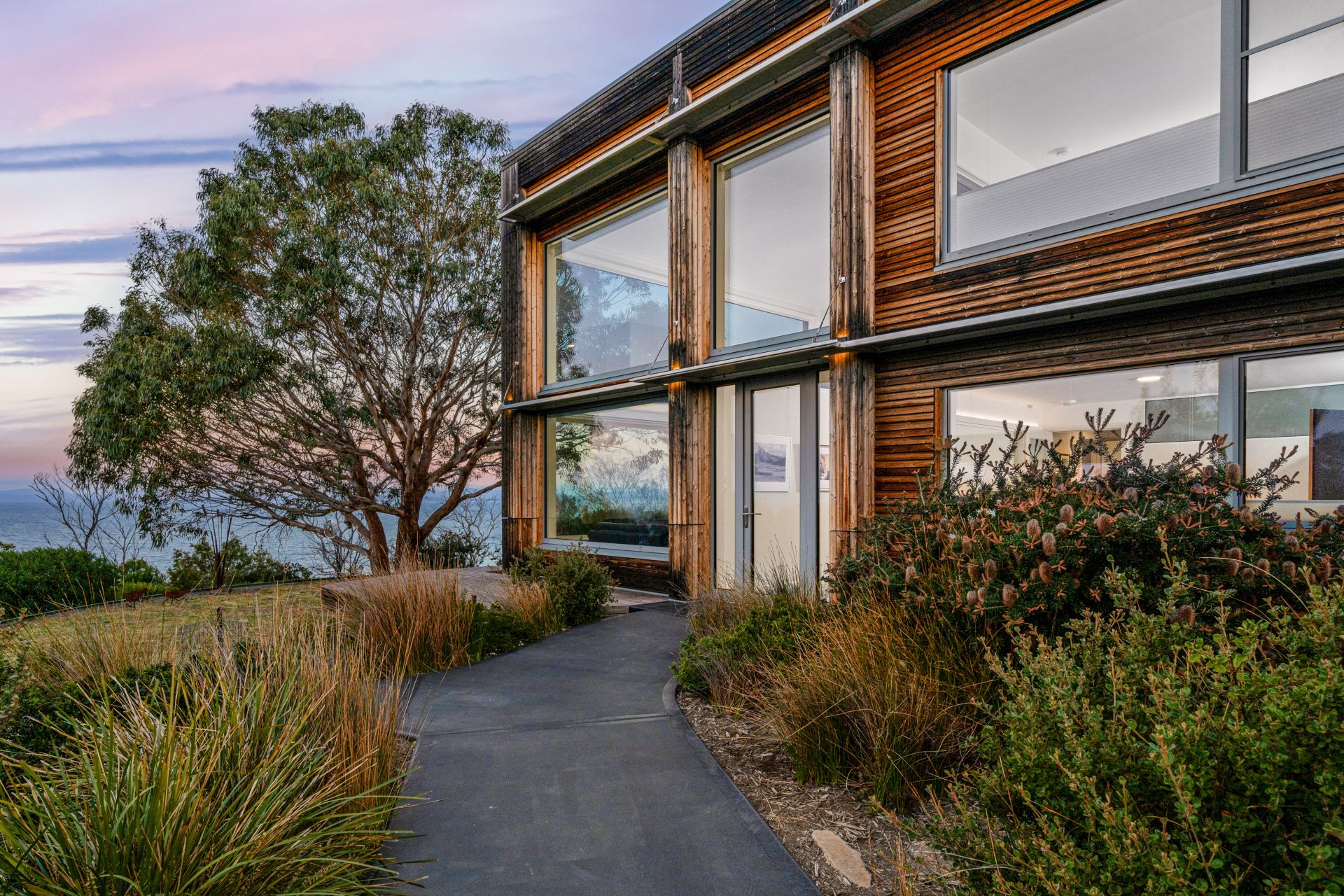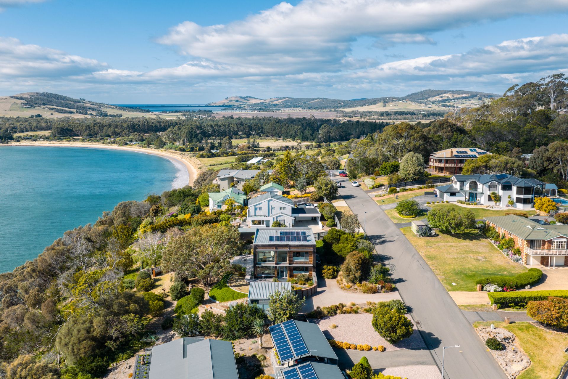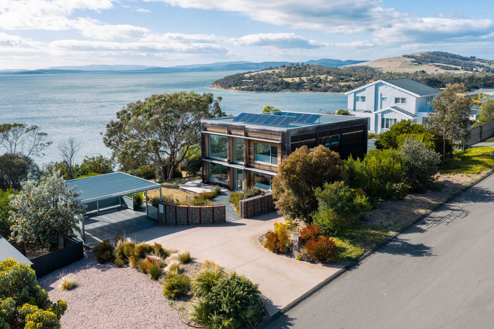 This extraordinary residence offers something few properties in Tasmania or indeed anywhere can claim — effortless, year-round comfort in a stunning waterfront setting. Architecturally iconic and individually crafted, this triple-award-winning home is a true haven that pairs breathtaking design with daily ease and serenity. Perched between two beaches at the exclusive end of Bayside Drive, it combines minimalist beauty with nature's grandest show: 180-degree sweeping water views from Sloping Main to Roches Beach, and the gentle sounds of waves and birdlife as your backdrop.