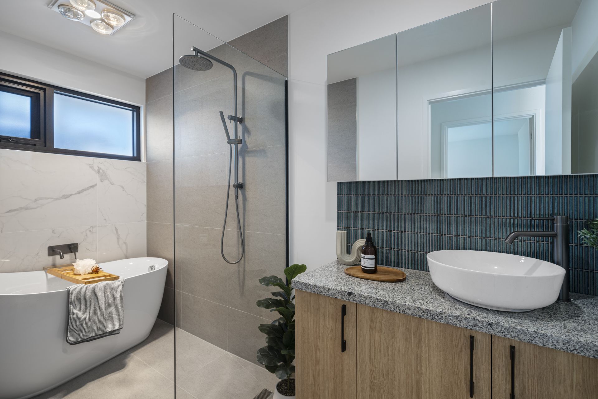 The spacious bathroom impresses with a luxurious wet area, featuring a combined shower and freestanding bath, offering a touch of indulgence.