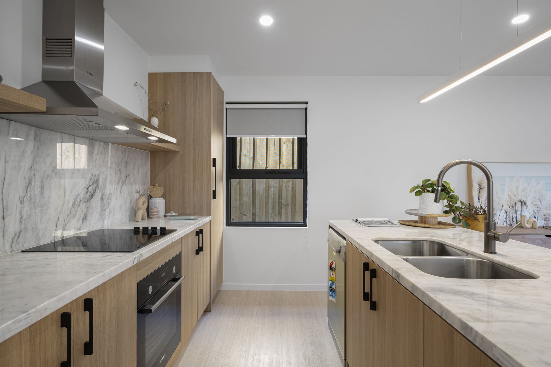 The modern kitchen is a standout feature, boasting timber and marble finishes, sleek cabinetry, and high-quality appliances, making meal prep a pleasure.