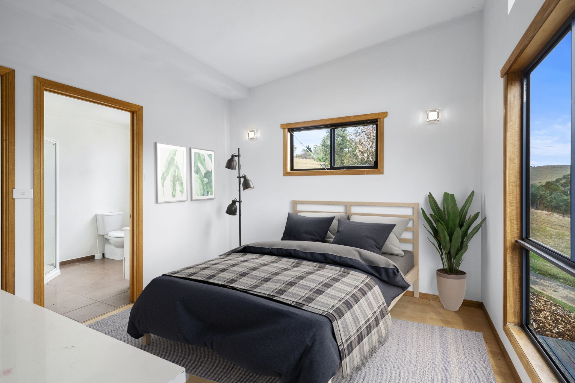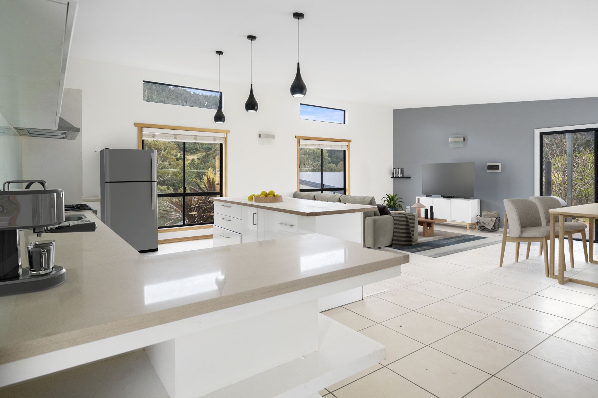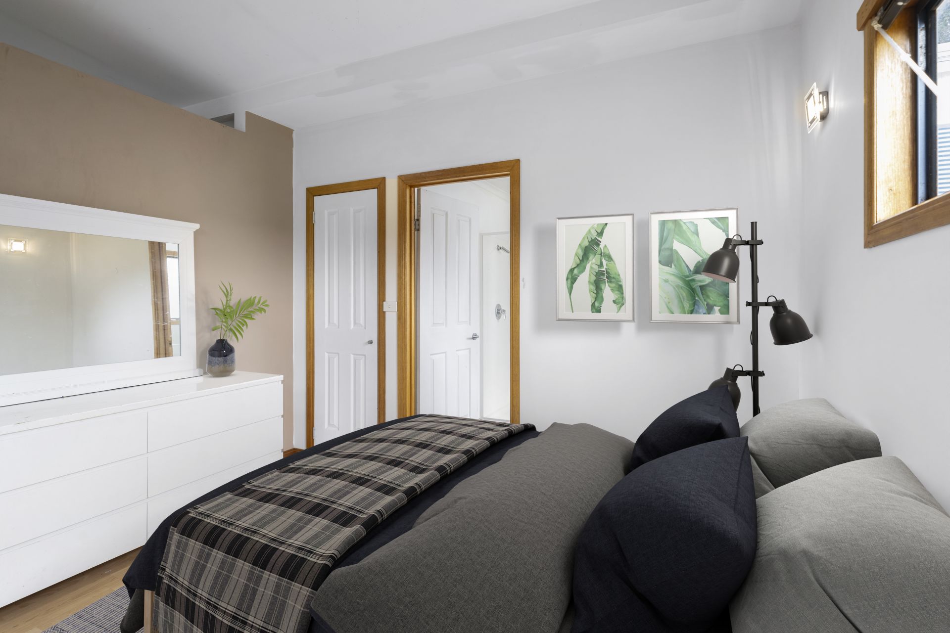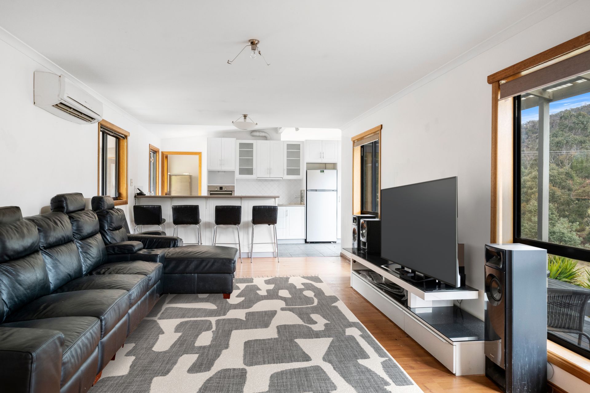 The first area of the home features a modern kitchen with high-end appliances, an open-plan lounge/dining area with a reverse cycle heat pump for climate control. In this area, there are two of the three bedrooms, with the main bedroom having an ensuite bathroom and built-in robes in each bedroom.