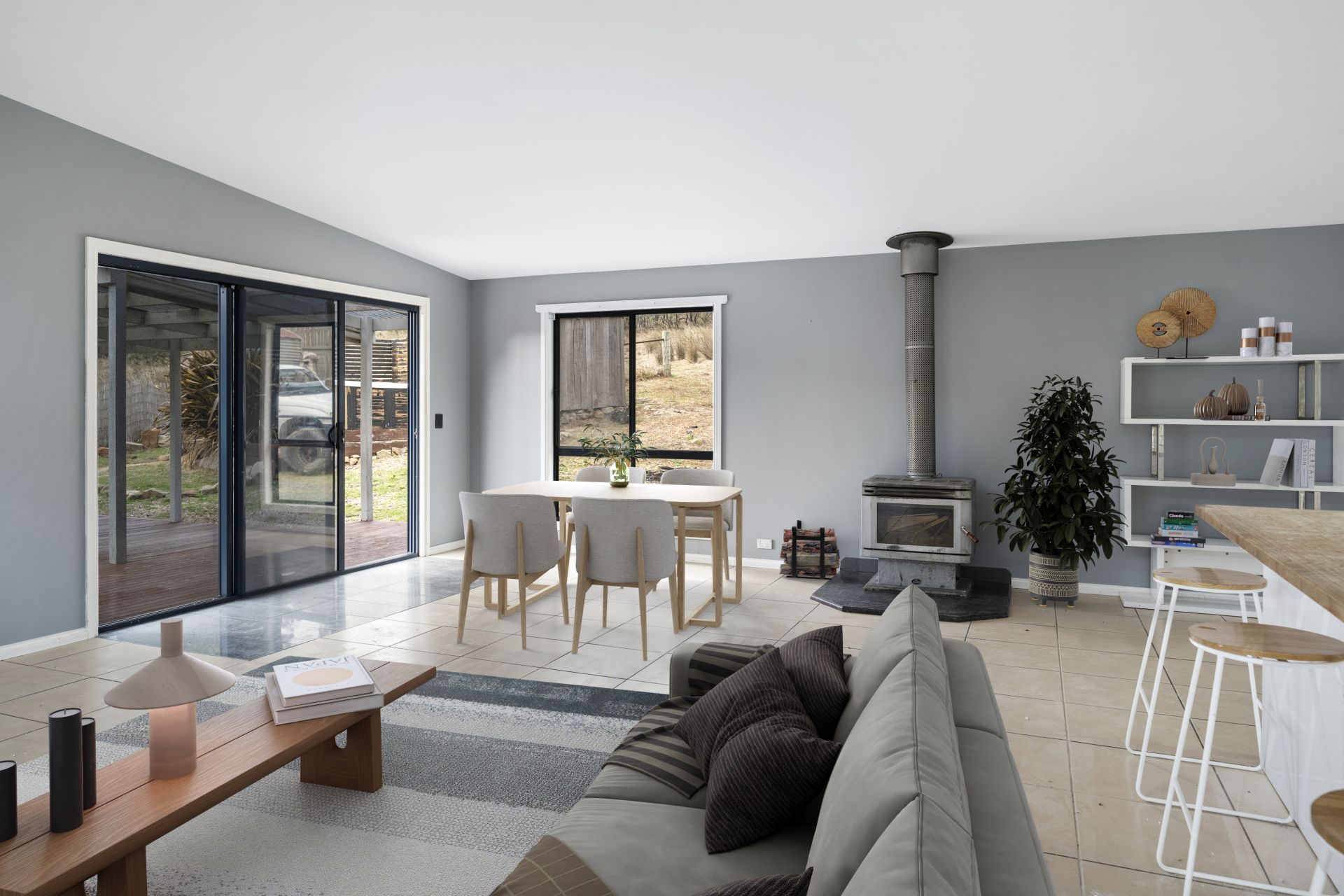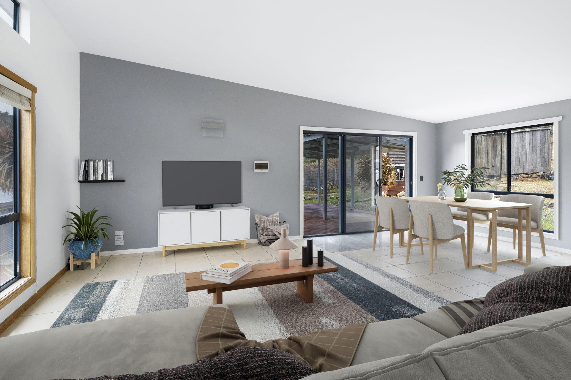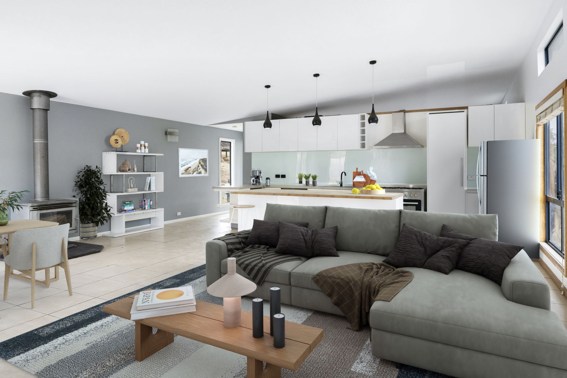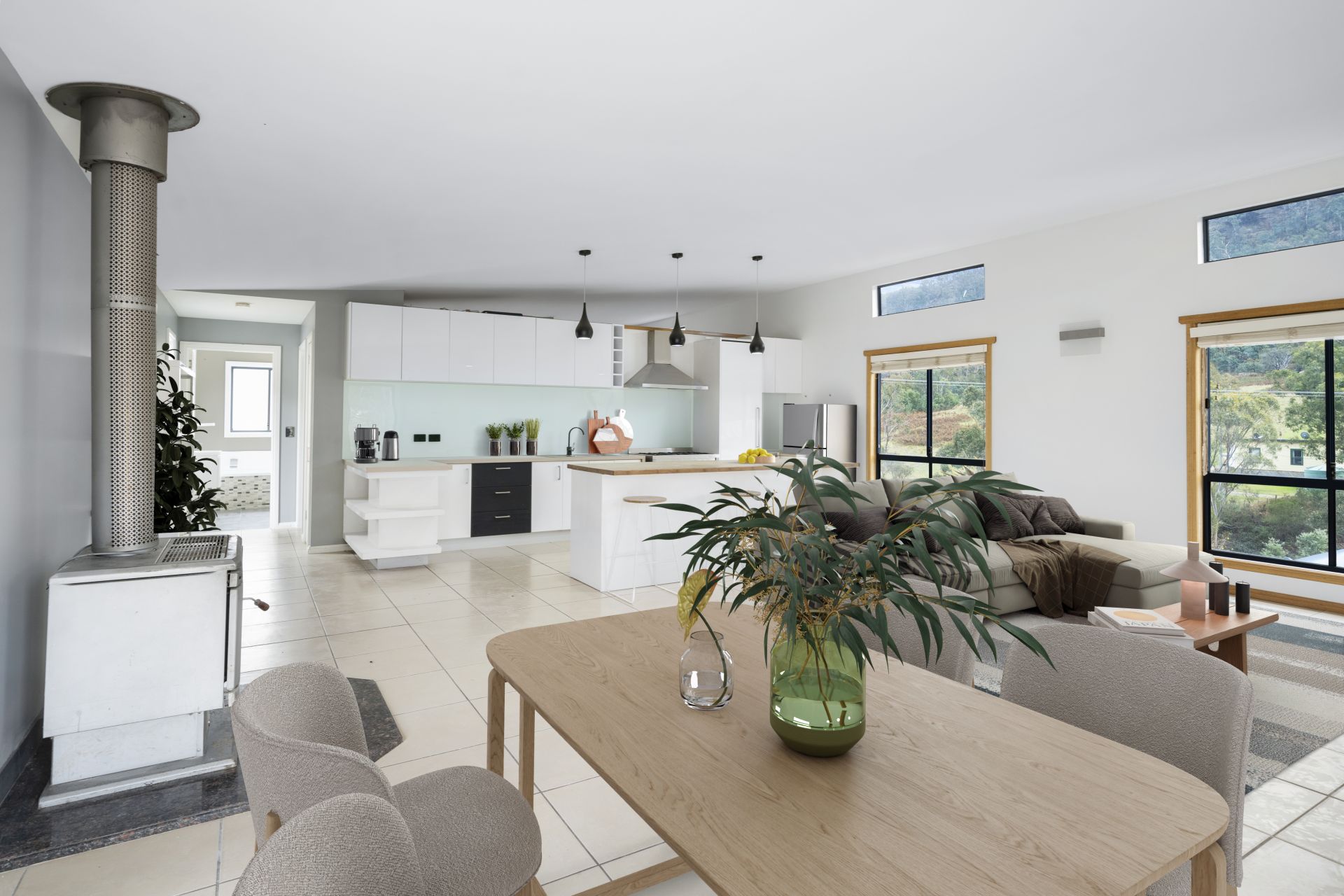 The first area of the home features a modern kitchen with high-end appliances, an open-plan lounge/dining area with a reverse cycle heat pump for climate control. In this area, there are two of the three bedrooms, with the main bedroom having an ensuite bathroom and built-in robes in each bedroom.