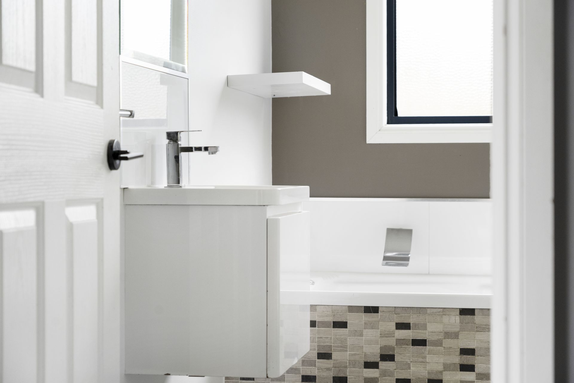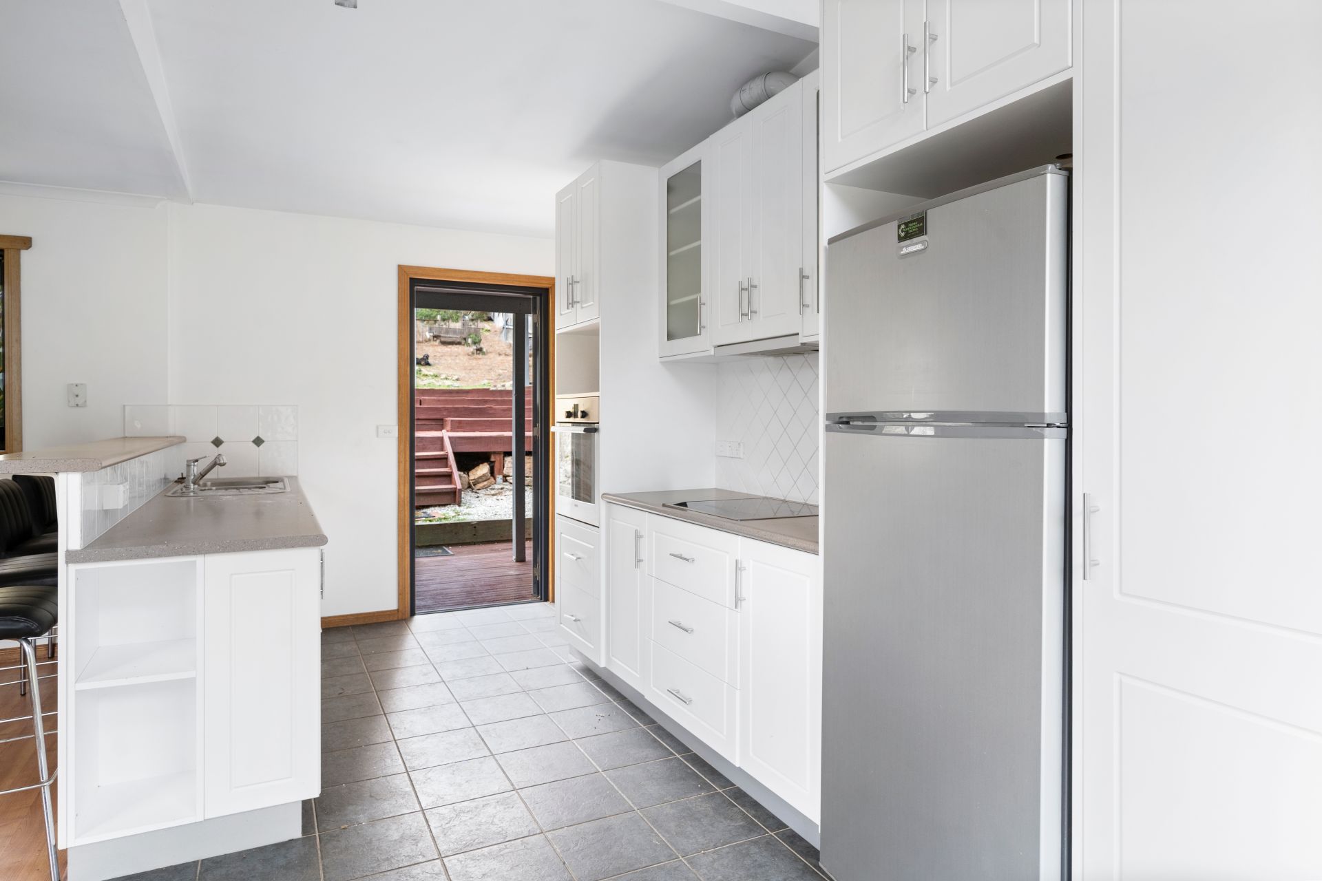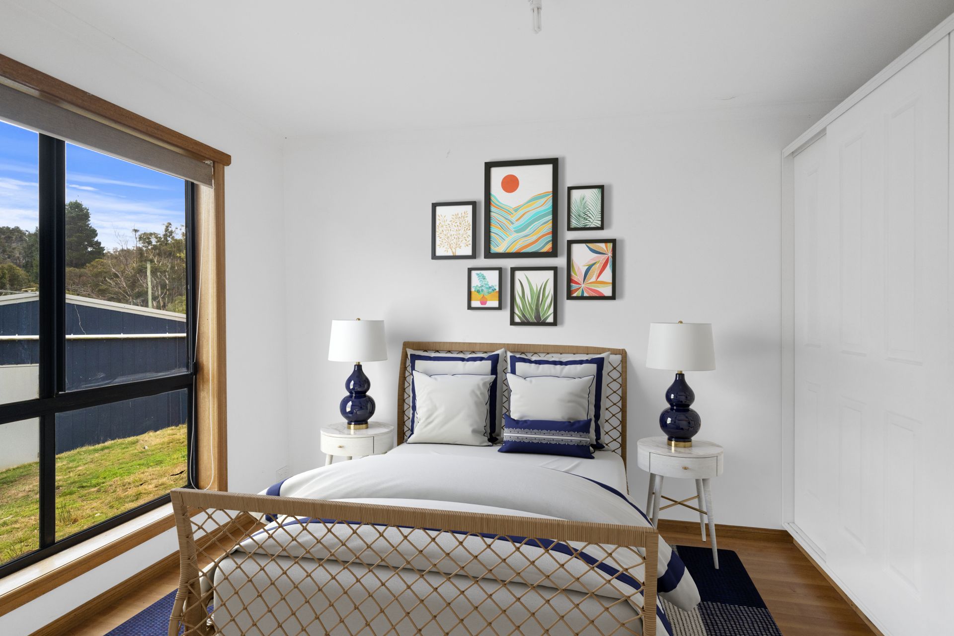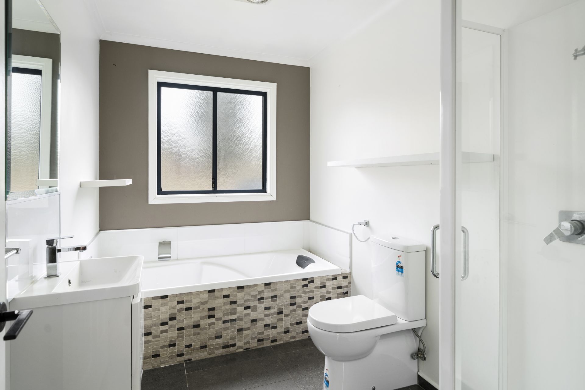 The first area of the home features a modern kitchen with high-end appliances, an open-plan lounge/dining area with a reverse cycle heat pump for climate control. In this area, there are two of the three bedrooms, with the main bedroom having an ensuite bathroom and built-in robes in each bedroom.