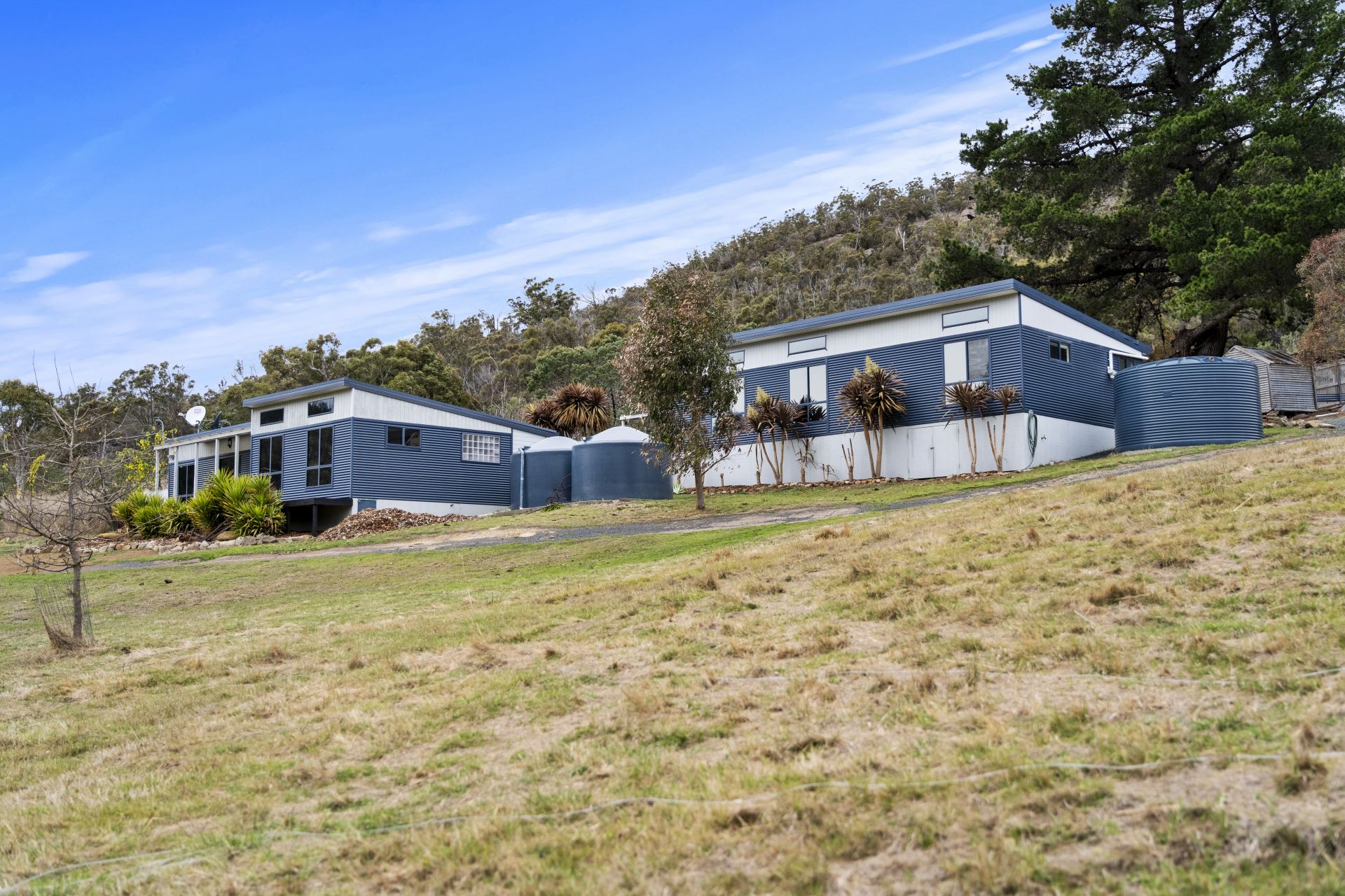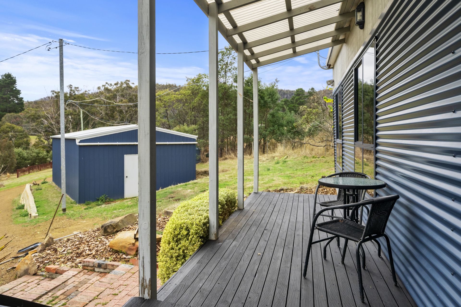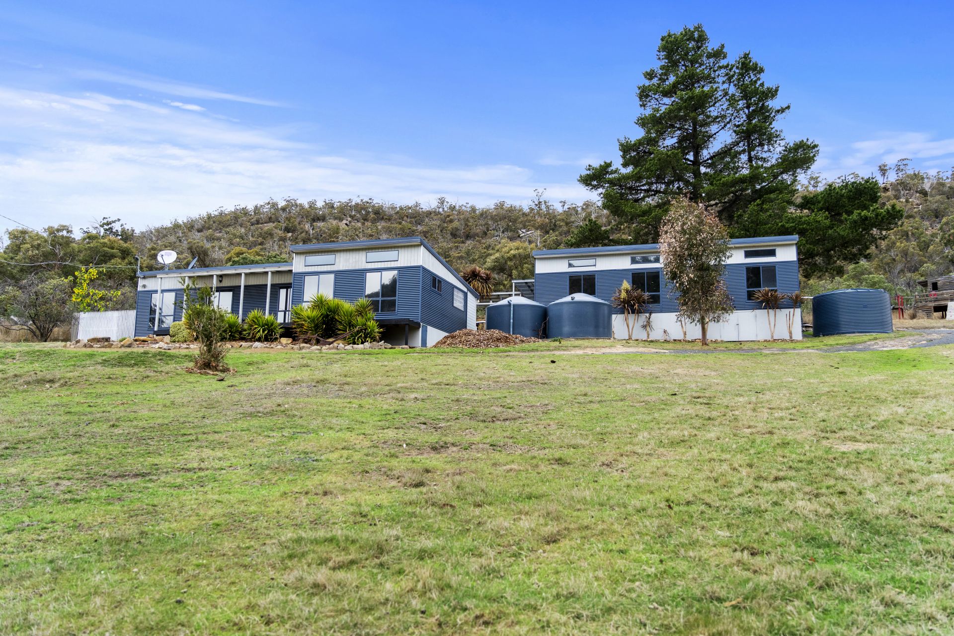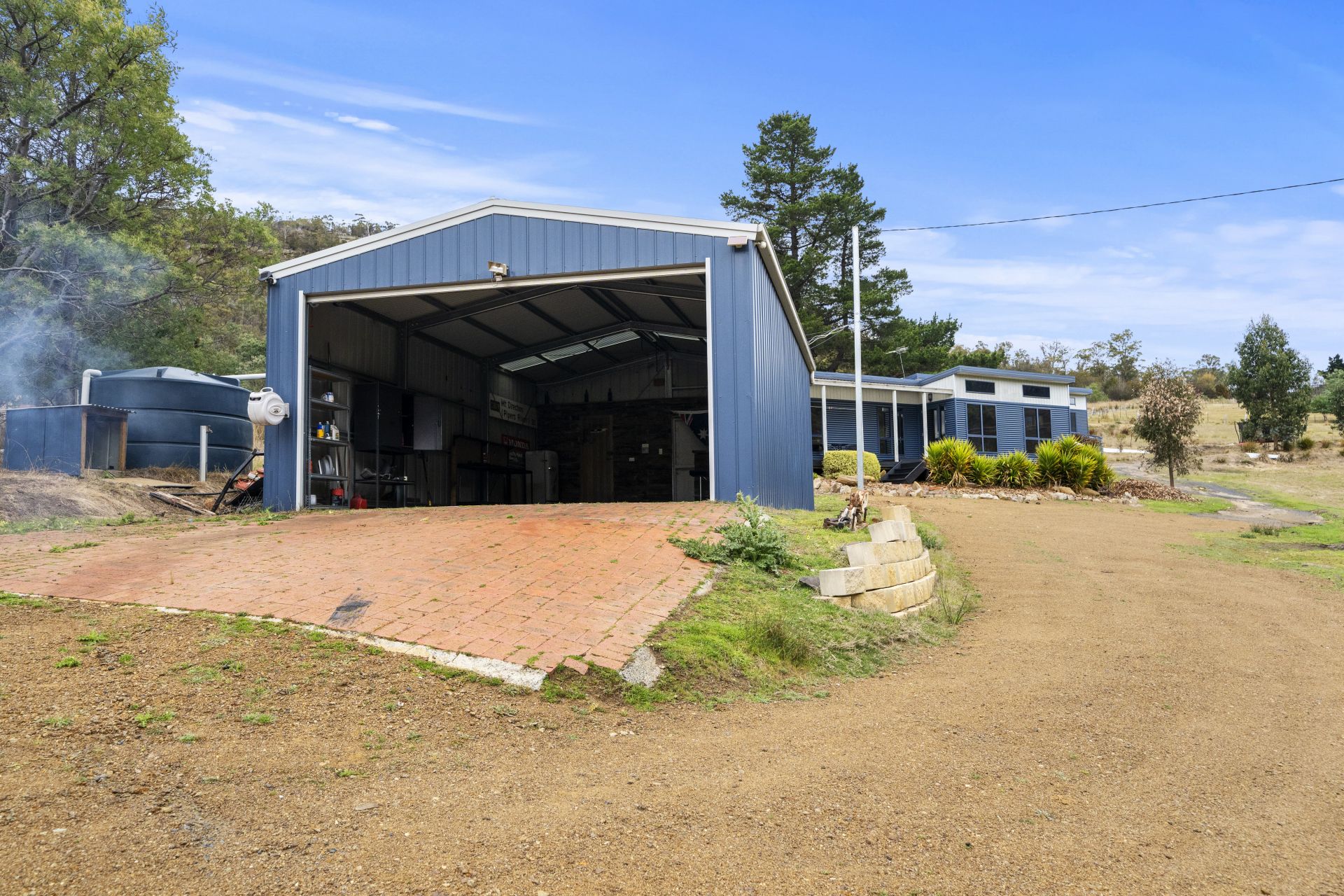 Various outbuildings on the property include a double garage with an automatic door, an original pickers hut, and a hay shed. These outbuildings can serve a variety of purposes, such as storage or workspace.