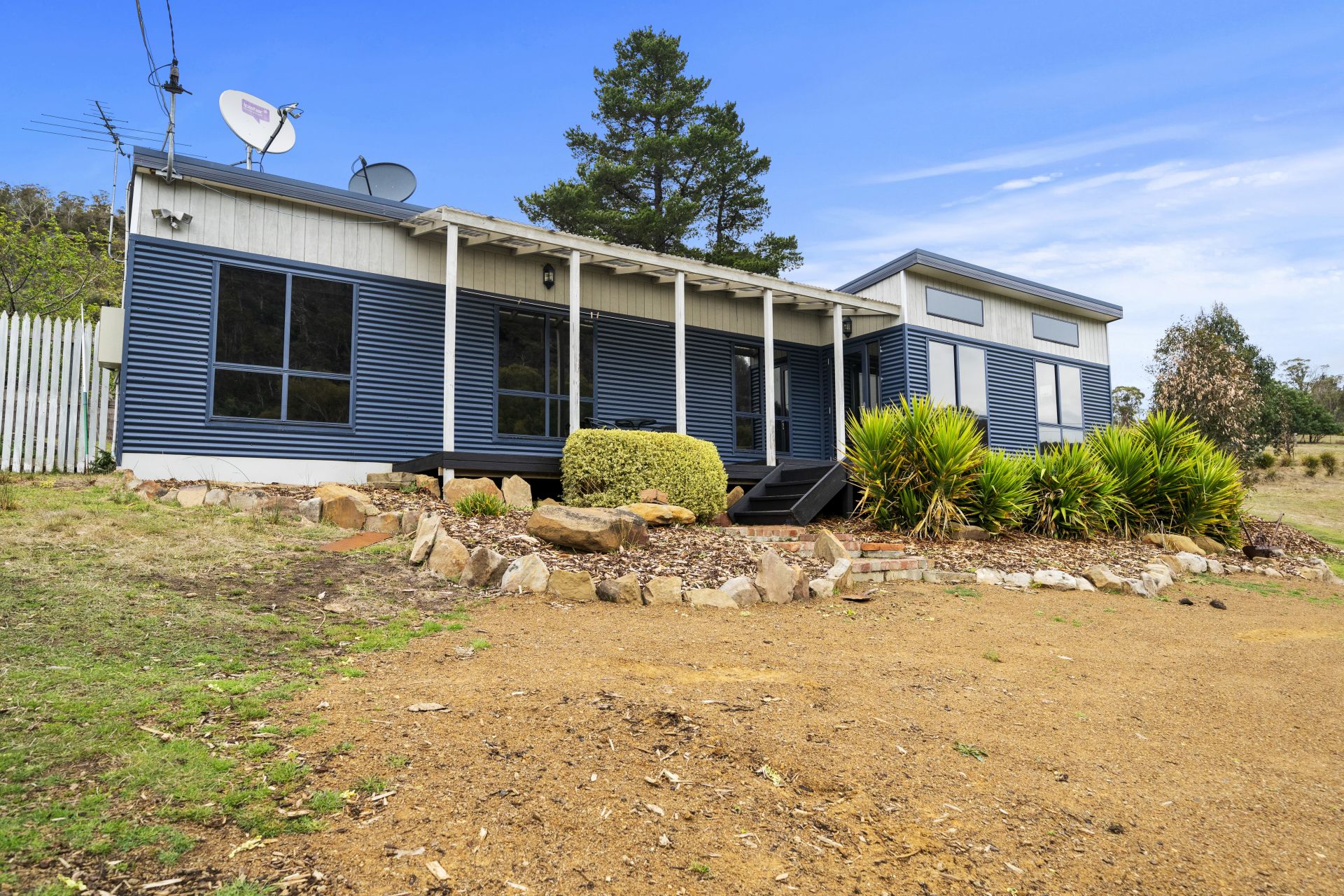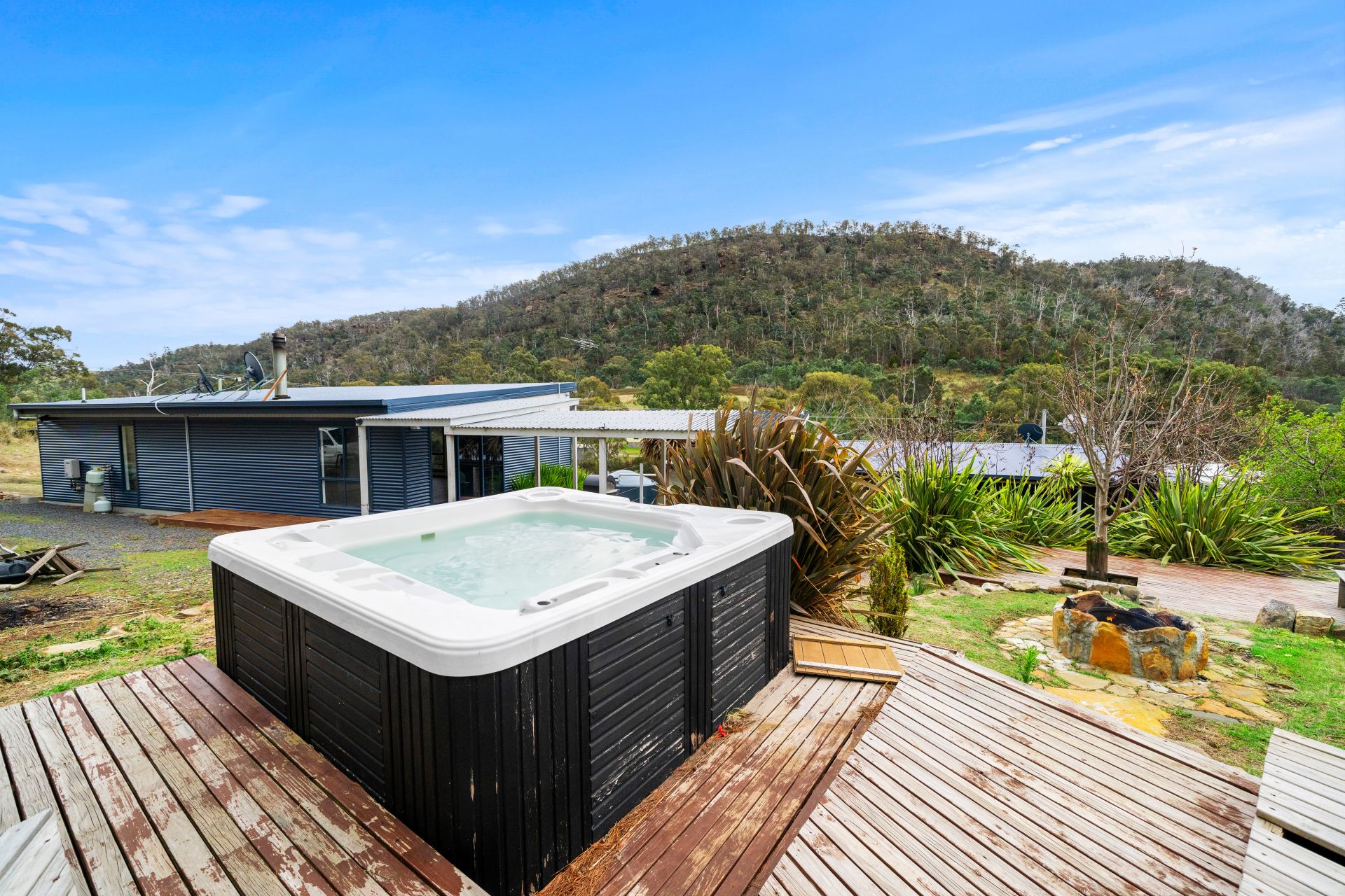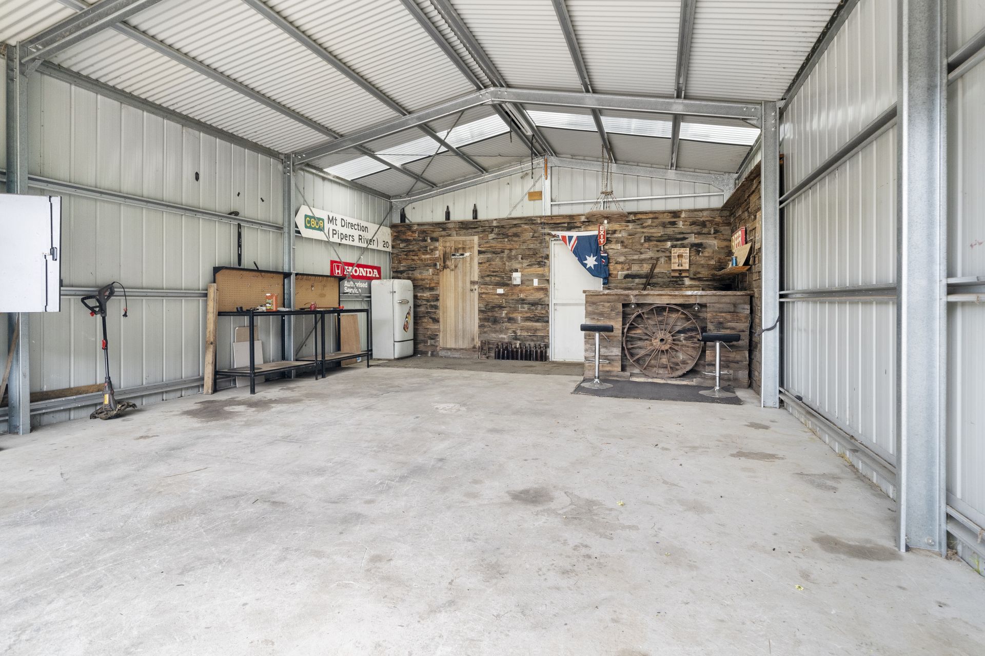 Various outbuildings on the property include a double garage with an automatic door, an original pickers hut, and a hay shed. These outbuildings can serve a variety of purposes, such as storage or workspace.