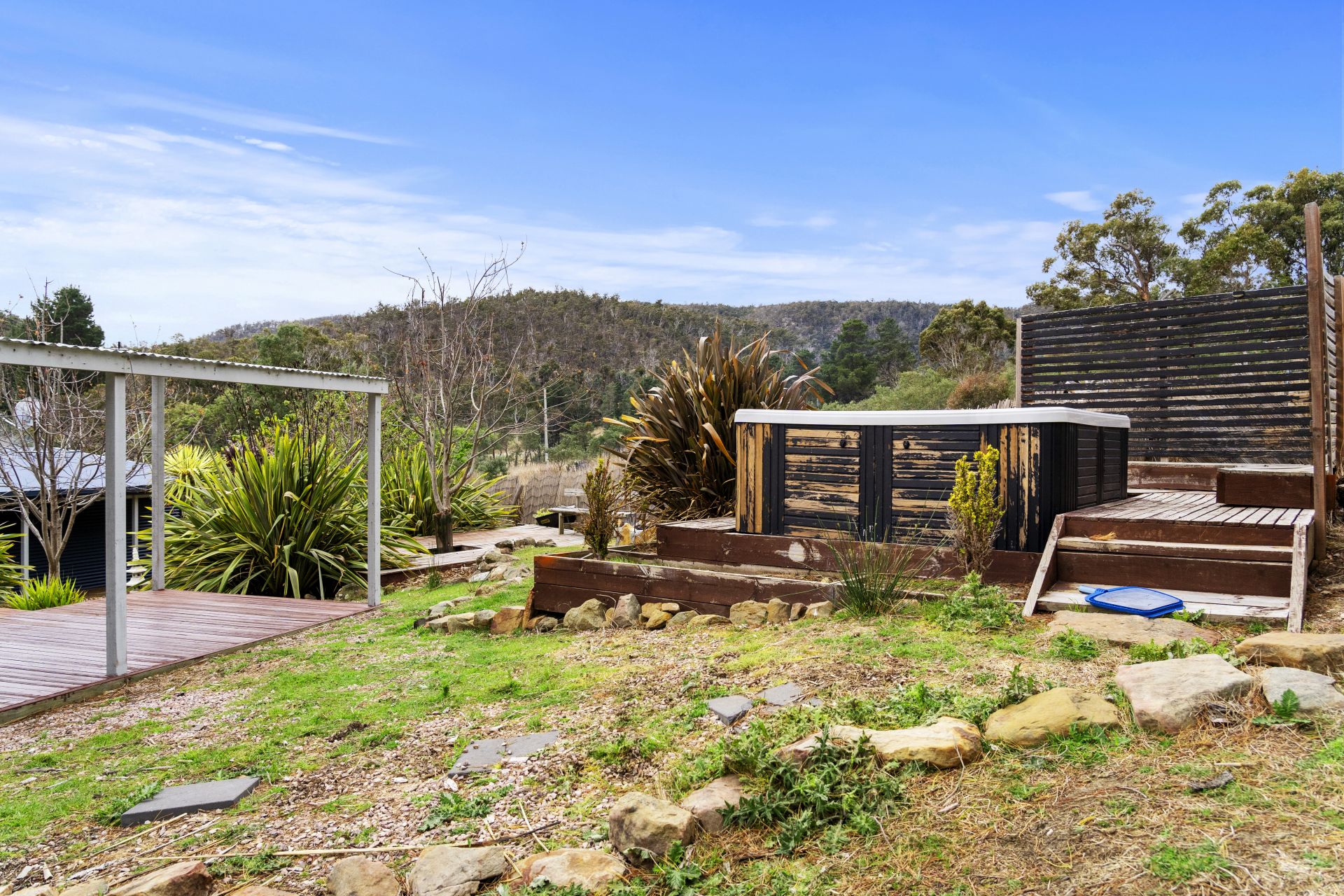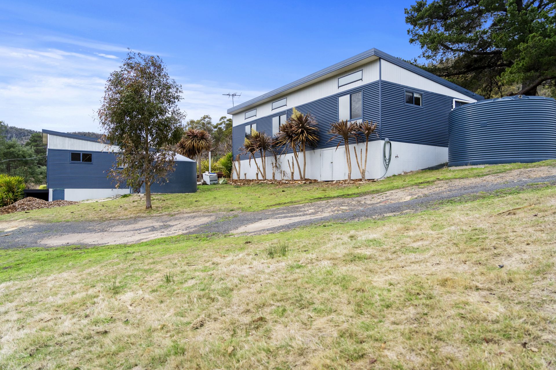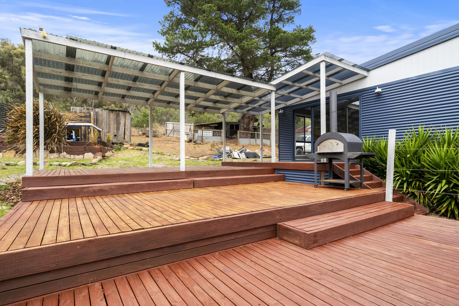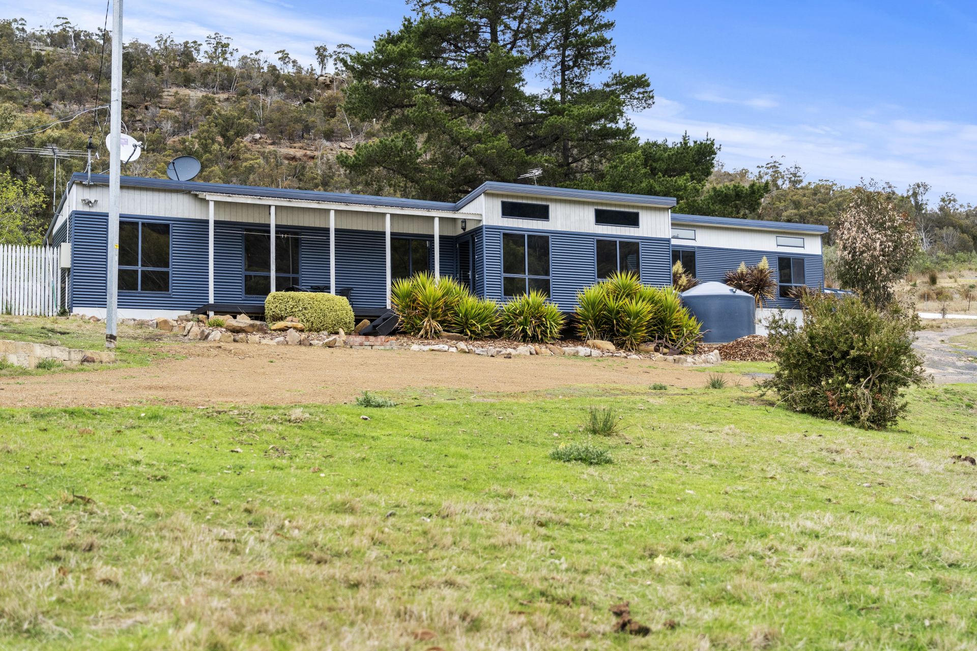Various outbuildings on the property include a double garage with an automatic door, an original pickers hut, and a hay shed. These outbuildings can serve a variety of purposes, such as storage or workspace.
