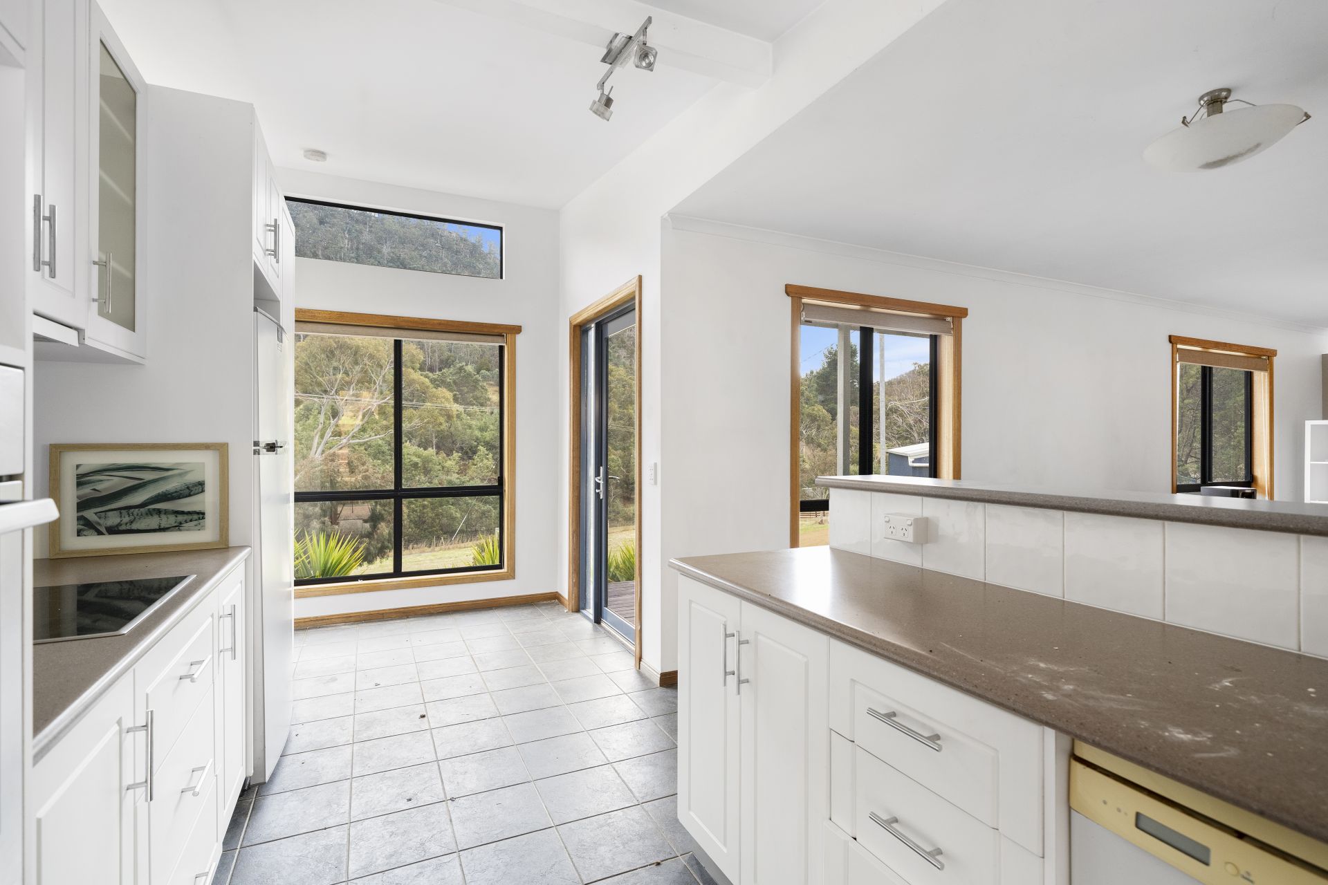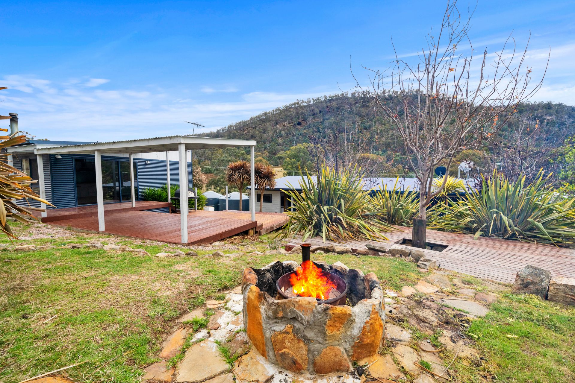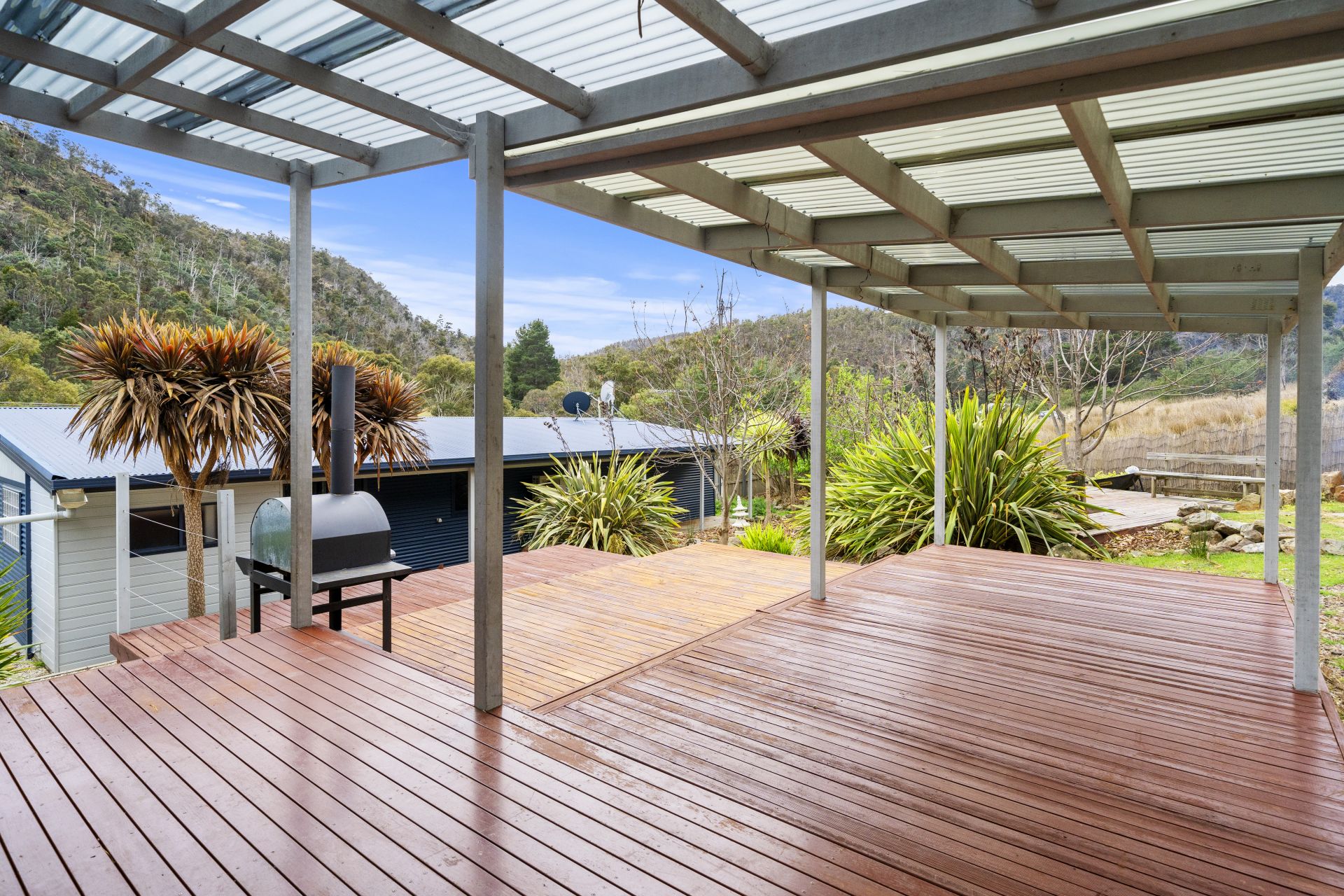 The home has raked ceilings with high-lite windows, allowing for ample natural light and a view of the unique surroundings. The two living areas are connected with an expansive, private, and sheltered deck.