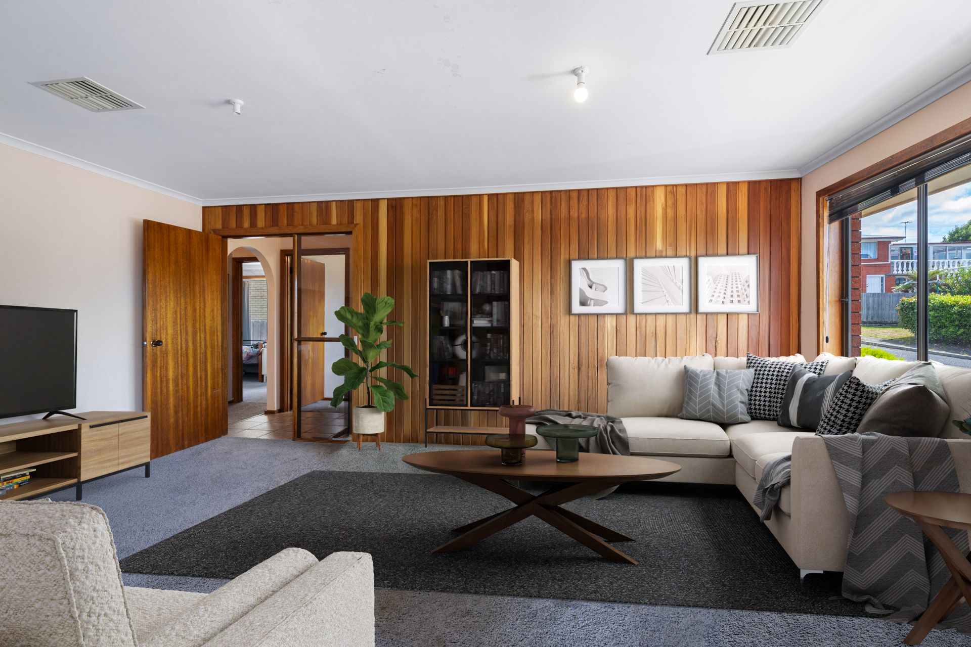 The light-filled living areas flow seamlessly through to a functional kitchen and dining space, while the main bathroom includes a full-sized bath and a separate toilet for added convenience.