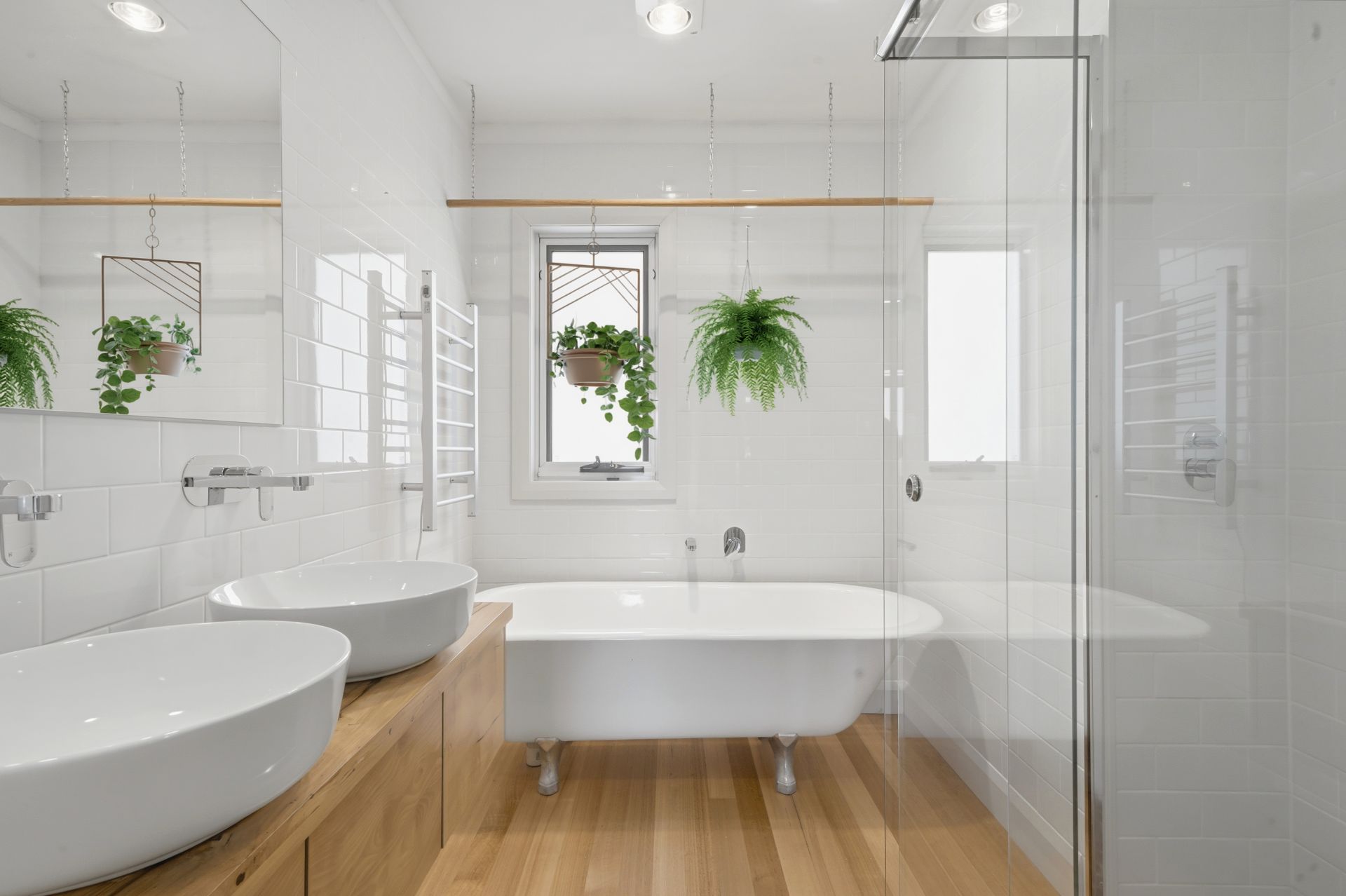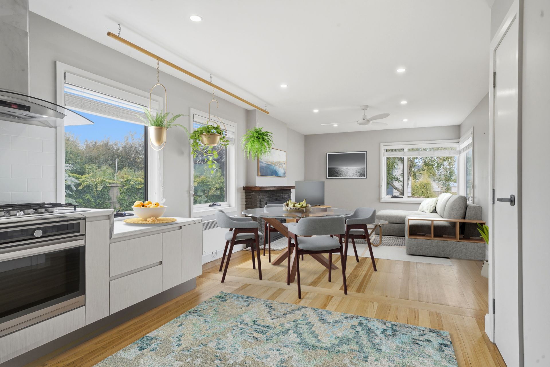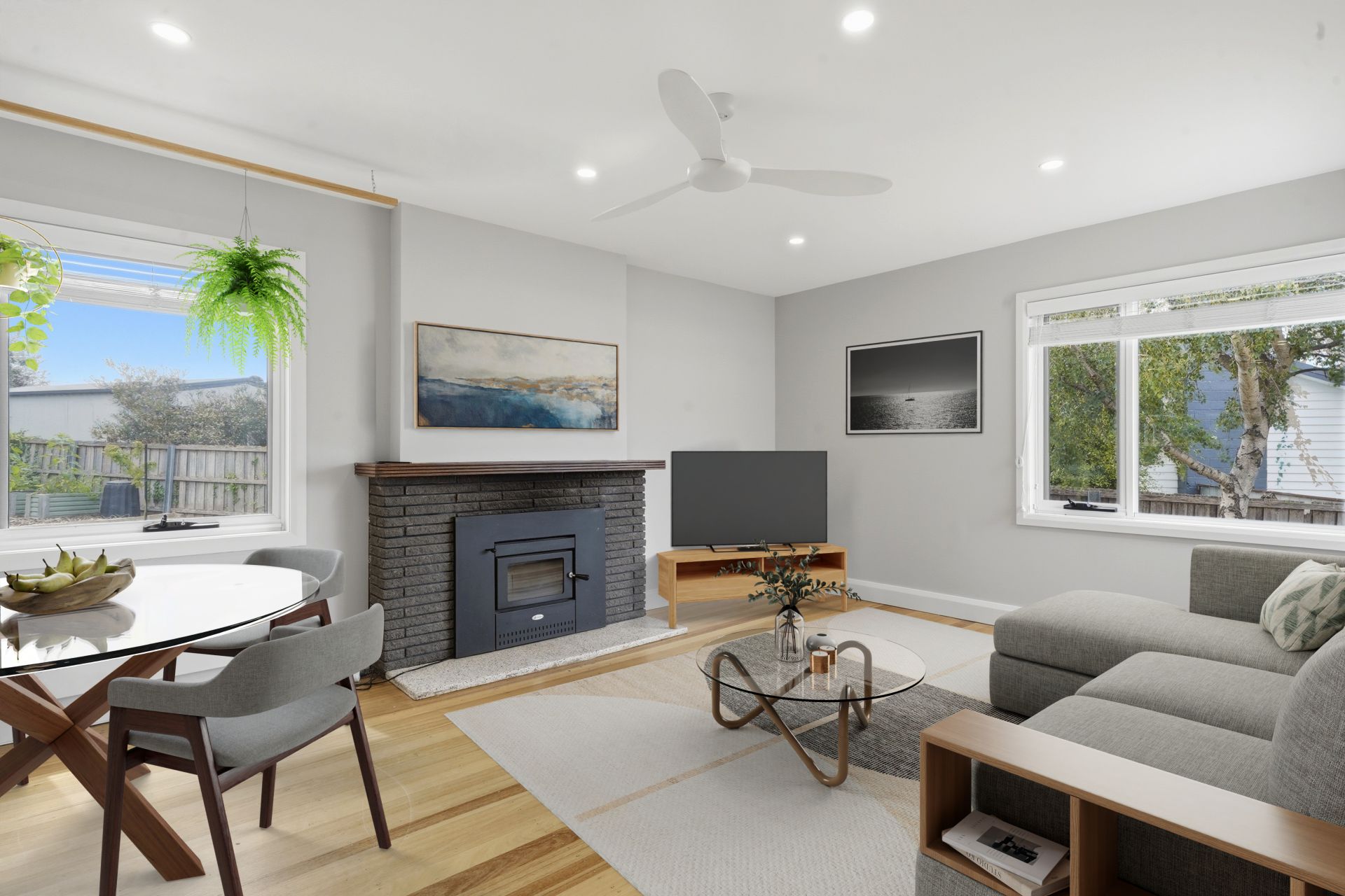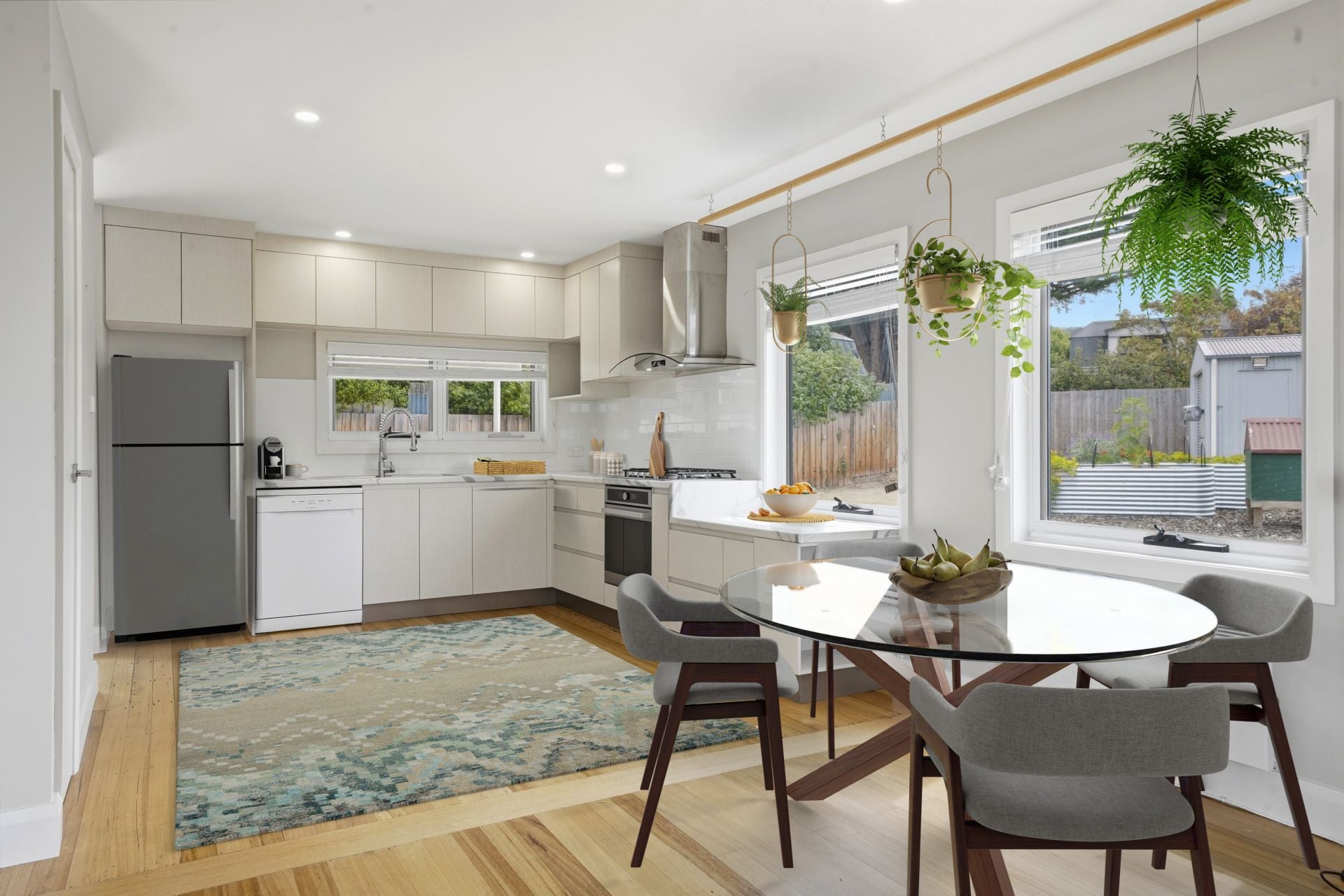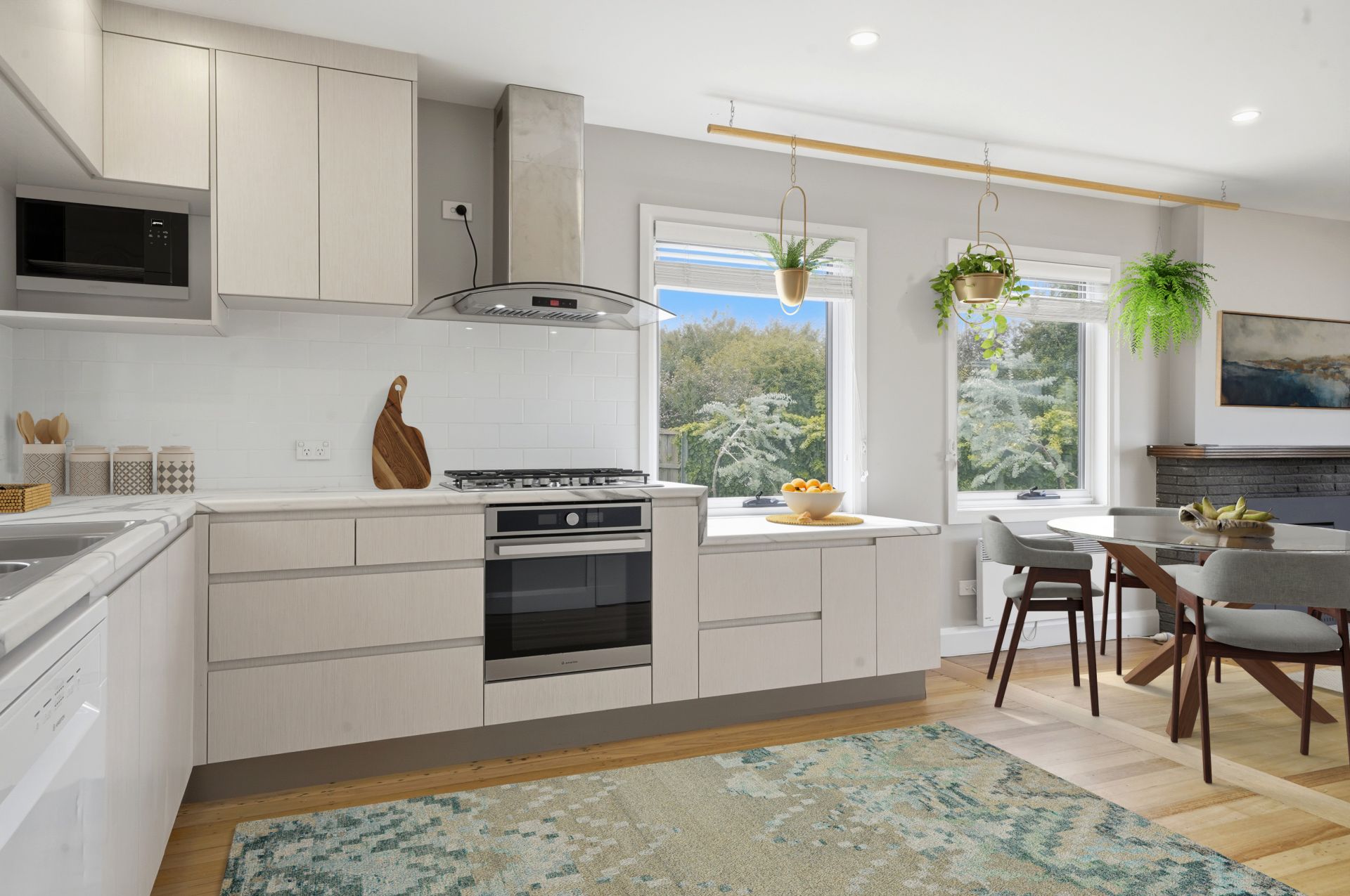 Inside, the light-filled living, dining and kitchen area showcases refinished original timber floors, French doors and a cosy woodheater set into the original fireplace. The stylish kitchen features a gas cooktop, electric oven, double Franke sink, generous storage including pantry with quality spice rack. The bathroom is a standout, offering a clawfoot bath, 1200x900 shower with dual shower heads, heated towel rails and a custom Sassafras timber suspended vanity with twin basins.
