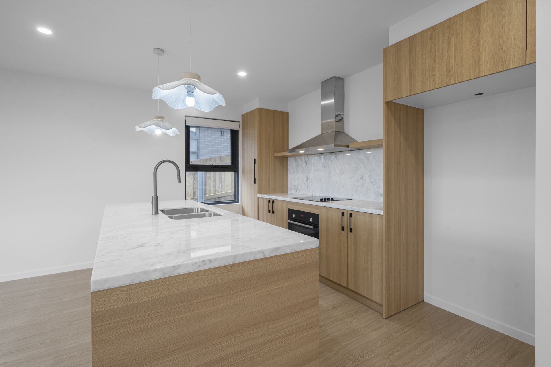 The kitchen is a standout, showcasing warm timber accents, elegant marble-inspired finishes, and premium appliances that blend functionality with flair.