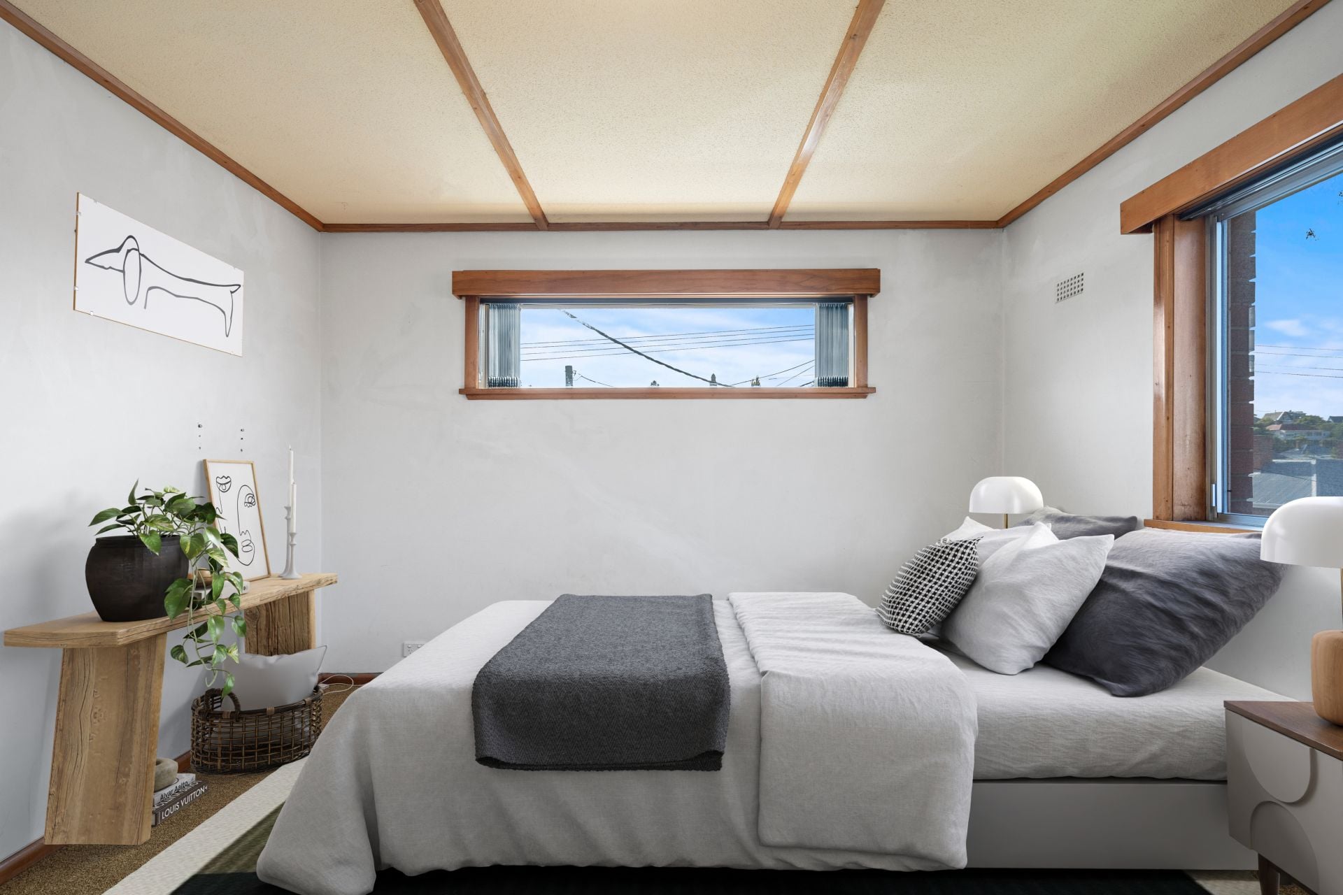 The bedroom is surprisingly spacious for a one-bedder, easily accommodating a queen bed with room to spare. It features built-in storage and big windows that catch the morning sun. The bathroom is functional and tidy, rounding out this low-fuss, high-comfort space.